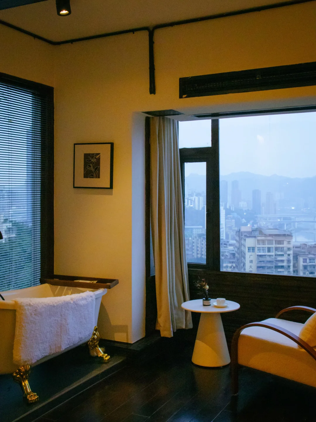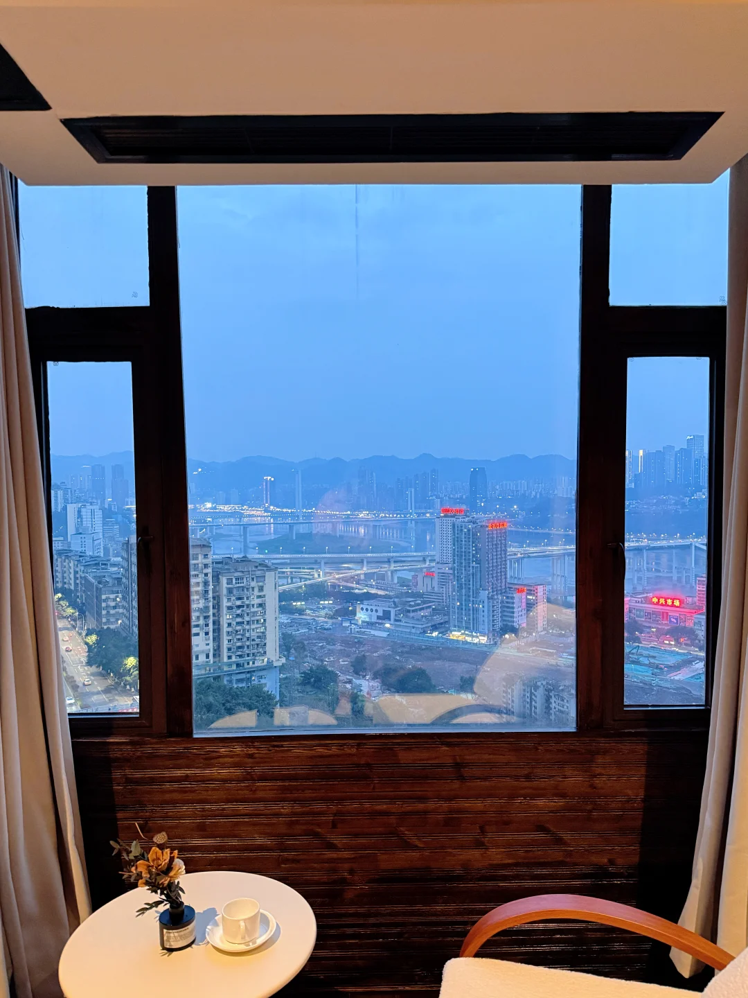 最绝的是江景房的夜景!🌃 窝在窗边,来福士、大剧院的灯光尽收眼底,嘉陵江晚风吹进来,看着山城万家灯火,真的会感动哭!😭