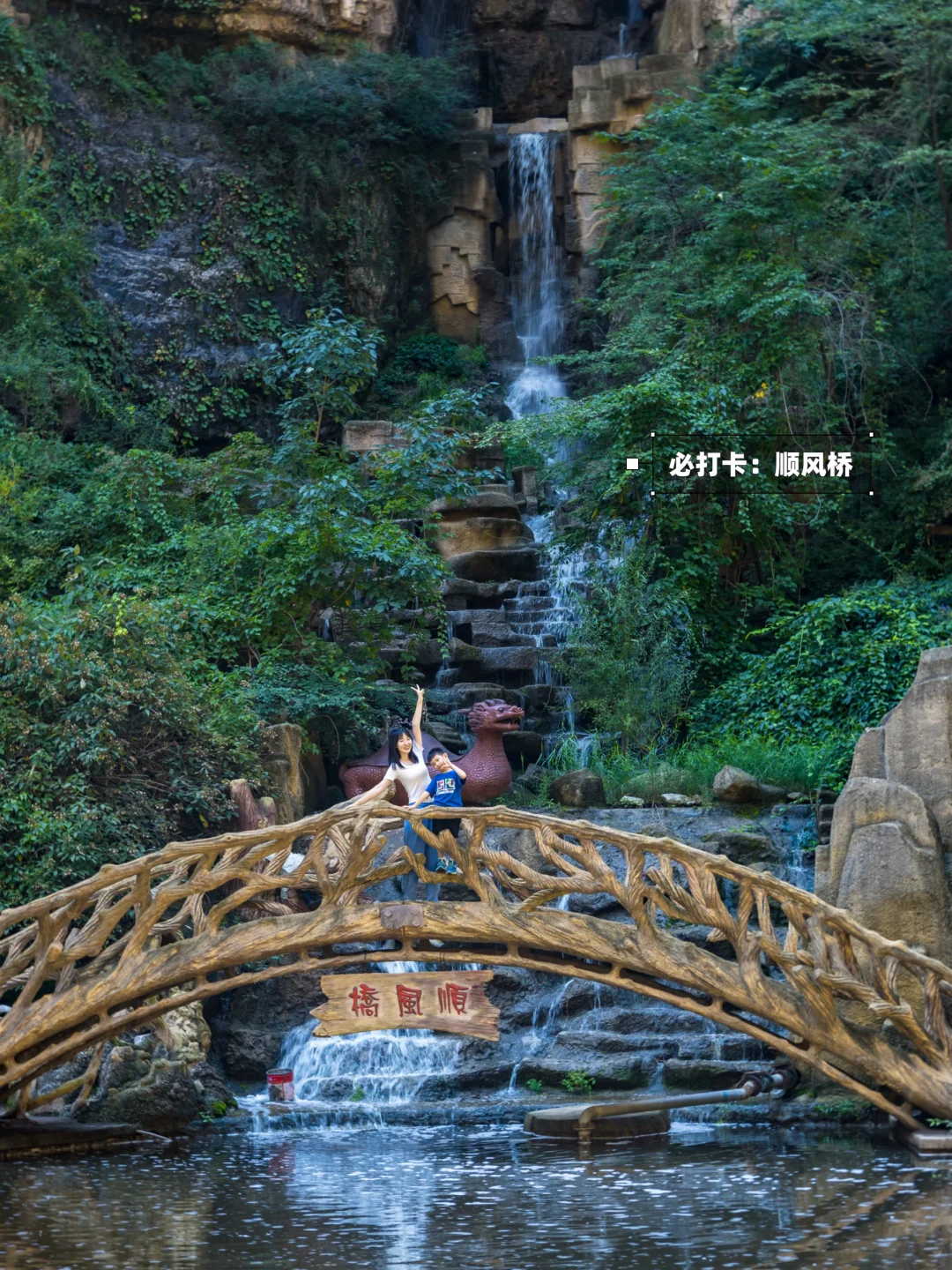 顺风桥+小瀑布,一汪潭水倒映群山,意境感直接拉满