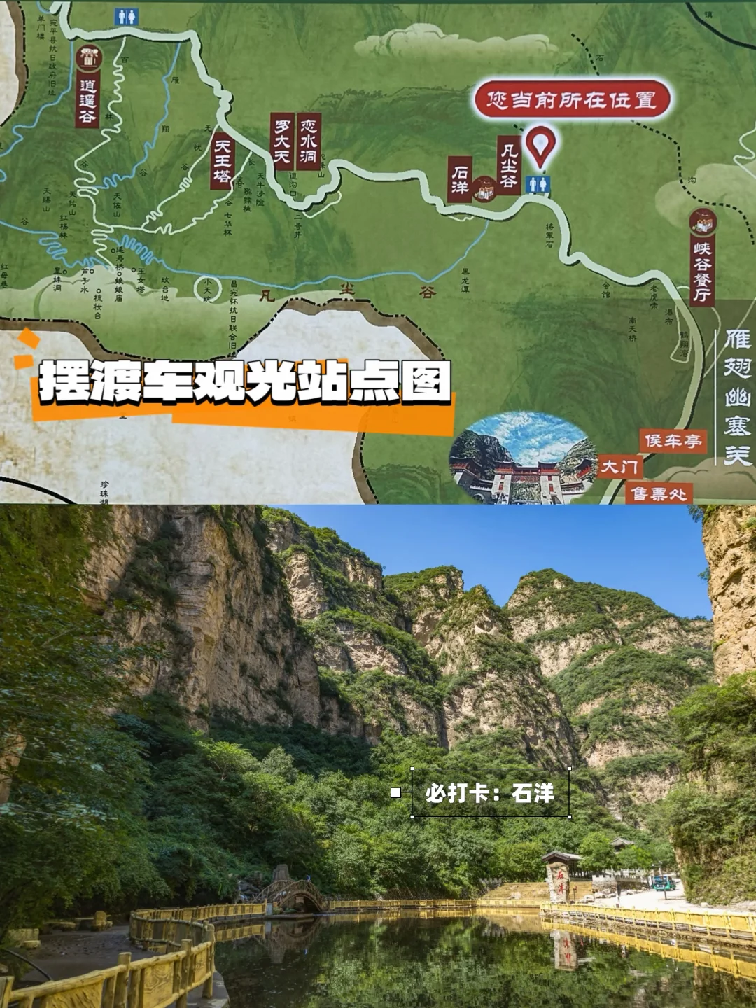 售票处(龙瀑)→峡谷餐厅(生活节市集/茶社)→凡尘谷(徒步/咖啡/飞拉达)→恋水洞→天王塔(来搭戏舞台)→逍遥谷(明长城)