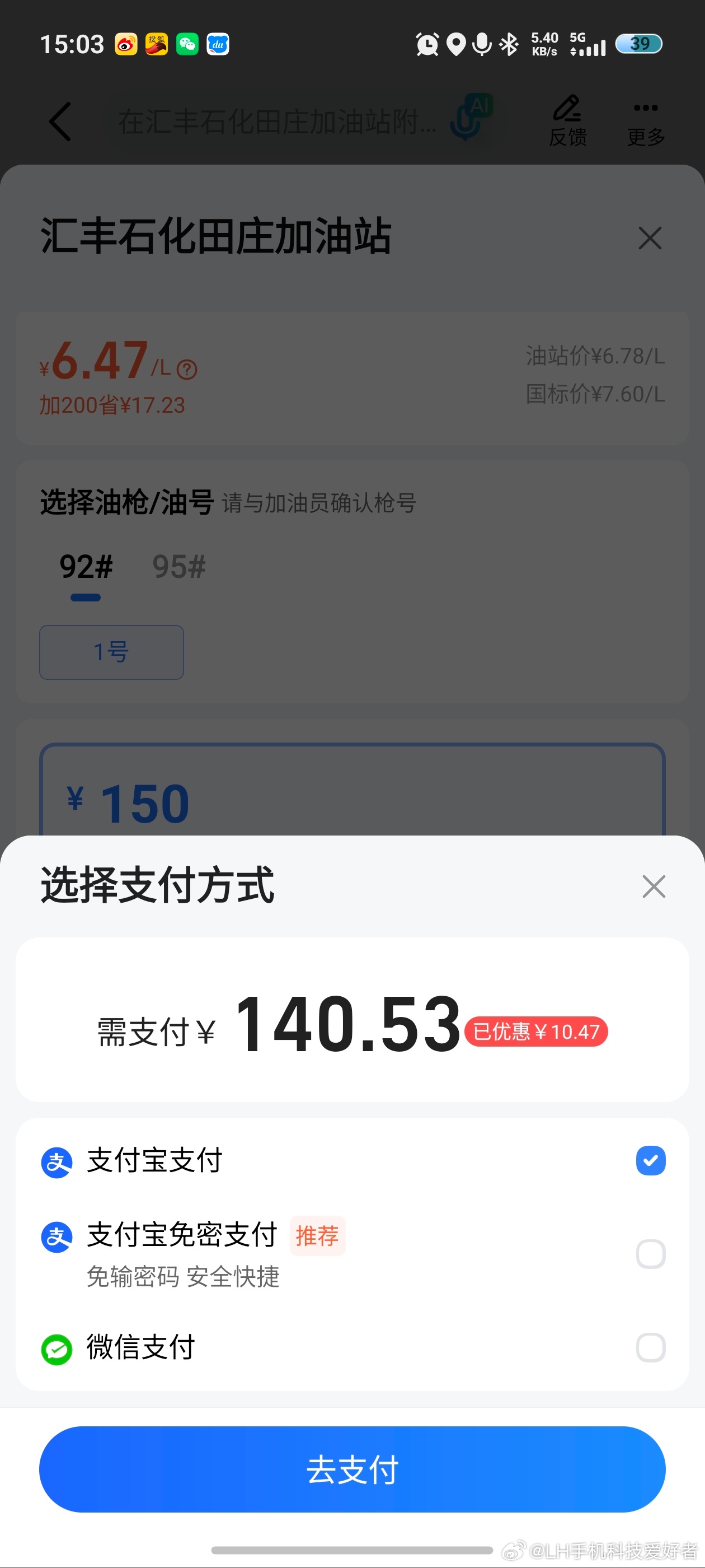 用高德加油优惠后6.47元/升,加了150元实际支付140.5元。燃油里程从192km提升至679km,够用一段时间了。