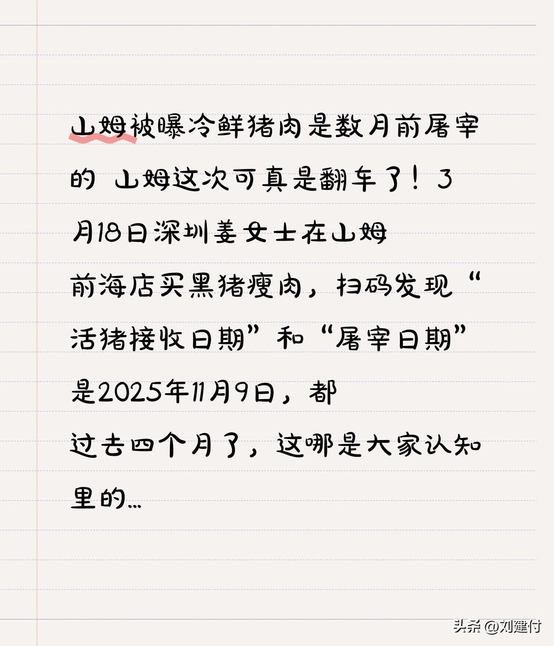山姆被曝冷鲜猪肉是数月前屠宰的 山姆被曝冷鲜猪肉是数月前屠宰的,这次可彻底翻车了!3月18日,深圳姜女士在山姆前海店购买黑猪瘦肉,扫码后发现“活猪接收日期”和“屠宰日期”为2025年11月9日,已过去四个月,这哪能算大家认知中的“鲜猪肉”? 工作人员起初称冷鲜肉有120天保质期,被追问后又表示是溯源码没更新。更离谱的是,第二天溯源信息直接消失了。 山姆的黑猪瘦肉价格可不低,如此做法实在不地道。食品安全是底线,生鲜肉的屠宰日期等信息至关重要。山姆隐匿屠宰日期、模糊概念,操作敷衍,严重透支消费者信任,希望其好好整改。