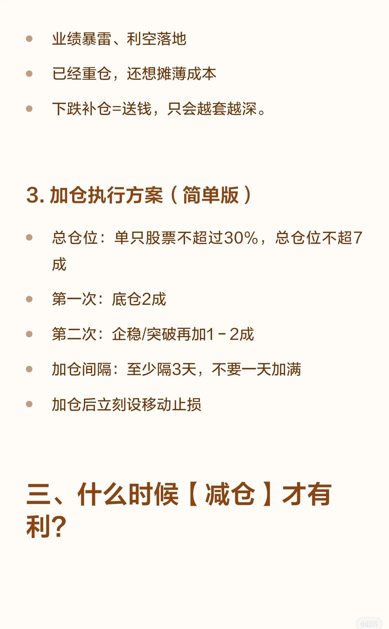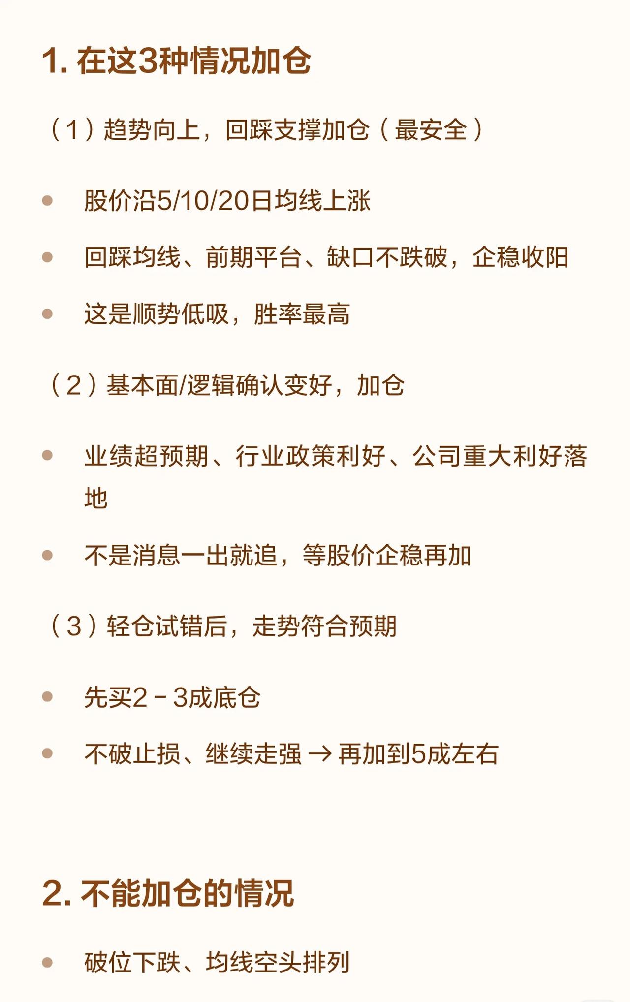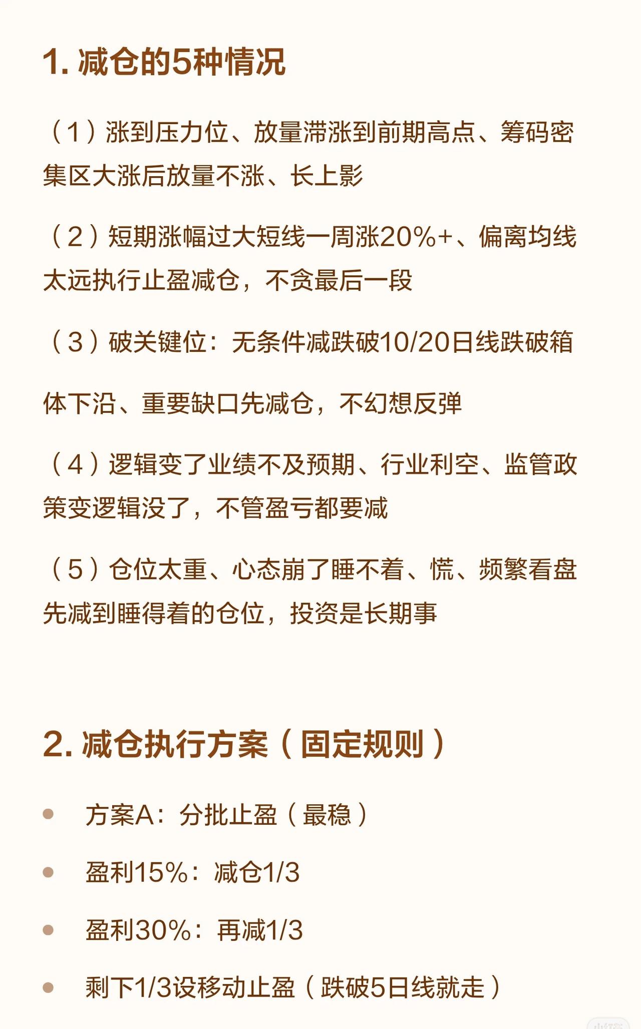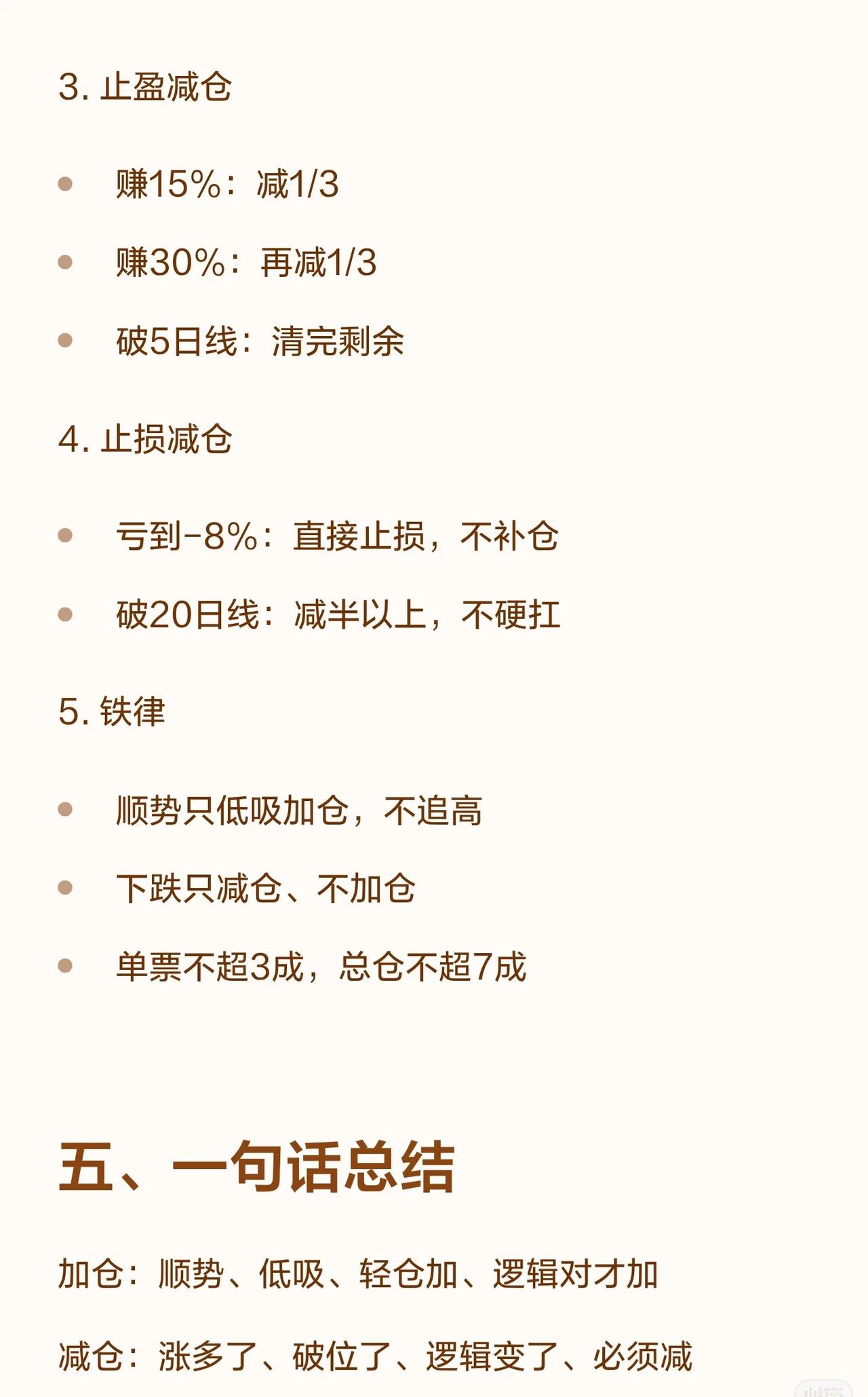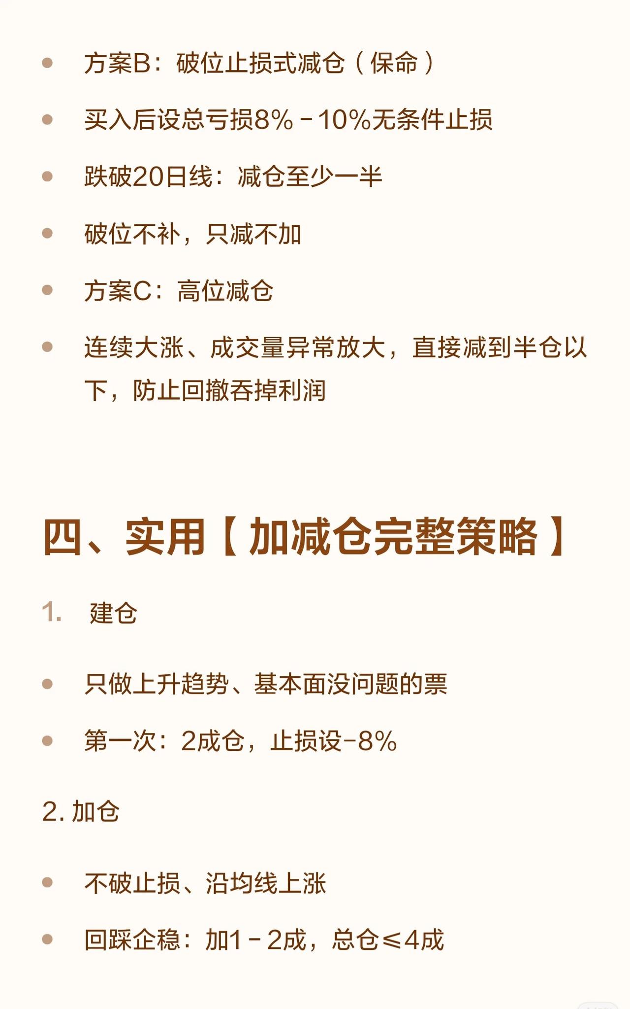 这是一个典型的“趋势+基本面”结合的交易系统,强调顺势而为、控制仓位和风险,通过分批操作来锁定利润和避免深套。 * 加仓 (Buy More): 只在 趋势正确、逻辑成立、位置合适 时加仓。 * 减仓 (Sell Some): 在 涨多了、逻辑变了、风险大了 时减仓。 * 铁律: 绝不追高加仓、下跌死扛、越跌越补、回本就卖。 二、 何时加仓 (3种情况) 1. 顺势低吸: 股价沿均线上涨,回踩支撑位(如均线、平台、缺口)企稳时,胜率最高。 2. 基本面利好: 业绩超预期、政策利好等,但需等待消息落地后股价企稳再动,不追高。 3. 轻仓试错成功: 先建2-3成底仓,不破止损且走势符合预期,再加至5成左右。 三、 何时减仓 (5种情况) 1. 涨到压力位: 放量滞涨、冲高回落、到前期高点或筹码密集区。 2. 短期涨幅过大: 一周涨超20%,偏离均线太远,不贪最后一段。 3. 跌破关键技术位: 如10/20日线、箱体下沿、重要缺口,无条件减仓。 4. 基本面/逻辑变了: 业绩不及预期、行业利空等,无论盈亏都要减。 5. 仓位太重心态崩: 为了投资长期化,减到能睡得着的状态。 四、 执行方案与铁律 * 仓位控制: * 单只股票 ≤ 30% * 总仓位 ≤ 70% * 建仓: 2成底仓,设-8%止损。 * 加仓: 回踩企稳加1-2成,总仓≤4成。 * 加仓间隔: 至少隔3天,不一次加满。 * 止盈策略: * 盈利15% → 减仓1/3 * 盈利30% → 再减仓1/3 * 剩余1/3设移动止盈(如跌破5日线清仓)。 * 止损策略: * 总亏损达8%-10% → 无条件止损。 * 跌破20日线 → 减仓至少一半。 * 完整策略流程: 建仓(2成) → 加仓(不破止损、回踩企稳) → 止盈减仓(15%、30%) → 止损减仓(-8%、破20日线)。 五、 一句话总结 * 加仓: 顺势、低吸、轻仓加、逻辑对才加。 * 减仓: 涨多了、破位了、逻辑变了、必须减。