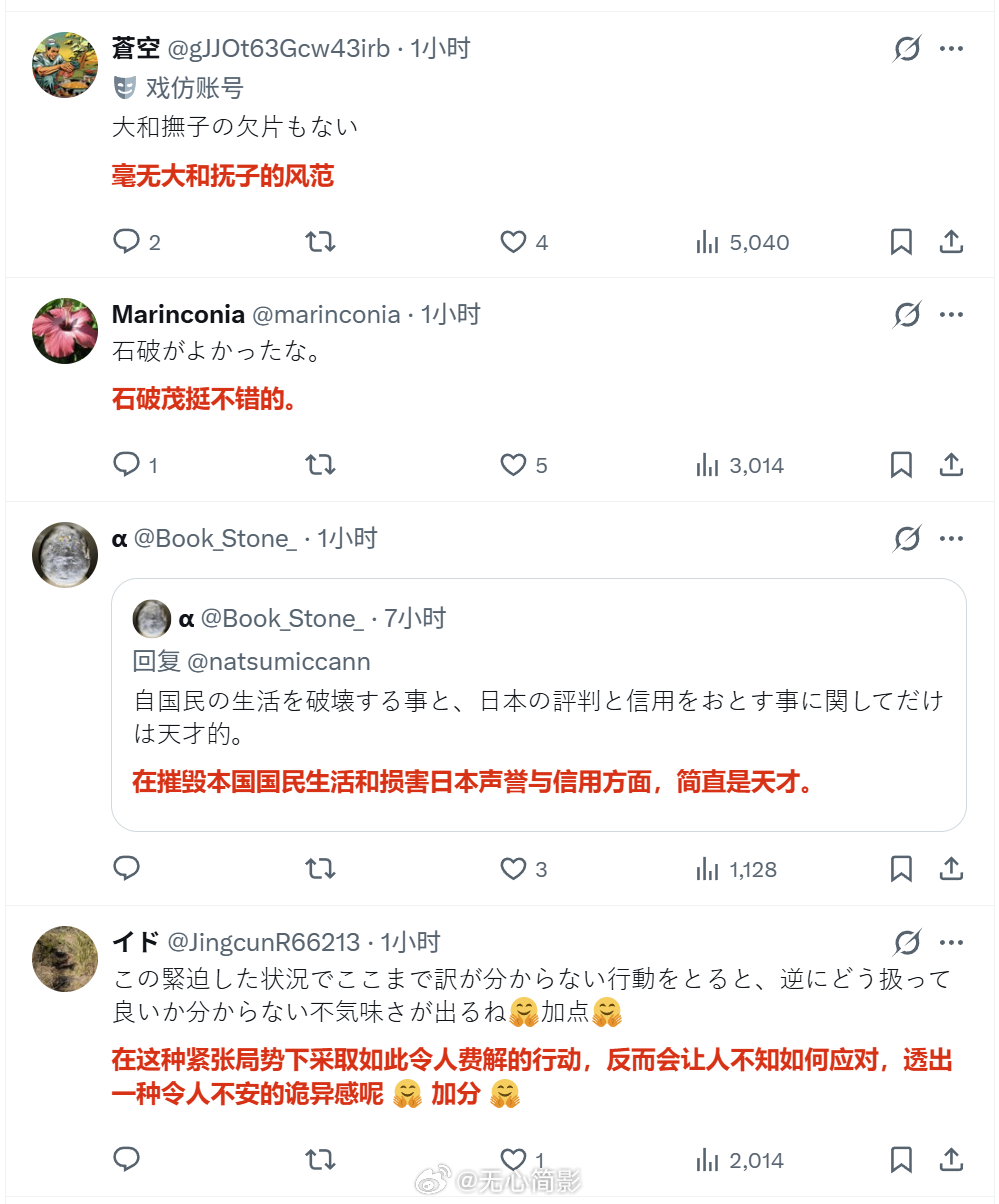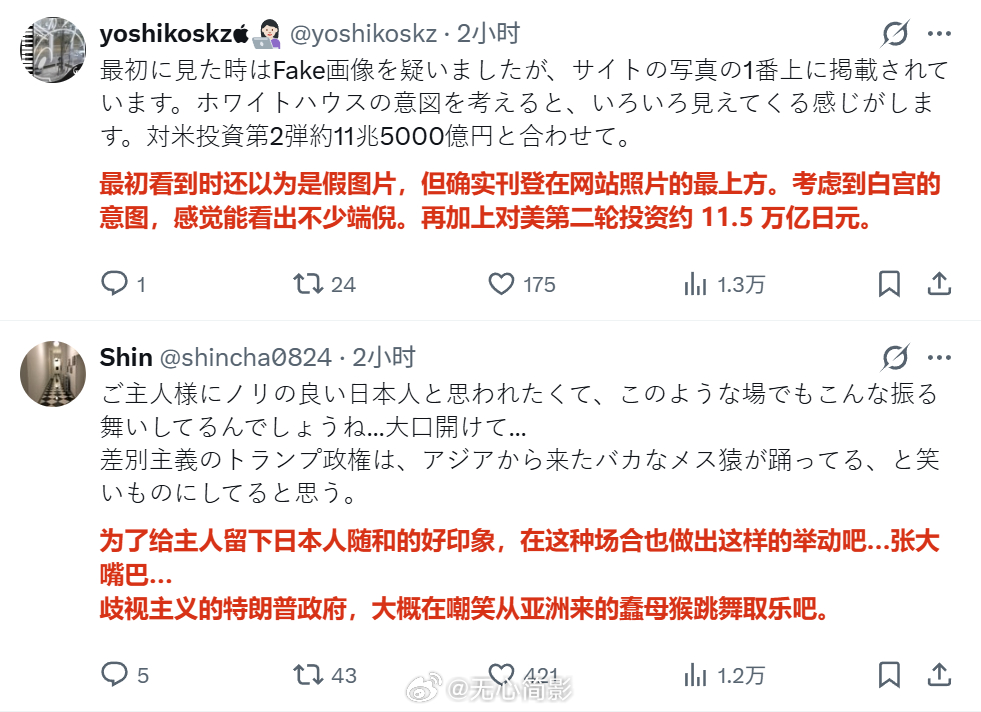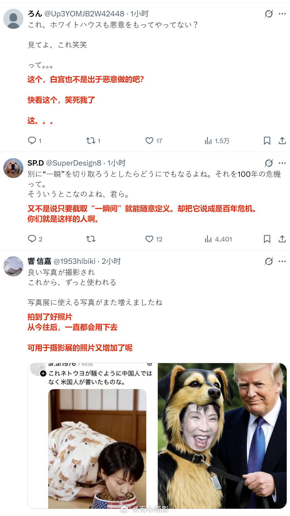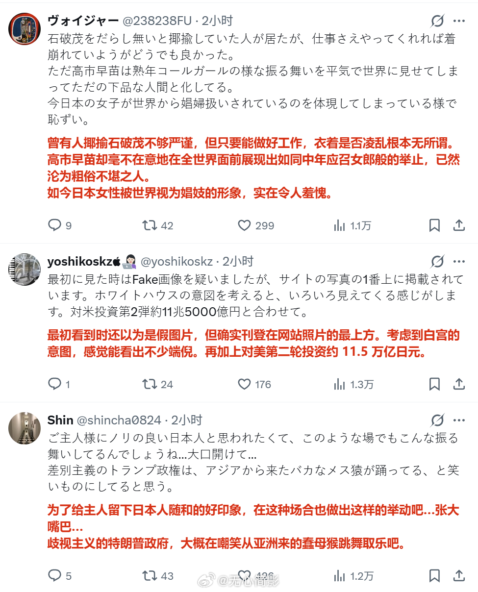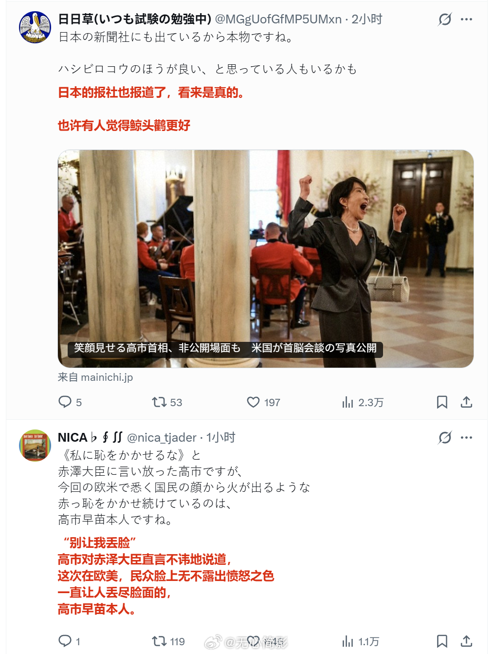 白宫发布这张“高市早苗在白宫欢呼”的照片后……高市早苗反对者们的反应:【曾有人揶揄石破茂不够严谨,但只要能做好工作,衣着是否凌乱根本无所谓。高市早苗却毫不在意地在全世界面前展现出如同中年应召女郎般的举止,已然沦为粗俗不堪之人。如今日本女性被世界视为娼妓的形象,实在令人羞愧。】【大概是为了想让‘主子’觉得她是个玩得开、懂配合的日本人,才会在这种场合也做出这种举动吧……还张着个大嘴……我觉得那种搞种族歧视的特朗普政府,只会把她看作是从亚洲来的、正在耍弄表演的蠢母猴子,把她当成笑柄而已。】【耻!今年的年度汉字就这个了】【石破茂挺不错的。】