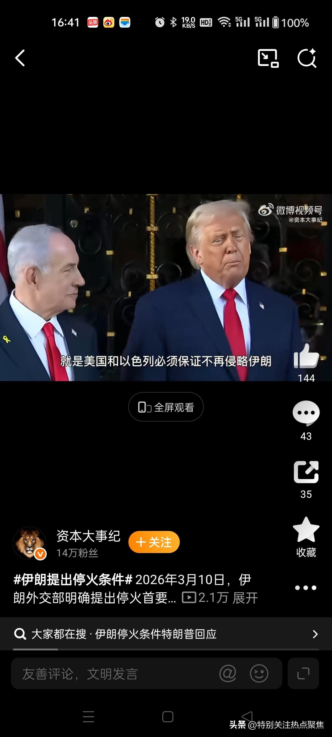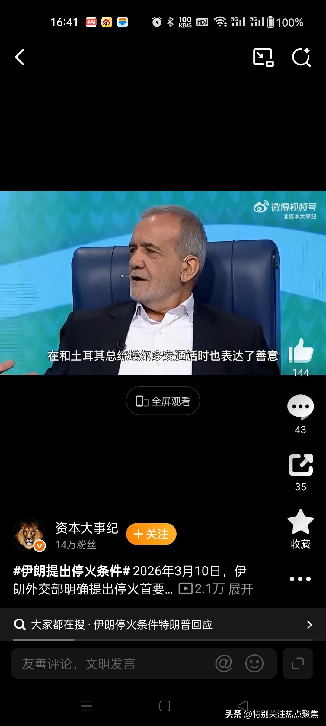 伊朗寻求全面永久的战争终结方案,美以书面保证不再发动侵略以及全额战争赔偿。 伊朗外长阿拉格齐近日明确回绝临时停火提议,强调伊朗所寻求的是全面、永久的战争终结方案,涵盖美以书面保证不再发动侵略以及全额战争赔偿。 伊朗的核心立场与诉求 拒绝临时停火,要求永久安全保障 伊朗外长阿拉格齐在3月20日至21日多次公开表示,强调伊朗不接受短期停火协议,认为这不过是美以的“喘息策略”。他提出结束战争的硬性条件:@环球网176 永久终止军事侵略:要求美以提供具有法律约束力的书面保证,确保未来不再对伊朗发动任何形式的攻击。 全额战争赔偿:赔偿伊朗在冲突中的损失,包括1300多名平民死亡、民用设施损毁及经济损失。若拒绝赔偿,伊朗将没收或摧毁对等价值的美以资产。@新华社 美军撤离波斯湾:作为安全保障的切实举措,革命卫队高层明确将此列为关键前提。30 历史教训与战略考量 伊朗此前两次接受停火均遭美以背弃:2025年6月停火后,美以持续进行军事施压;2026年2月28日更在谈判期间发动空袭,导致前最高领袖哈梅内伊遇害。阿拉格齐指出,临时停火只会让“战争—谈判—再战争”的循环重演,唯有彻底终结侵略逻辑才能打破困局。@新京报88新华社新京报 伊朗的军事底气与反制手段 非对称消耗战术:伊朗通过低成本无人机消耗美以高价拦截导弹(如“萨德”系统),并以高超音速导弹突破防空网。截至3月21日,伊朗已发动至少63轮反击,宣称摧毁美军80%战略雷达。@庚白星君110 霍尔木兹海峡杠杆作用:伊朗实施“敌友分级通行”,仅封锁美以及盟友船只,导致国际油价单周暴涨36%。此举分化美国盟友体系,德国、西班牙等国明确拒绝参与美军护航行动。@大皖新闻庚白星君 国际博弈与各方立场 美以陷入战略被动: 美国日均军耗达8.9亿美元,国内反战情绪高涨,特朗普顾问私下催促停战;119 以色列外长萨尔改称“不寻求无休止战争”,但坚持要求伊朗“政权更迭”。@参考消息112 调停努力与中国角色: 伊朗点名中国为可信调停方,认可其在沙伊复交中的成功经验。欧盟则明确拒绝军事介入,批评美以行动缺乏国际法依据。@王裕庆台湾...96111参考消息王裕庆台湾省 冲突前景与关键分歧 当前核心矛盾在于:伊朗视安全保障为生存底线,而美以视为霸权让步。若美以拒绝书面保证和赔偿,伊朗宣称已为长期战争做好准备,可维持高强度作战至少6个月。分析认为,3 - 6个月内可能在国际斡旋下达成临时停火,但永久和平需满足伊朗的核心条件。@黄鱼Veda109113 阿拉格齐在半岛电视台采访中直言:“我们寻求的并非暂停战火,而是让敌人永远不敢再发动袭击的终极和平。”@孤烟暮蝉82孤烟暮蝉