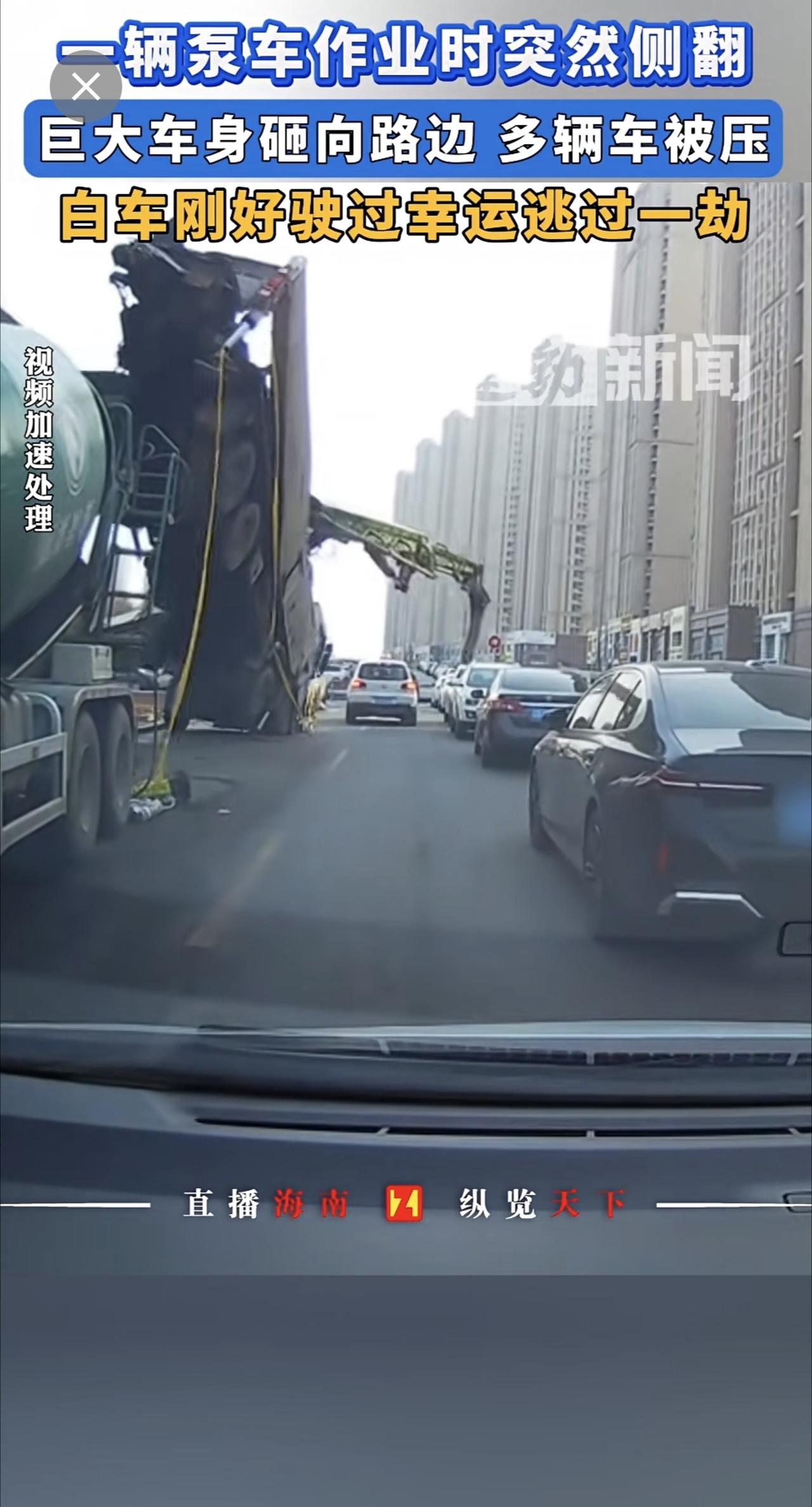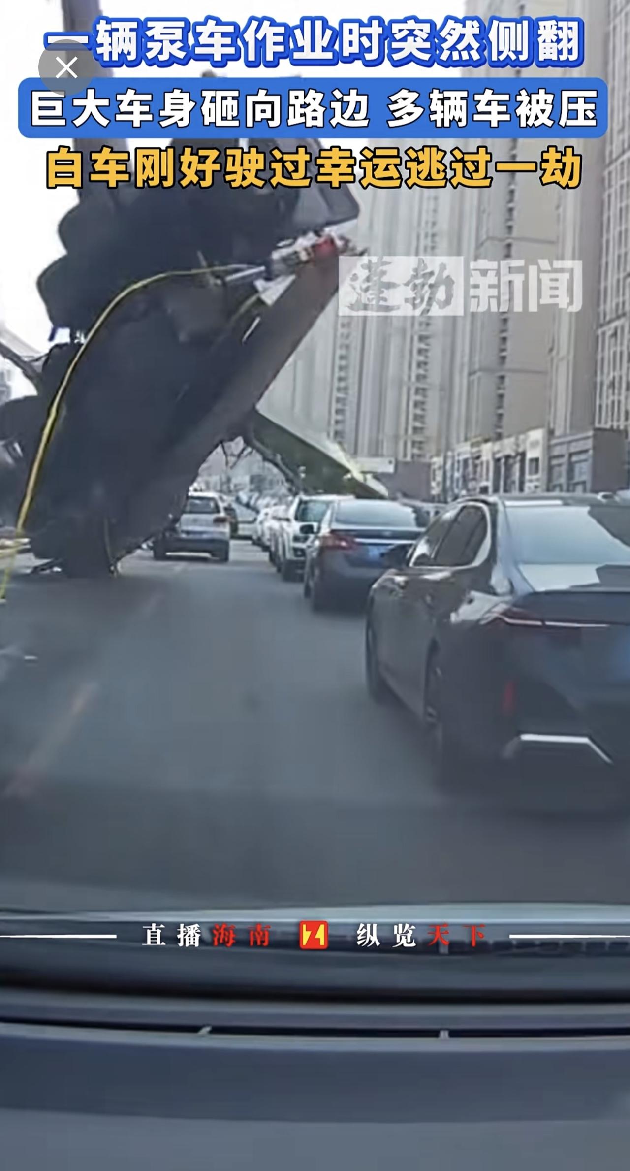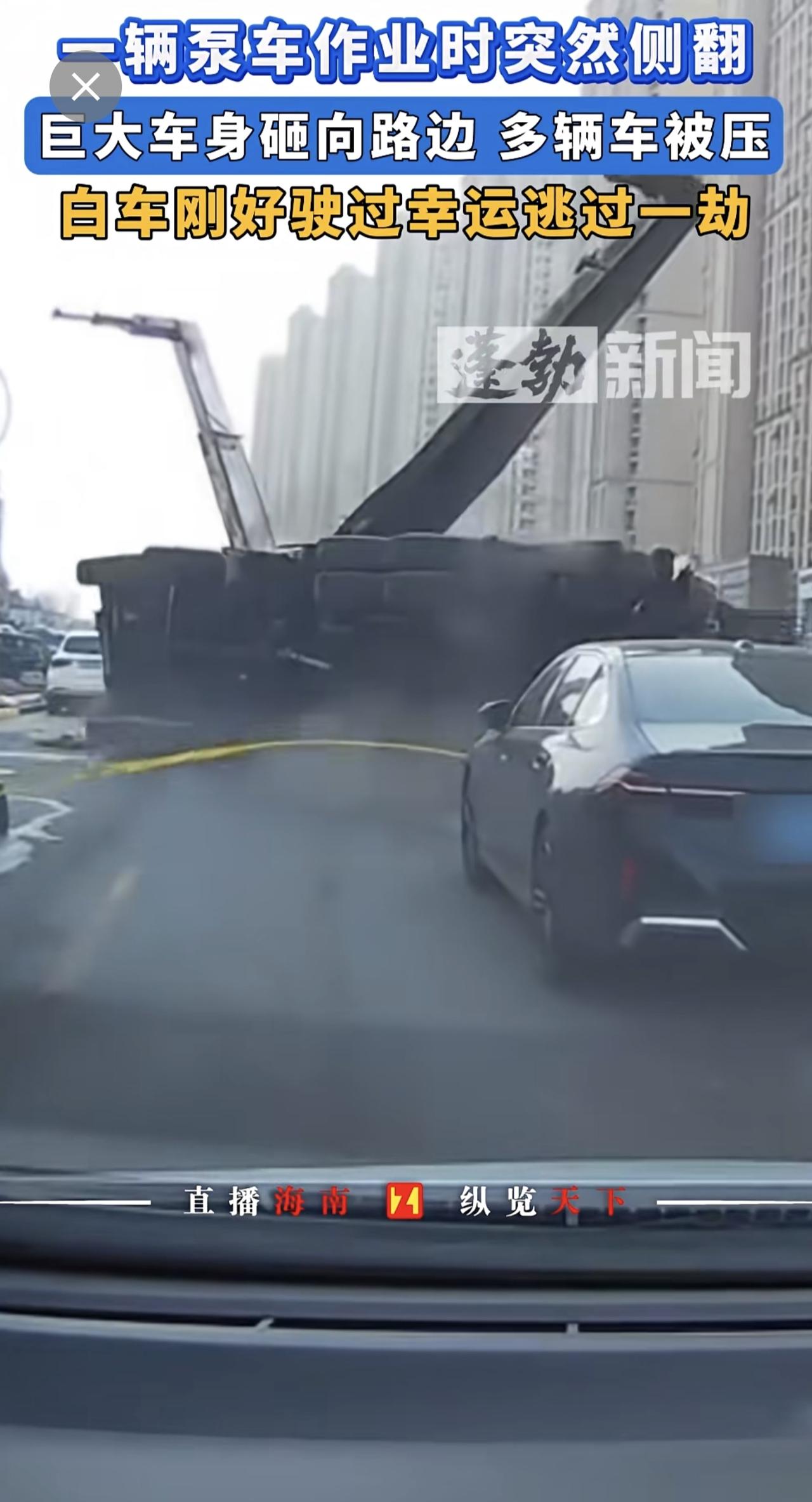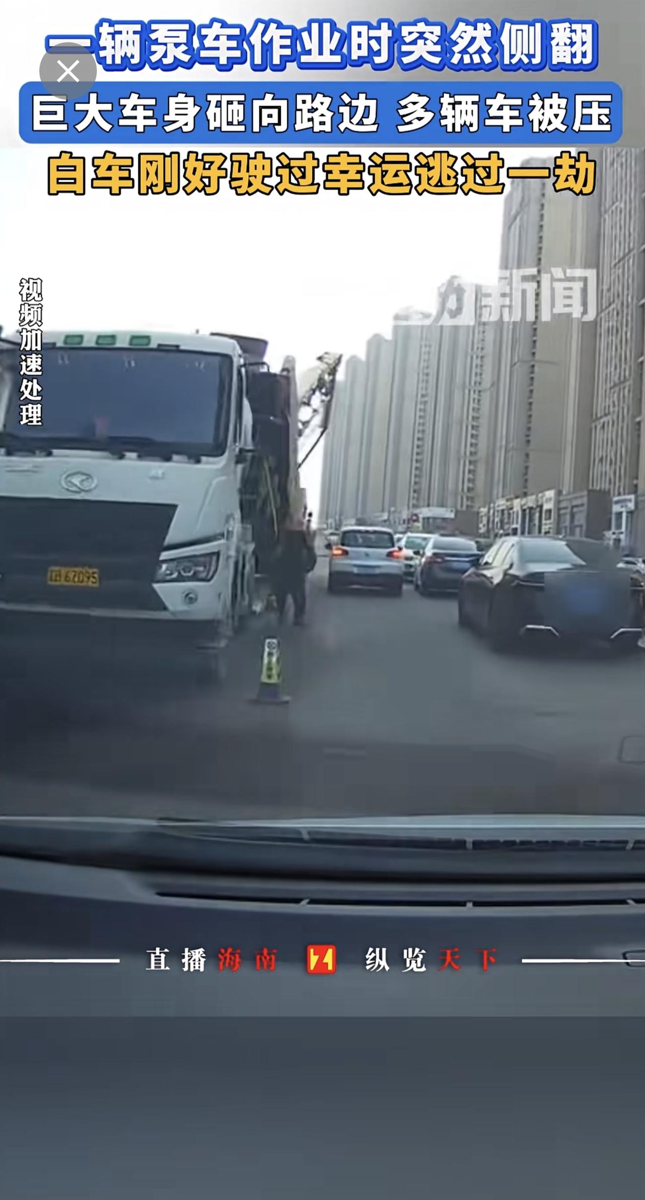 一辆泵车作业时突然侧翻,巨大车身砸向路边,多辆车被压,白车刚好驶过幸运逃过一劫!