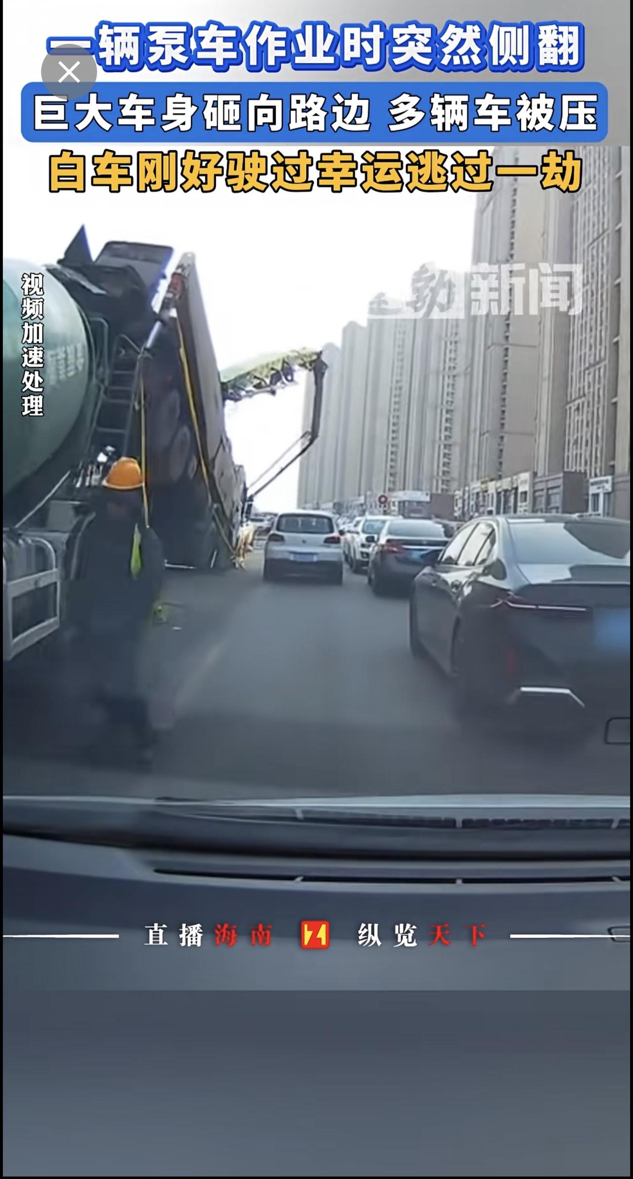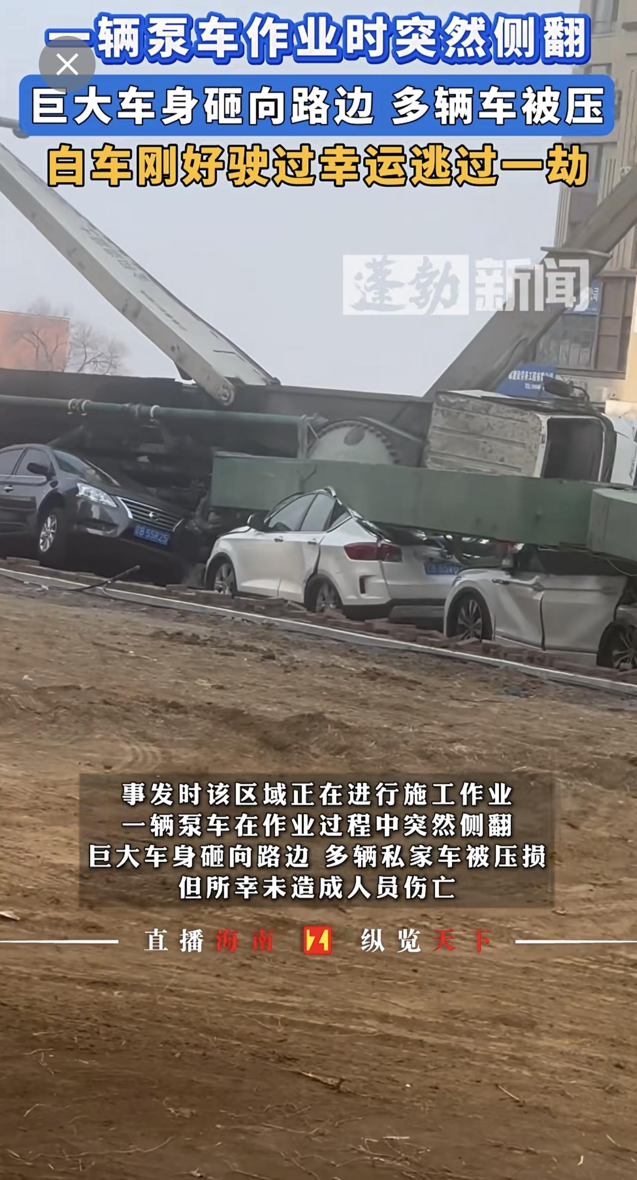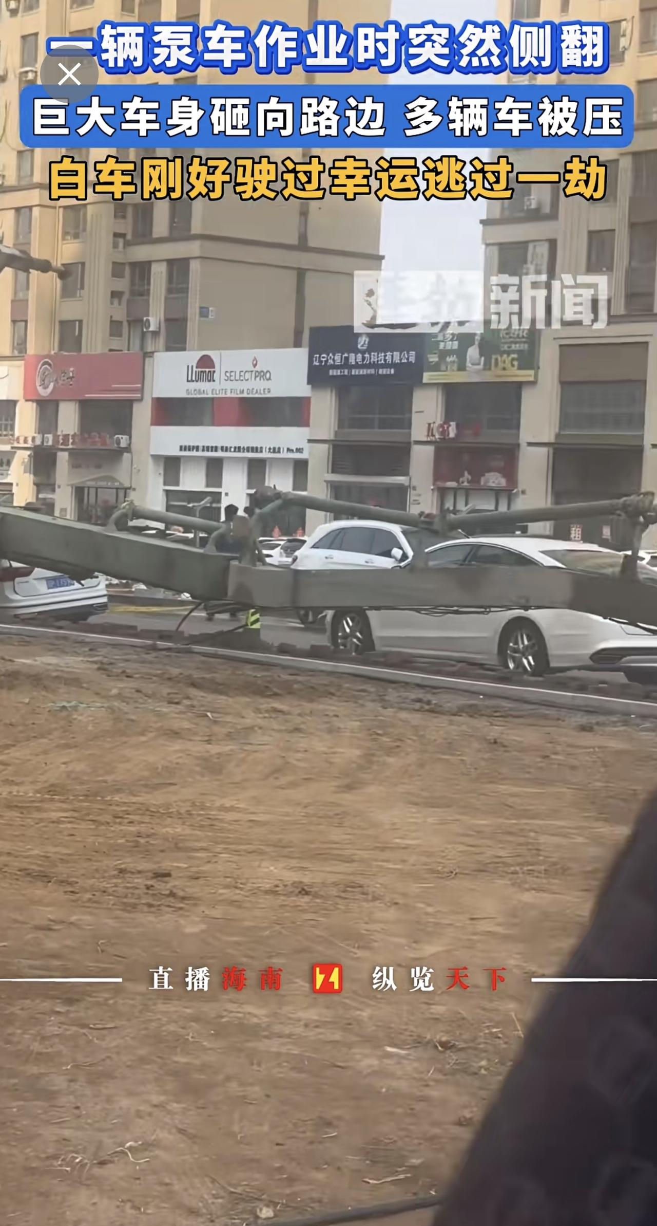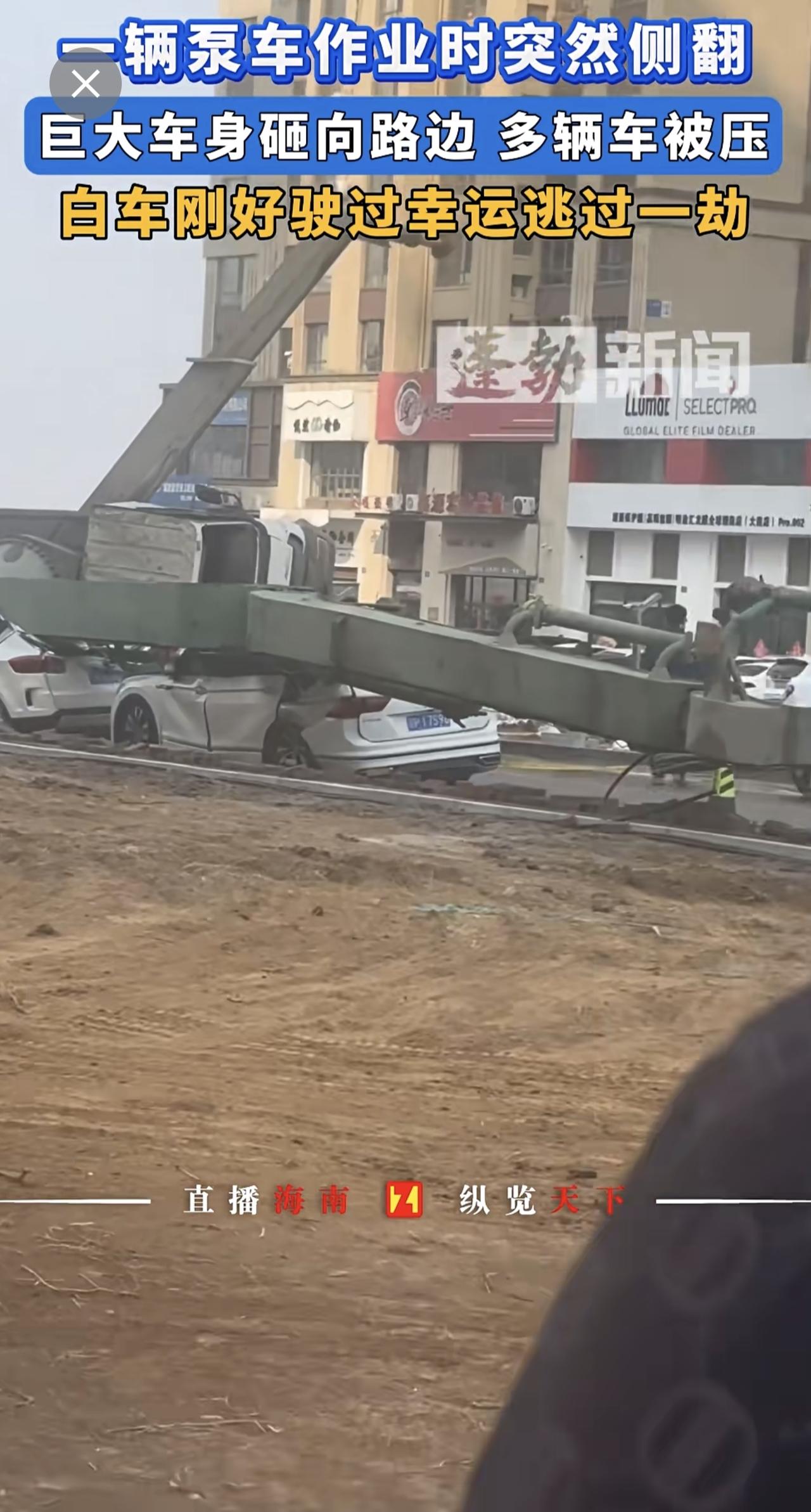 一辆泵车作业时突然侧翻,巨大车身砸向路边,多辆车被压,白车刚好驶过幸运逃过一劫!