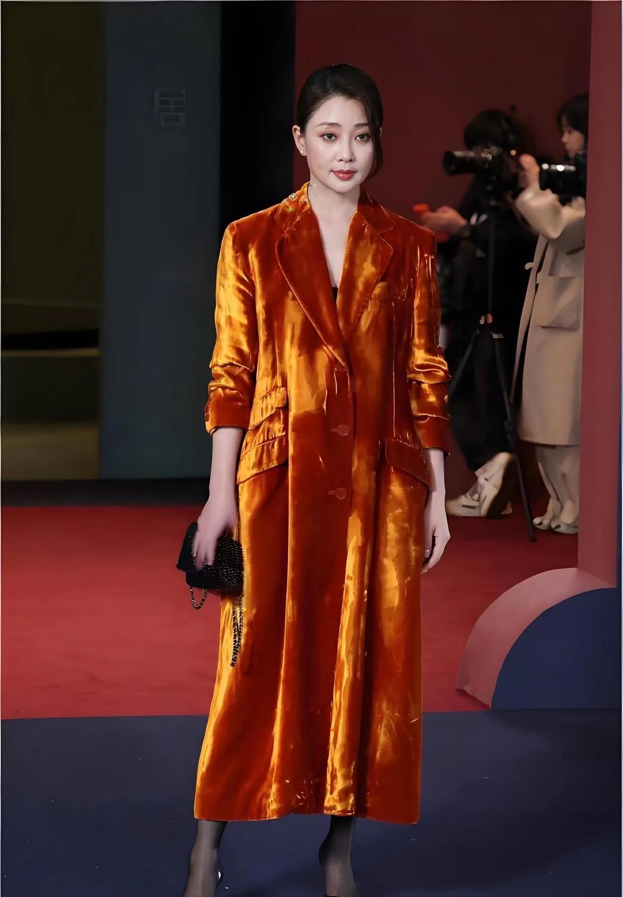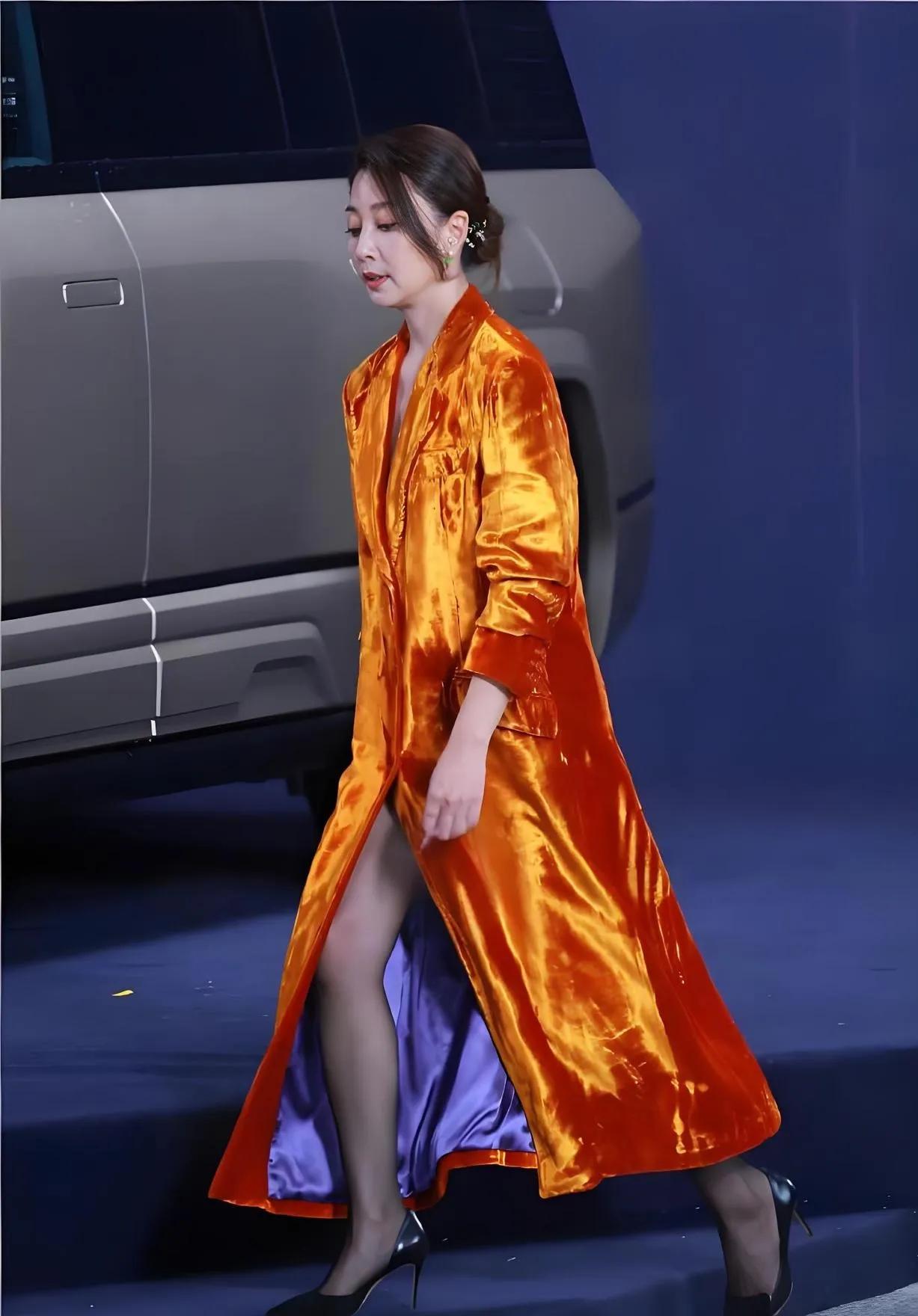 46岁殷桃状态也太好了吧!🧡 橘色丝绒大衣质感满满,自带贵气滤镜 内搭黑丝+尖