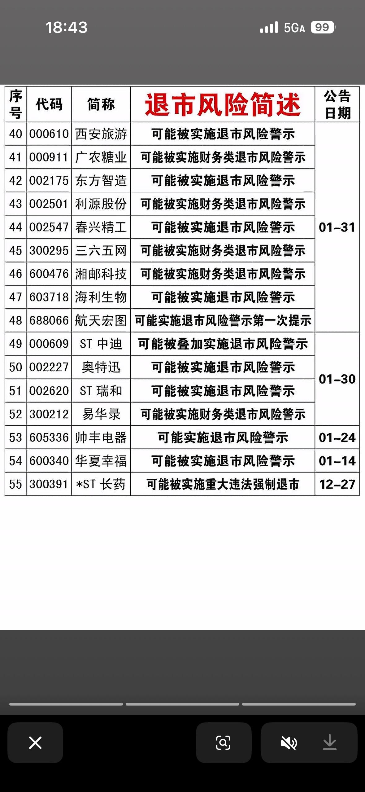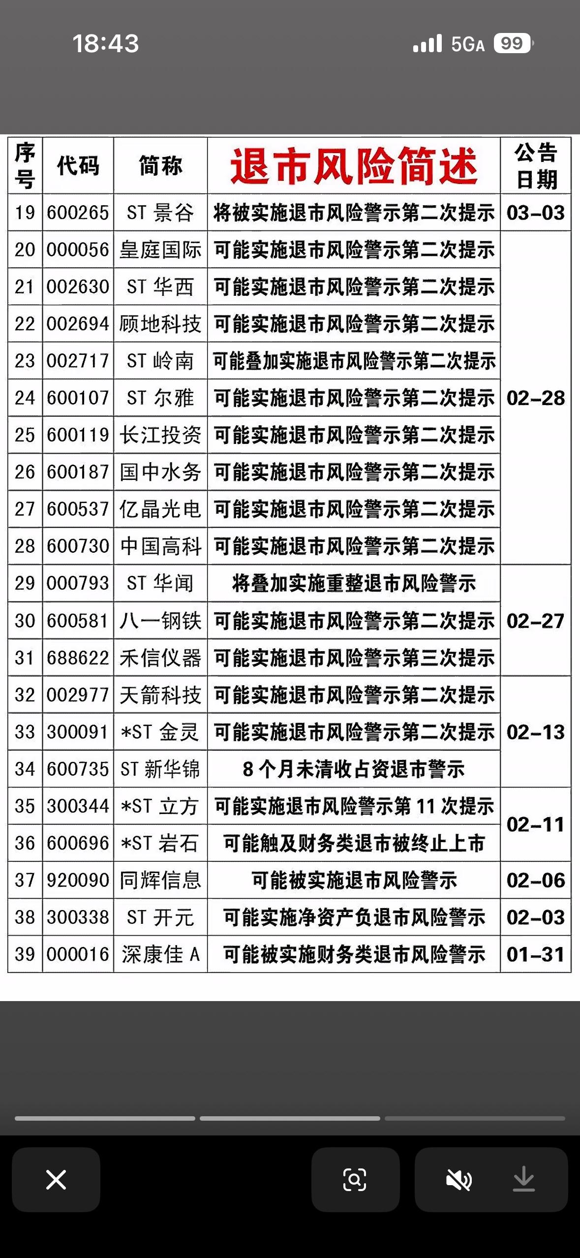 2026年3月21日有退市风险警示公司一览表 2026年3月的股市挺热闹,有不少ST股在申请摘帽。像ST阳光、ST仁东等都早早递交了申请,从条件看,2025年营收、净资产、审计等都达标,财务与内控整改也完成了。 不过,也得警惕有退市风险警示的公司。虽然参考信息里没提到具体的退市风险警示公司名单,但投资ST股本就风险高,波动大。就比如申请摘帽的这些公司,摘帽进度还得看交易所审核结果,存在审核不通过或延迟风险。投资这玩意儿,还是得谨慎再谨慎,不能只看表面,得深入研究公司的实际情况。