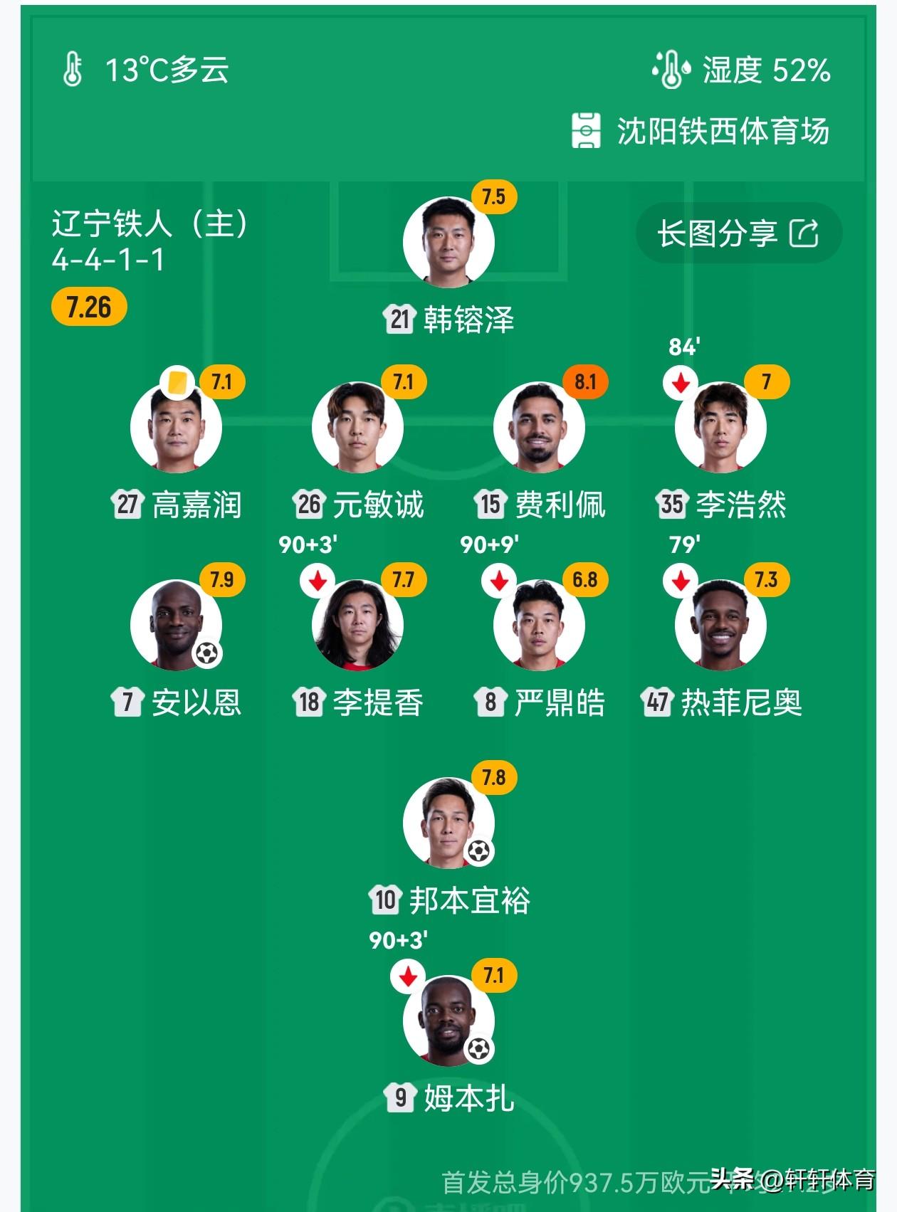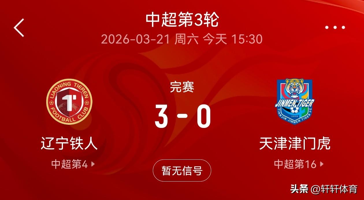千呼万唤始出来,今天是见证历史的时刻,辽宁铁人以3-0干净利落的战胜了天津津门虎,辽宁铁人在取得中超首胜的前提下送给天津津门虎三连败,算上今天的失败天津津门虎3轮比赛,一球未进,负9分积分垫底,辽宁铁人凭借本场比赛胜利排名上升到积分榜第4位,铁人进球队员上半场第23分钟,姆本扎打入辽宁铁人队史首粒中超进球,比赛第77分钟安以恩的进球将比分扩大到2-0,补时阶段邦本宜裕的点球帮助铁人最终以3-0锁定胜局。