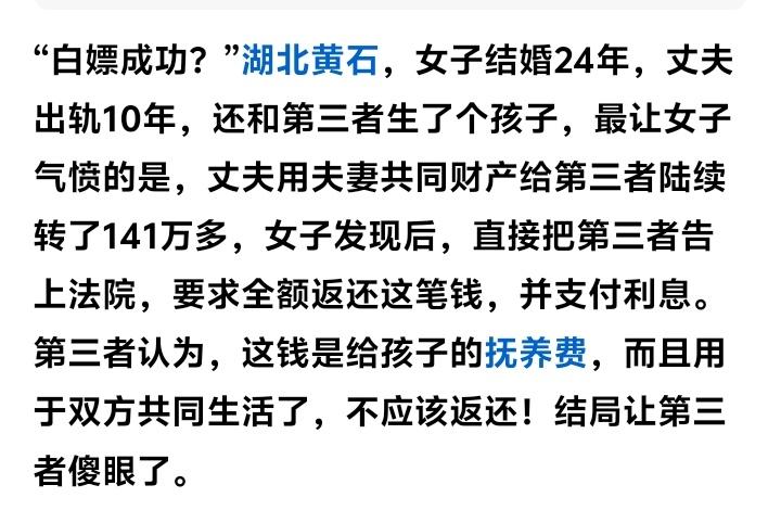 湖北黄石惊现“婚姻保卫战”:原配怒告第三者追回141万,法院判决亮了,全网拍手称快! 春风料峭的三月,湖北黄石一位妻子在整理丈夫手机时,意外揭开了长达十年的残酷真相。二十四年的婚姻堡垒,早已从内部被悄然蛀空。转账记录如同无声的证词,一笔笔指向丈夫与第三者徐某的隐秘世界,累计金额高达141万元。 更令人心碎的是,这段婚外情不仅持续十年,还孕育了一个非婚生女儿。妻子赵某发现,自己与丈夫辛苦积攒的财富,竟被大量用于维系另一个家庭。那一刻,信任彻底崩塌,但悲伤并未将她击垮,反而淬炼出惊人的冷静与决断。 她没有选择哭闹或私下纠缠,而是默默收集所有证据,毅然走进法院。起诉第三者,要求全额返还夫妻共同财产。这一举动,不仅是为追回钱财,更是对自身尊严与婚姻价值的坚决捍卫。 法庭之上,第三者徐某辩称款项属于孩子抚养费及共同生活开销,并以“青春补偿”为由拒绝返还。其理直气壮的态度,瞬间点燃旁听席与网络空间的义愤。夫妻共同财产岂容他人肆意侵占?道德底线又在何处? 法院的判决掷地有声。赠与行为因违背公序良俗而无效,所谓“抚养费”应另案处理,消费殆尽不能成为免责理由。徐某需全额返还款项并支付利息。法律的天平,清晰倾斜向了无过错的原配一方。 类似案例并非孤例。湖北梁子湖区曾有妻子成功追回丈夫赠与第三者的近万元特殊含义转账。无论金额大小,司法实践一致表明:婚姻存续期间的共同财产,受法律严格保护,不容第三方侵害。 这场官司胜诉的背后,是法律对婚姻忠诚价值的重申。它告诉所有人,经济付出不能洗白情感背叛,道德瑕疵无法对抗合法权利。原配的理性维权,为自己赢得了尊严,也为社会树立了榜样。 婚姻是承诺,更是责任。当风雨来袭,法律是最坚实的盾牌。此案犹如一面镜子,照见人性,也映出正道。它提醒我们,守护家庭不仅需要情感投入,更需智慧与勇气。感情或许复杂,但财产权属分明,法律终将给出公正答案。 婚姻保卫战 原配维权