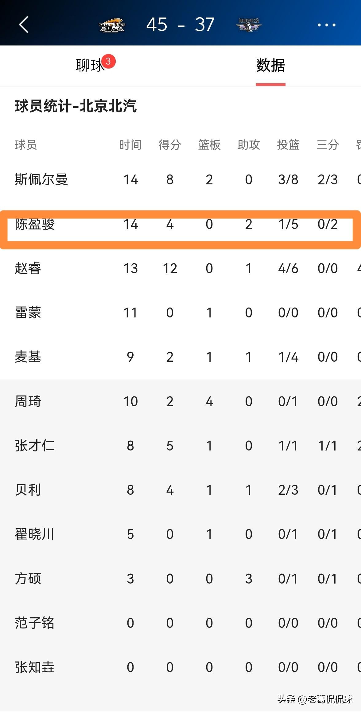 北京北汽球星陈盈骏真是太低迷了!在今天北京北汽客场挑战辽宁本钢的比赛中,目前双方的上半场比赛已经结束,北京北汽以37:45落后对手8分。让人感到非常失望的是,在前两节比赛中,陈盈骏的表现非常低迷,他在首发出战的14分钟里,投篮5中1,其中三分球2中0、罚球2中2非常低效的得到4分,他的场上正负值为-10。 毫不客气的说,作为一名全明星级别的球员,陈盈骏在上半场比赛中的表现真是惨不忍睹。