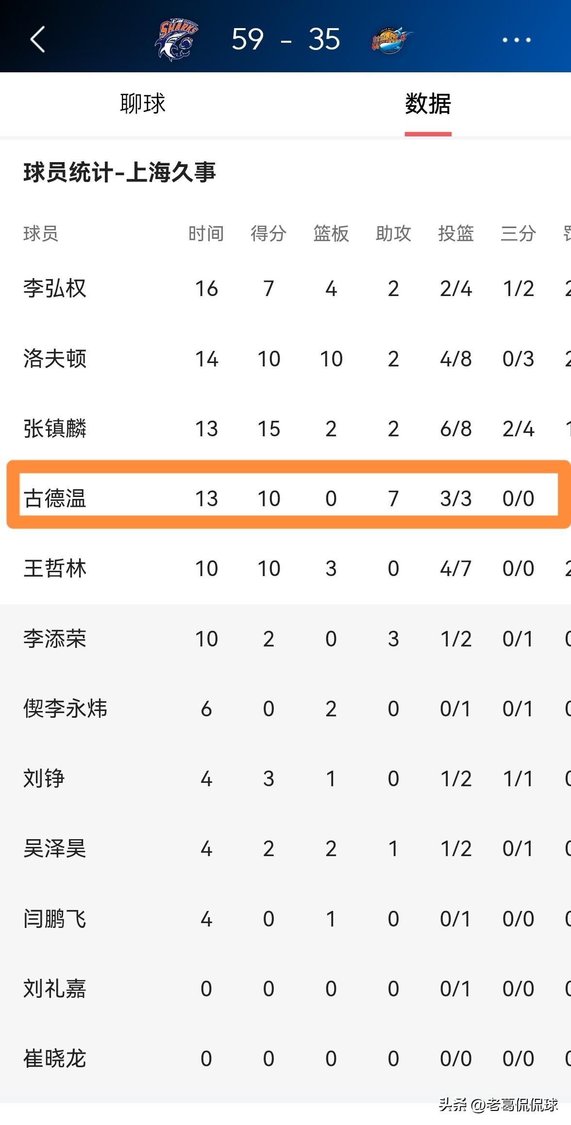 上海久事外援古德温真是得分助攻一肩挑!在今天上海久事主场迎战四川丰谷酒业的比赛中,目前双方的上半场比赛已经结束,上海久事以59:35大比分领先对手。在前两节比赛中,古德温不仅得分效率非常的高,而且送出了全队最多的7次助攻。 在上半场比赛中,古德温首发出战13分钟,投篮3中3,其中罚球5中4极其高效的砍下10分,还有7次助攻1抢断,他的场上正负值为+25。