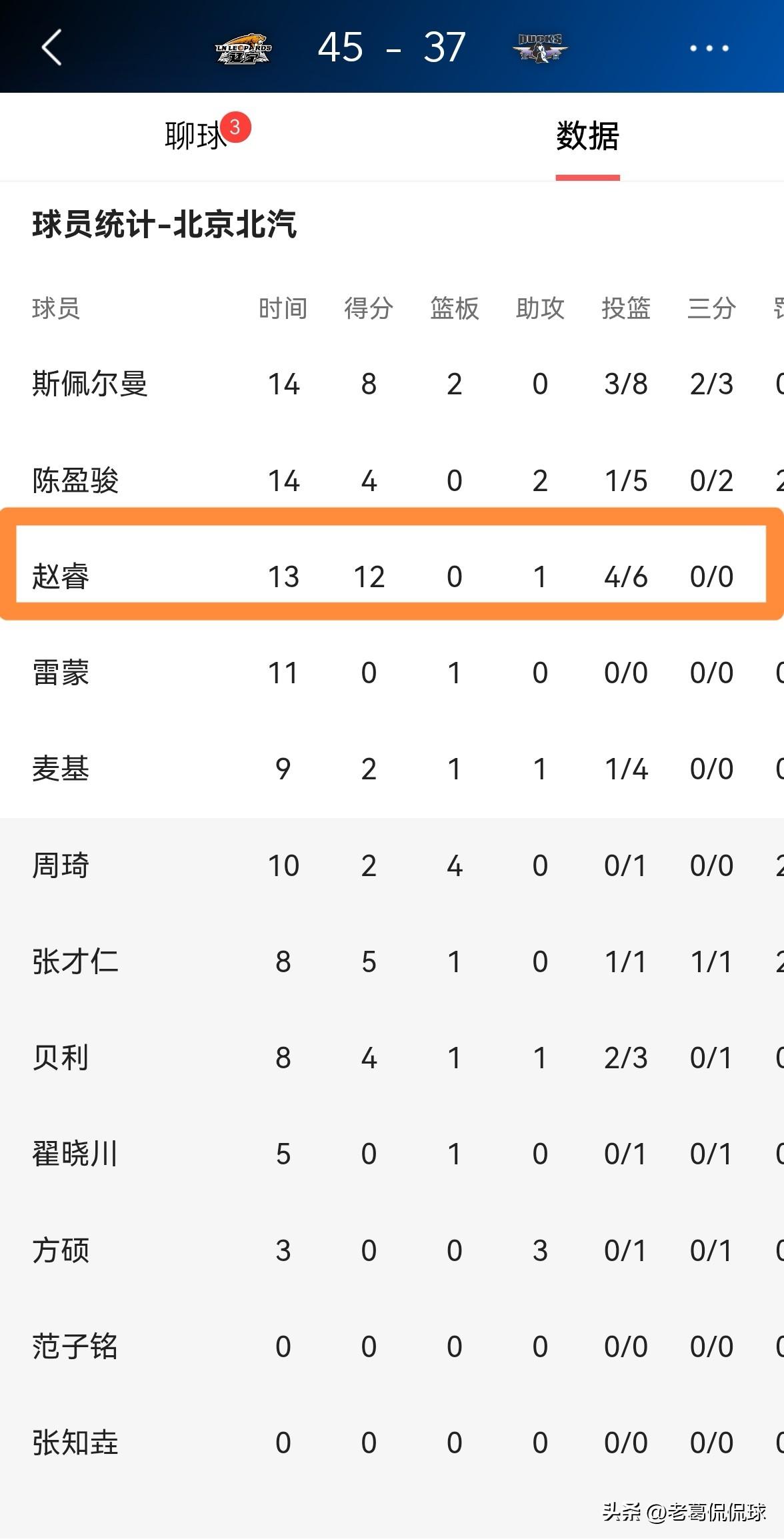 北京北汽当家控卫赵睿真是太反常了!在今天北京北汽客场挑战辽宁本钢的比赛中,目前双方的上半场比赛已经结束,北京北汽以37:45落后于对手。值得一提的是,在前两节比赛中,身为控卫的赵睿竟然只送出了1次助攻,他的表现真是太反常了。 在上半场比赛中,赵睿首发出战13分钟,投篮6中4,其中罚球4中4非常高效的砍下12分,仅有1次助攻,他的场上正负值为-5。