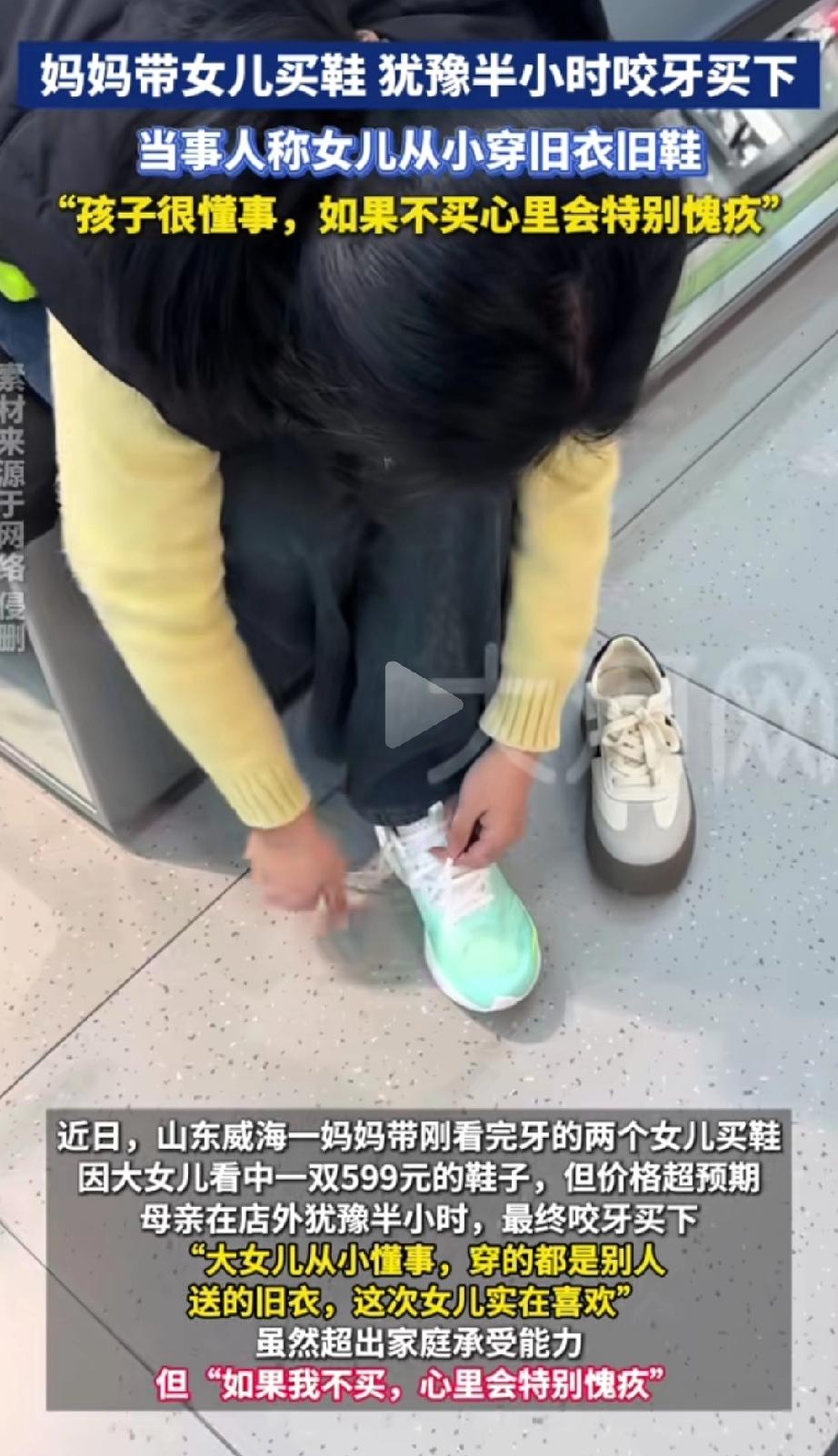 太心酸了!山东威海,一位妈妈带着刚看完牙的两个女儿买鞋,大女儿看中一双的鞋,没成想一问价格599元,为此母女三人在店门口纠结了整整半小时。妈妈说:如果不买心里会特别愧疚! 妈妈带着刚看完牙的两个女儿去逛鞋店,问大女儿有没有看中的。大女儿小心翼翼地指了一双鞋,试穿后特别喜欢——底子软,穿着舒服,颜色也中意。但一看价格,599元,三个人就从店里出来了。 出来之后,娘仨就坐在店门口,开始纠结。买吧,太贵了,599元要是换成一两百的鞋,能买两三双。不买吧,闺女确实喜欢得不行。 就这么坐了半小时,最后妈妈带着孩子又进了店,问店员能不能打折。店员说最多打九折。妈妈缓了一会儿,咬了咬牙说:“那行吧,拿着吧!”大女儿立刻说:“谢谢妈妈!” 后来这位妈妈把视频发到网上,说:“500多的鞋子,虽然很贵,但我的宝贝女儿值得拥有。” 妈妈说大女儿从小就特别懂事,穿的很多都是别人送的旧衣服,鞋子穿到开胶了也从来不挑剔。 今年过年也没给孩子买新衣服,这次看到女儿实在喜欢,就咬牙买了。“如果我不买,心里会特别愧疚。” 有网友说:“599元虽然贵,但是那一天妈妈对她的爱,她会记一辈子。” 还有网友说:“这不是一双鞋的事,是妈妈把孩子的喜欢放在了心里。” 599元,对有些家庭来说可能就是一顿饭钱,但对这个妈妈来说,她要纠结半小时,要咬牙才能做决定。 可即便如此,她还是选择了满足孩子。这背后不是钱的事,是一个妈妈不想让孩子失望的心。 更让人动容的是这个女儿。她不是那种看到什么都想要的孩子,她是小心翼翼指了一双鞋,是在妈妈说“拿着吧”之后立刻说谢谢的孩子。 这样的懂事,恰恰是因为她知道妈妈不容易。599元的鞋,穿在脚上暖在心里,因为它不只是一双鞋,它是妈妈把孩子的喜欢放在心上的证明。 我们常说穷人家的孩子早当家,但很多时候不是孩子天生就懂事,是他们太早看到了父母的辛苦。这个女儿穿旧衣服、穿开胶的鞋从来不挑剔,不是不喜欢新的,是不想让妈妈为难。 而妈妈呢,自己省吃俭用,但看到孩子真心喜欢的东西,哪怕贵也要咬牙买下来。这种相互心疼,才是最珍贵的。 一双鞋,599元,贵吗?确实贵。但这份爱,无价。妈妈的那句“我的宝贝女儿值得拥有”,是这个家最温暖的底气。 女儿相中599元的鞋 母亲纠结后买下