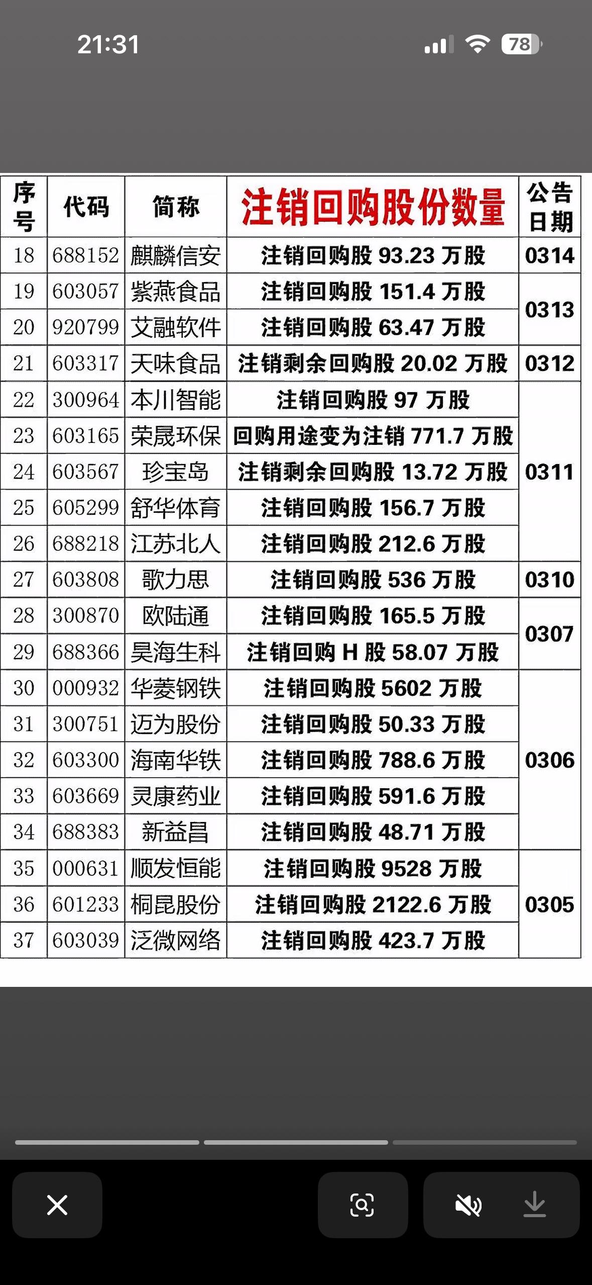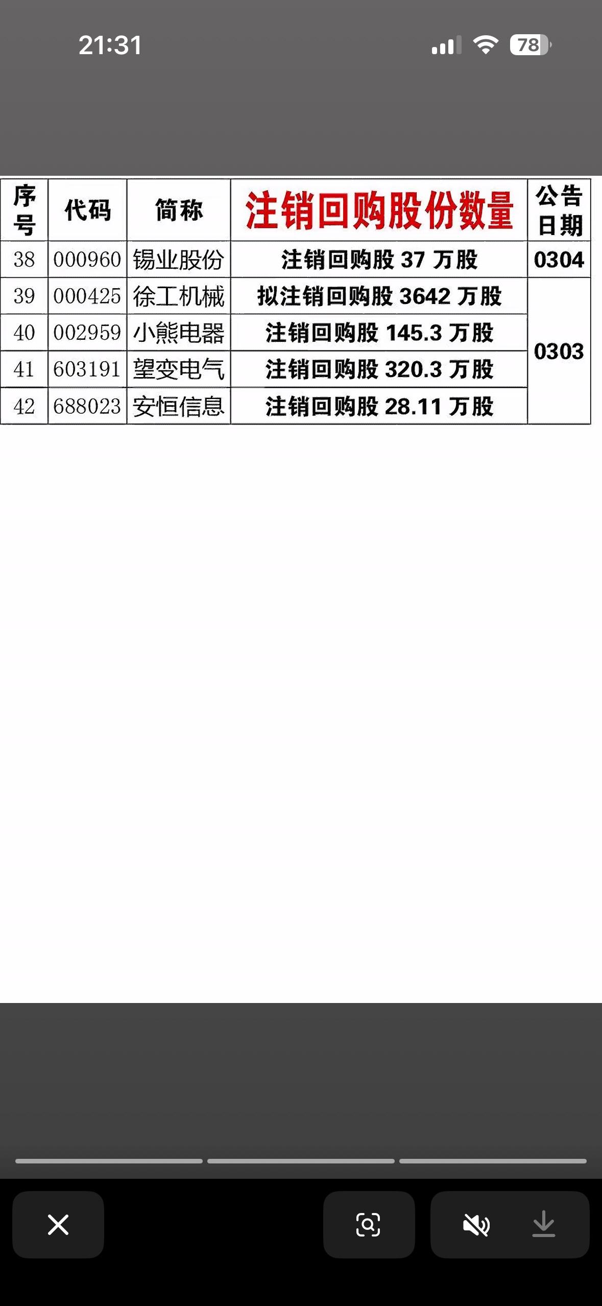 本月回购、注销股份的上市公司公告一览表 最近锡业股份、徐工机械等公司发布了股票回购数量公告,这可是市场里的大动静。就说锡业股份,3月3日公告称注销了370,000股回购股份,占回购前总股本的0.0225%,注销后总股本减少。 其实早在2025年6月,锡业股份就审议通过股份回购方案,想用1亿至2亿自有资金回购股份注销来减资,回购价不超21.19元/股。可到2026年1月28日,只回购了370,000股,花了700多万。因为股价持续高于回购价上限,没达到原定目标,董事会决定提前终止方案并注销已回购股份。这一系列操作,对市场影响几何,值得持续关注。