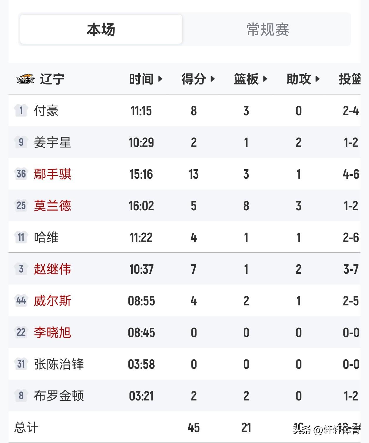 上半场的鄢手骐简直神准,3分球5投4中半场就贡献了13分,最近鄢手骐的三分球命中率快接近50%了,辽宁男篮与北京北汽男篮焦点之战上半场已经结束,半场比赛比分辽宁男篮45-37领先北京北汽8分,辽宁男篮上半场10人参与轮换,其中8人有得分贡献,其中鄢手骐13分,付豪8分,赵继伟7分,莫兰德5分8篮板,哈维以及威尔斯各有4分贡献,布罗金顿以及姜宇星各有2分入账,但是辽宁男篮上半场的失误太多了,半场7个失误下半场如果不控制失误辽宁男篮会打的很被动,但是辽宁男篮篮板以26-13领先北京北汽,下半场加油辽宁男篮,七连胜就在眼前。