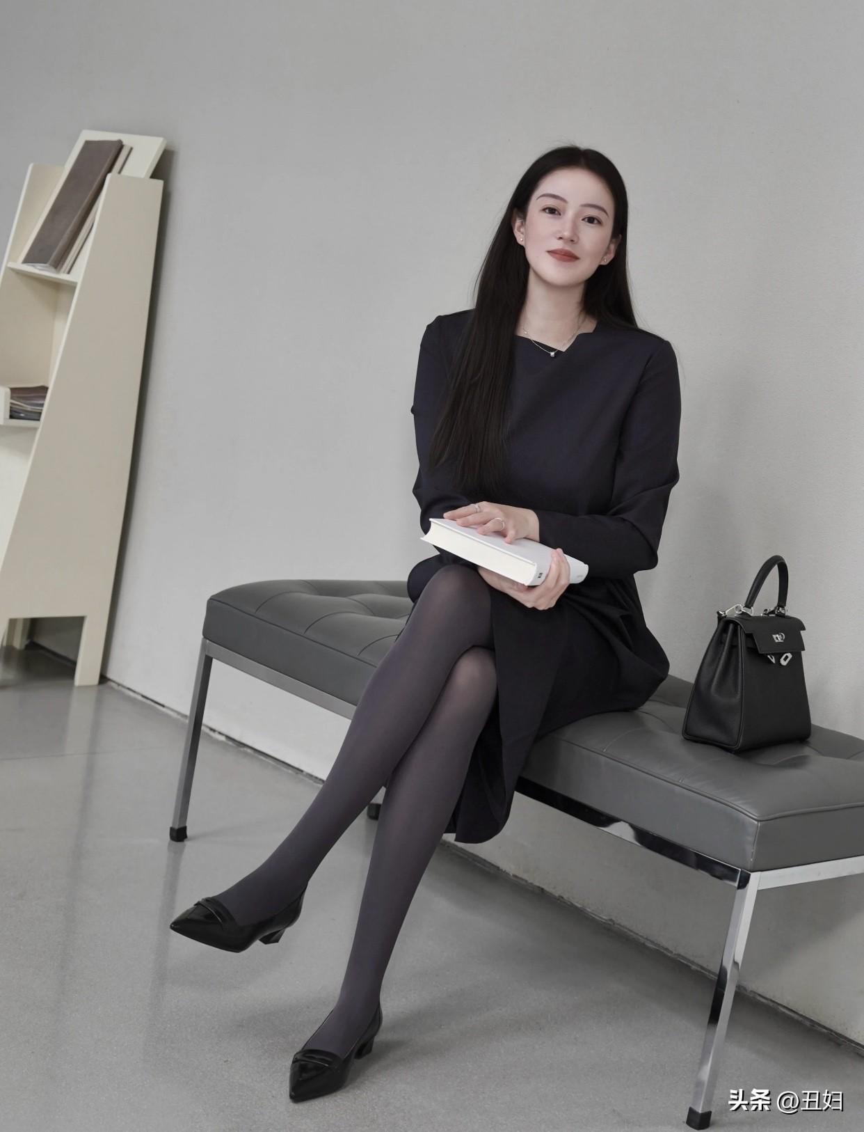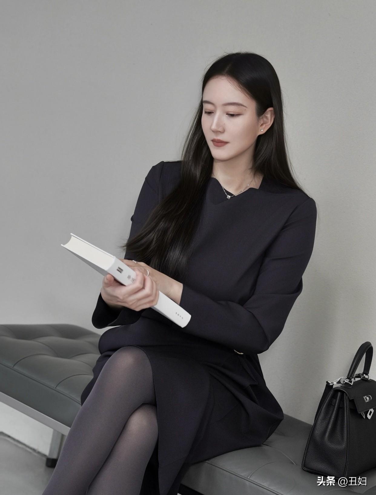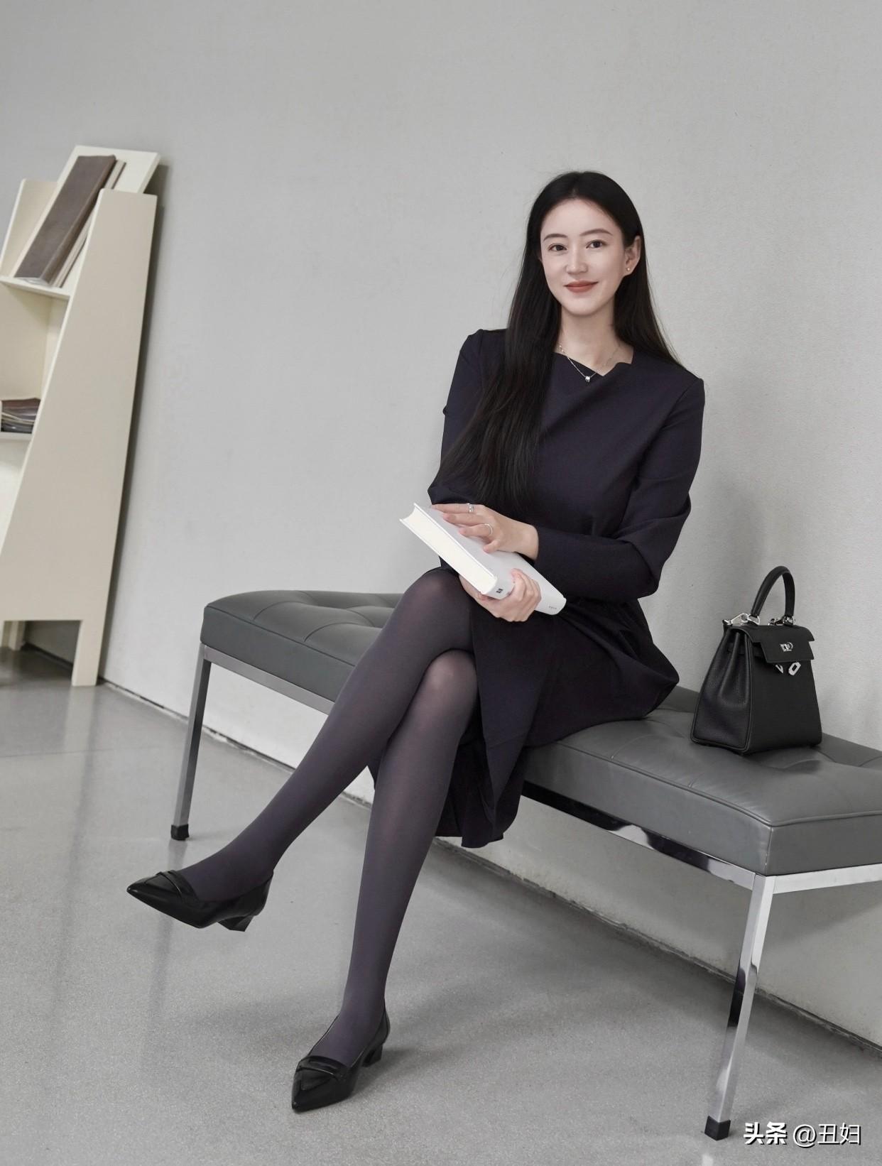 看看气质女神的穿着搭配吧黑色连衣裙搭配厚黑丝袜手拿书籍!
