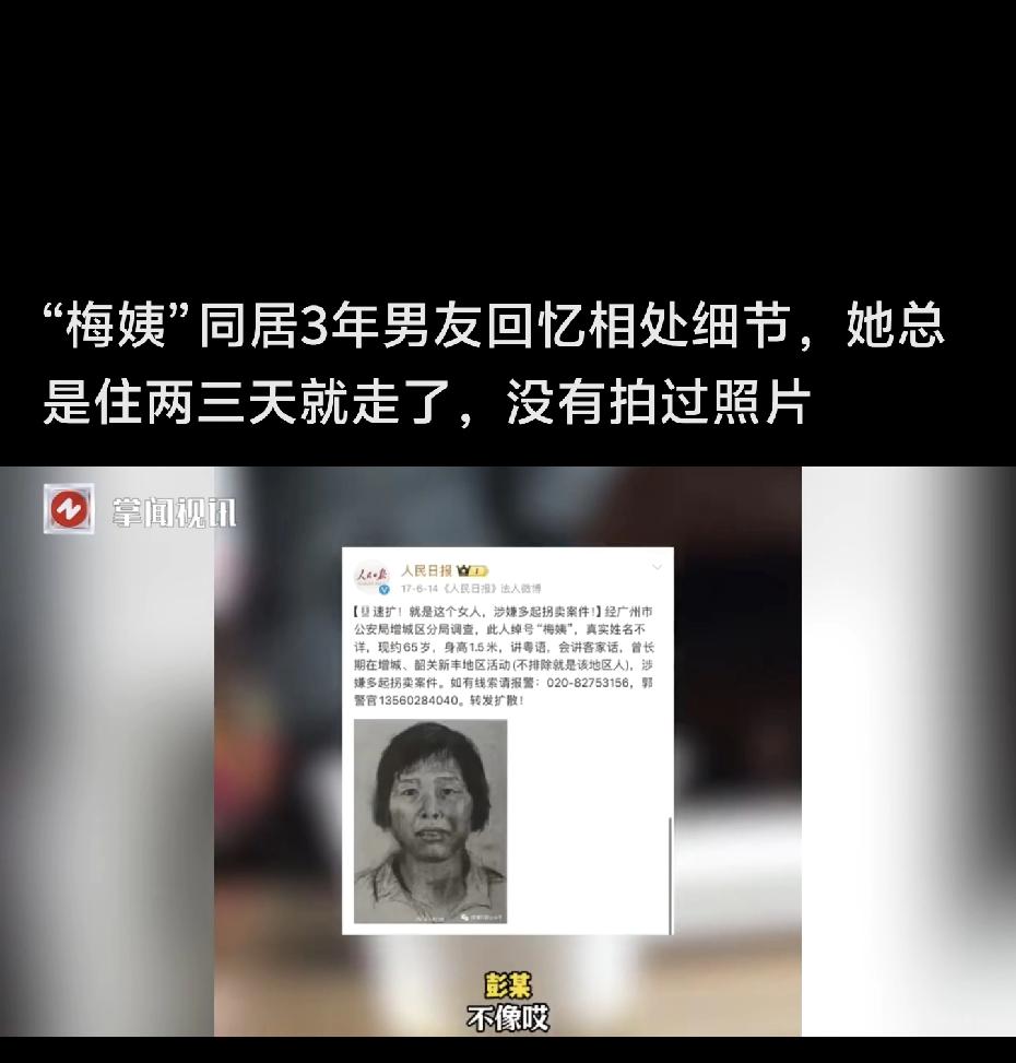 同居三年,连一张合照都没拍过。彭家庆到现在才反应过来,那个睡在自己身边三年的女人,到底是个什么东西。 昨天梅姨落网的消息大家都看到了,真名叫谢某某,2025年就被抓了,近日才通报。 但让人后背发凉的是她和彭家庆同居那三年的细节。 2010年前后,彭家庆在广东紫金县黄砂村,经亲戚介绍认识了这个自称“潘冬梅”的女人。 她说自己是广州人,五十多岁,有两个女儿。 彭家庆当时是个鳏夫,想着找个伴过日子,就让她住下了。 这一住就是三年。 但奇怪的事从第一天就开始了。 她不让他拍照,怎么说都不行。 没有手机号,没有身份证,连个首饰都没见她戴过。 每次住两三天就走,说是“去做生意”,过一阵又回来。 彭家庆问她做什么生意,她含糊几句就过去了。 三年里,他连她真名叫什么都不知道。 同居两三年后,梅姨说回家拿户口本,回来就结婚。然后就再也没回来。 直到2016年张维平落网,供出“梅姨”这个人,彭家庆才在网上看到画像。 和自己同居三年的女人,竟然是拐卖9个孩子的中间人。 更让人唏嘘的是,被梅姨拐卖的孩子申聪,昨天发视频说等这一天等了十多年。 另一个孩子钟彬,听说梅姨落网,激动到当场吐了。 孙海洋说了一句话我印象特别深:“梅姨就像鬼一样存在,很多人不信,说我们炒作。” 现在“鬼”终于抓到了。只是不知道,还有多少个像彭家庆这样的人,曾经和恶魔睡在一张床上,却浑然不知。 你们说,一个人要有多强大的心理素质,才能一边拐卖别人家的孩子,一边若无其事地和男友同居过日子?