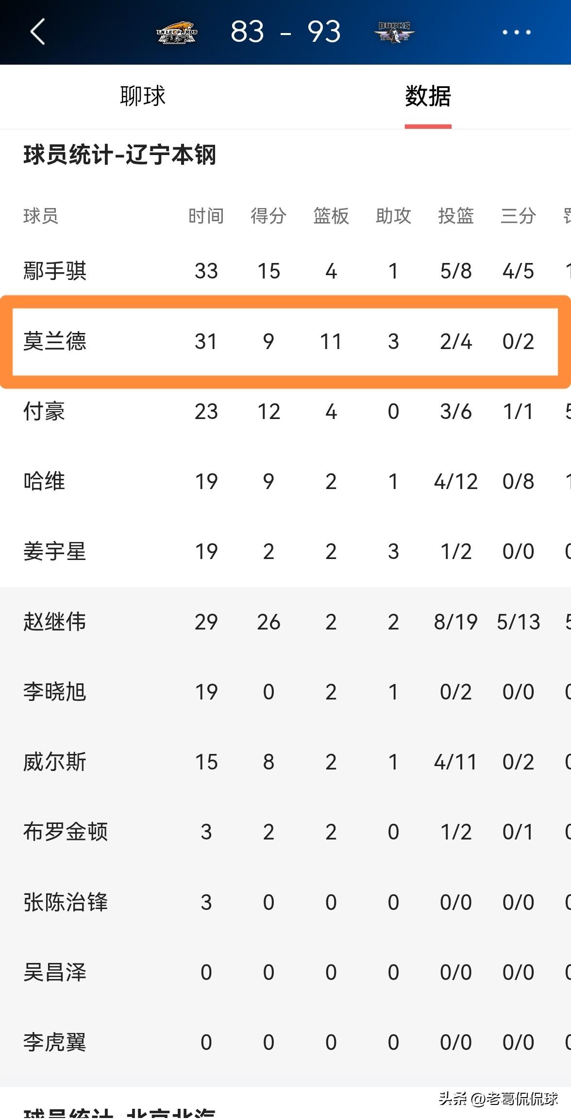 辽宁本钢外援莫兰德必须增加自己的出手数!在今天辽宁本钢主场以83:93输给北京北汽的比赛中,莫兰德仅仅出手了4次,这么少的出手数是远远不够的,莫兰德起码应该出手10次才行。 全场比赛下来,莫兰德首发出战31分钟,投篮4中2,其中三分球2中0、罚球6中5得到9分11篮板3助攻1抢断1盖帽,还有4次失误,他的场上正负值为-9。 老实说,当辽宁本钢遇到实力比较强的球队时,莫兰德必须展现出自己在进攻端的威力,莫兰德必须分担赵继伟身上的进攻压力。