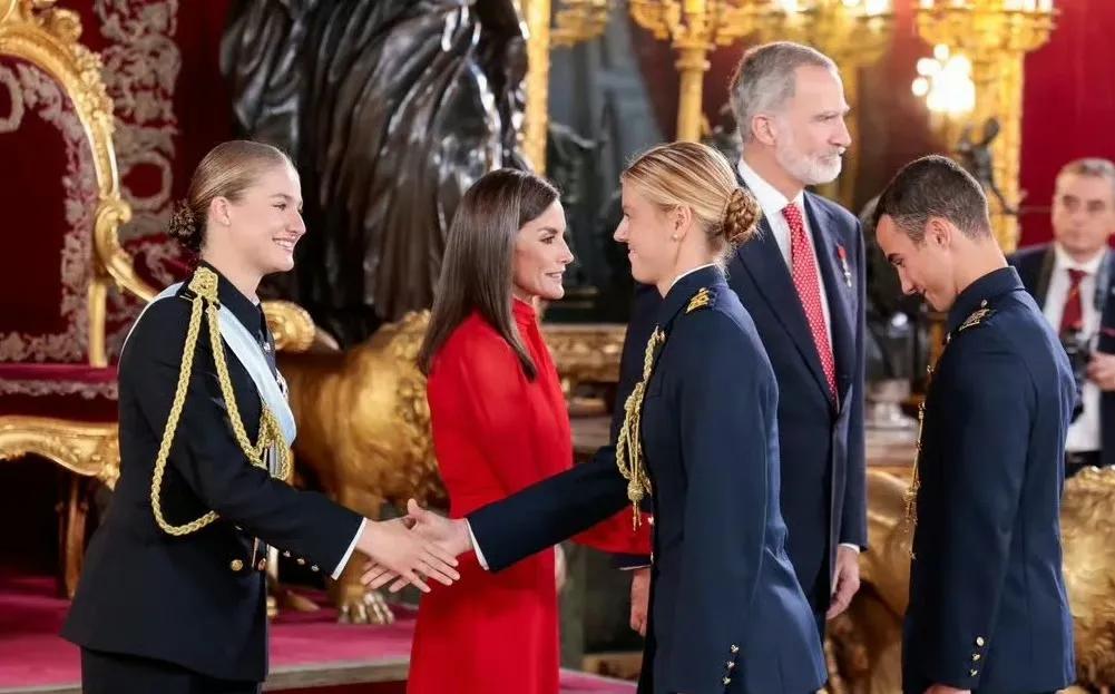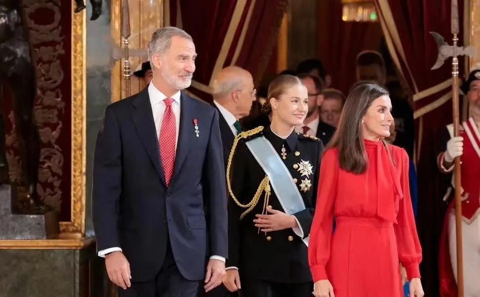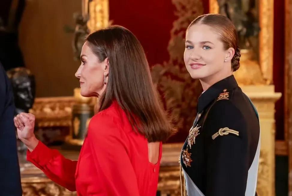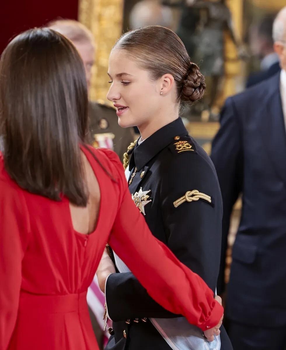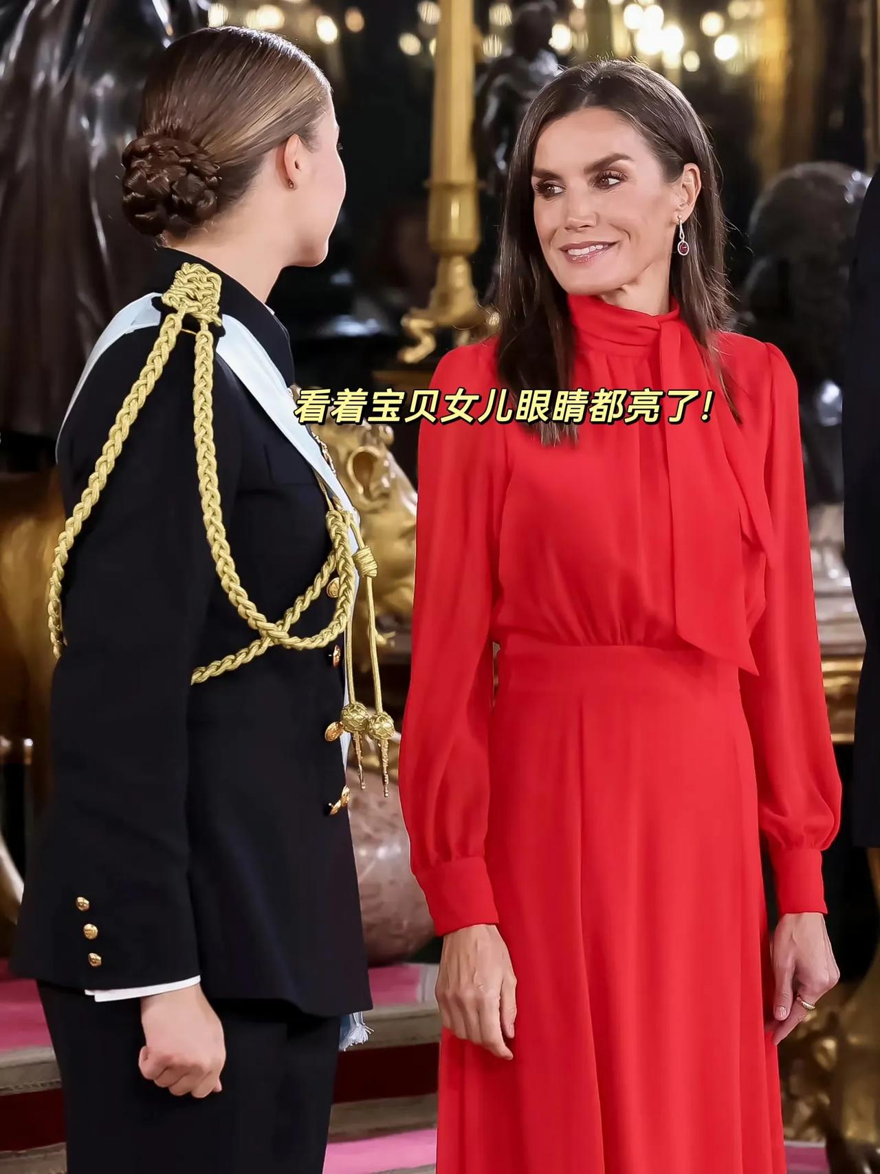 西班牙国庆活动之一,国王夫妇在马德里皇宫举行招待会。费利佩国王换上了西装,但莱昂诺尔公主没有换,依然是一身戎装,但把那个压额头的帽子给摘掉了,立马把颜值救了回来,公主还是露出额头漂亮呀!媒体拍到的最佳照片当属这种母女对视!莱蒂齐亚望着女儿的眼神里充满了爱与骄傲!欧洲皇室公主