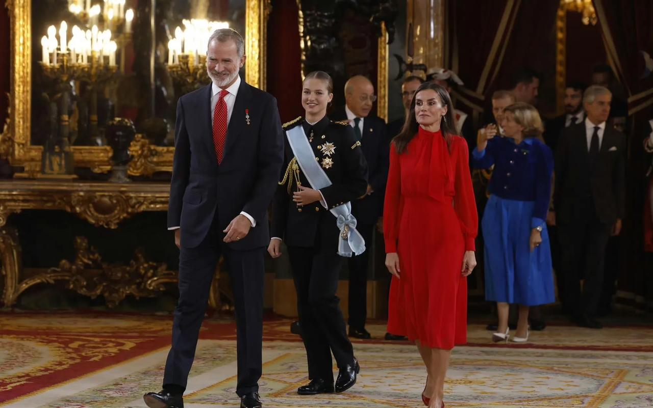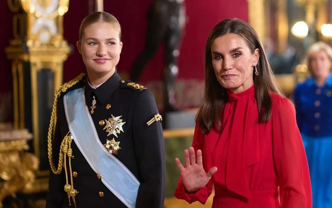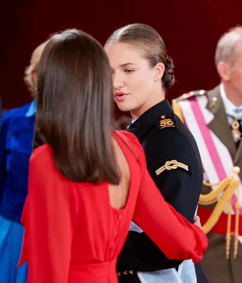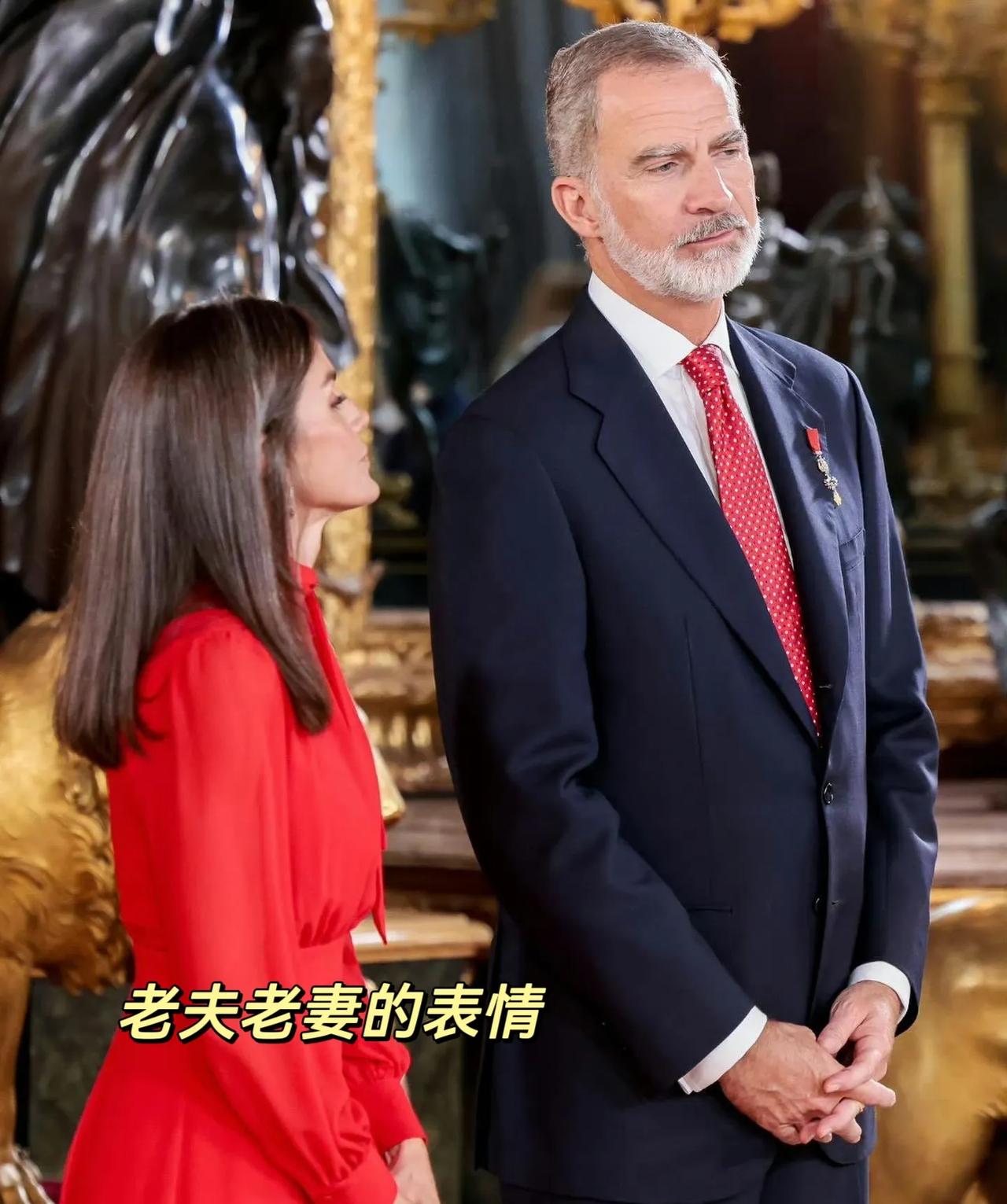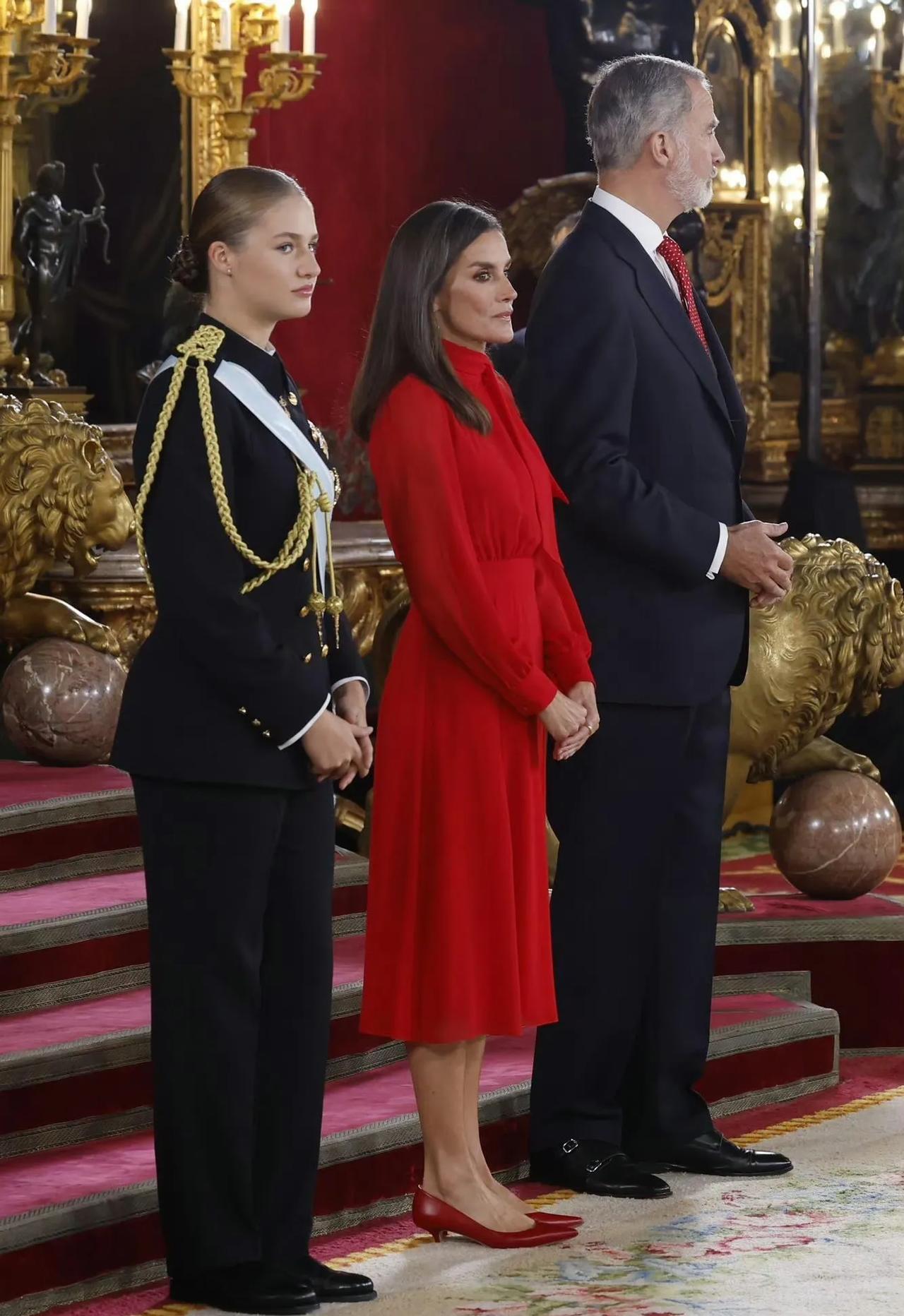 西班牙国庆活动之一,国王夫妇在马德里皇宫举行招待会。费利佩国王换上了西装,但莱昂诺尔公主没有换,依然是一身戎装,但把那个压额头的帽子给摘掉了,立马把颜值救了回来,公主还是露出额头漂亮呀!媒体拍到的最佳照片当属这种母女对视!莱蒂齐亚望着女儿的眼神里充满了爱与骄傲!欧洲皇室公主