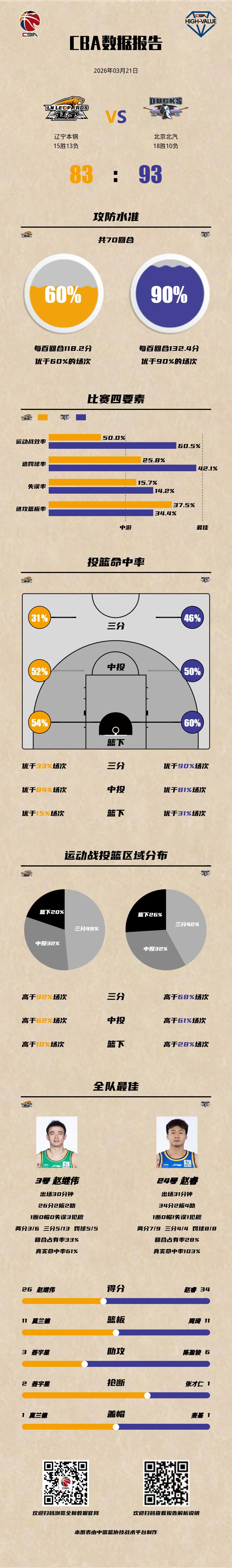 辽宁本钢 83-93 北京北汽 辽宁男篮vs北京男篮 辽宁本钢:赵继伟26分,鄢手骐15分4篮板,莫兰德9分11篮板3助攻; 北京北汽:赵睿34分4助攻,陈盈骏18分6助攻,斯佩尔曼15分9篮板。以城之名