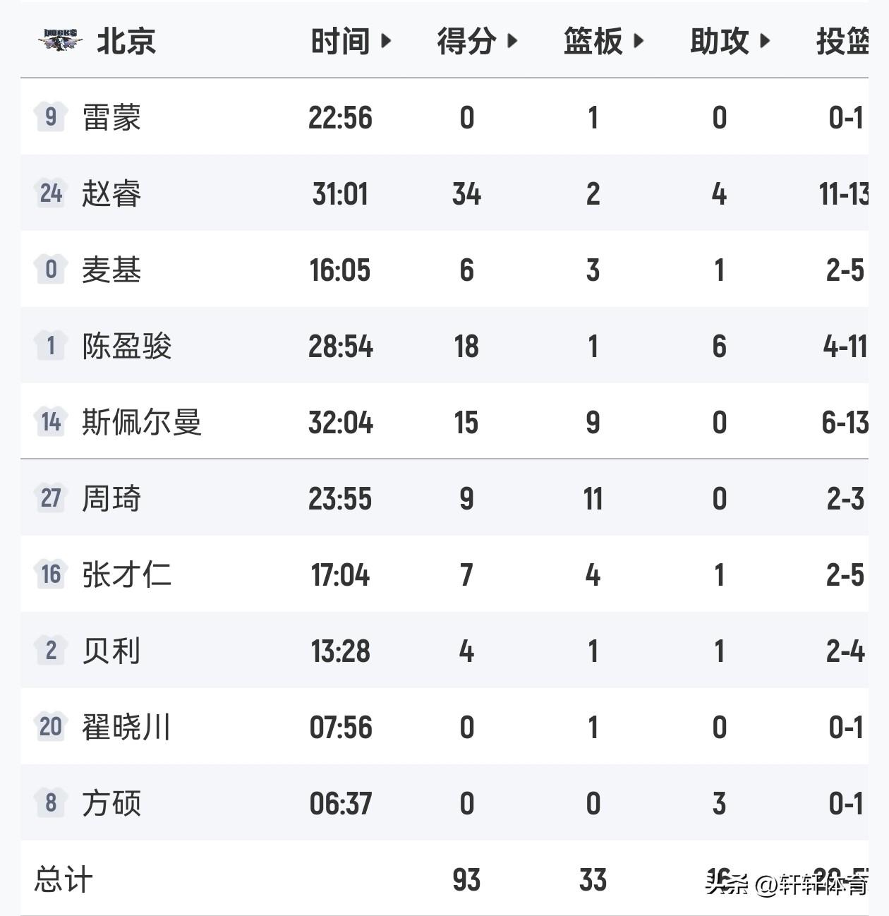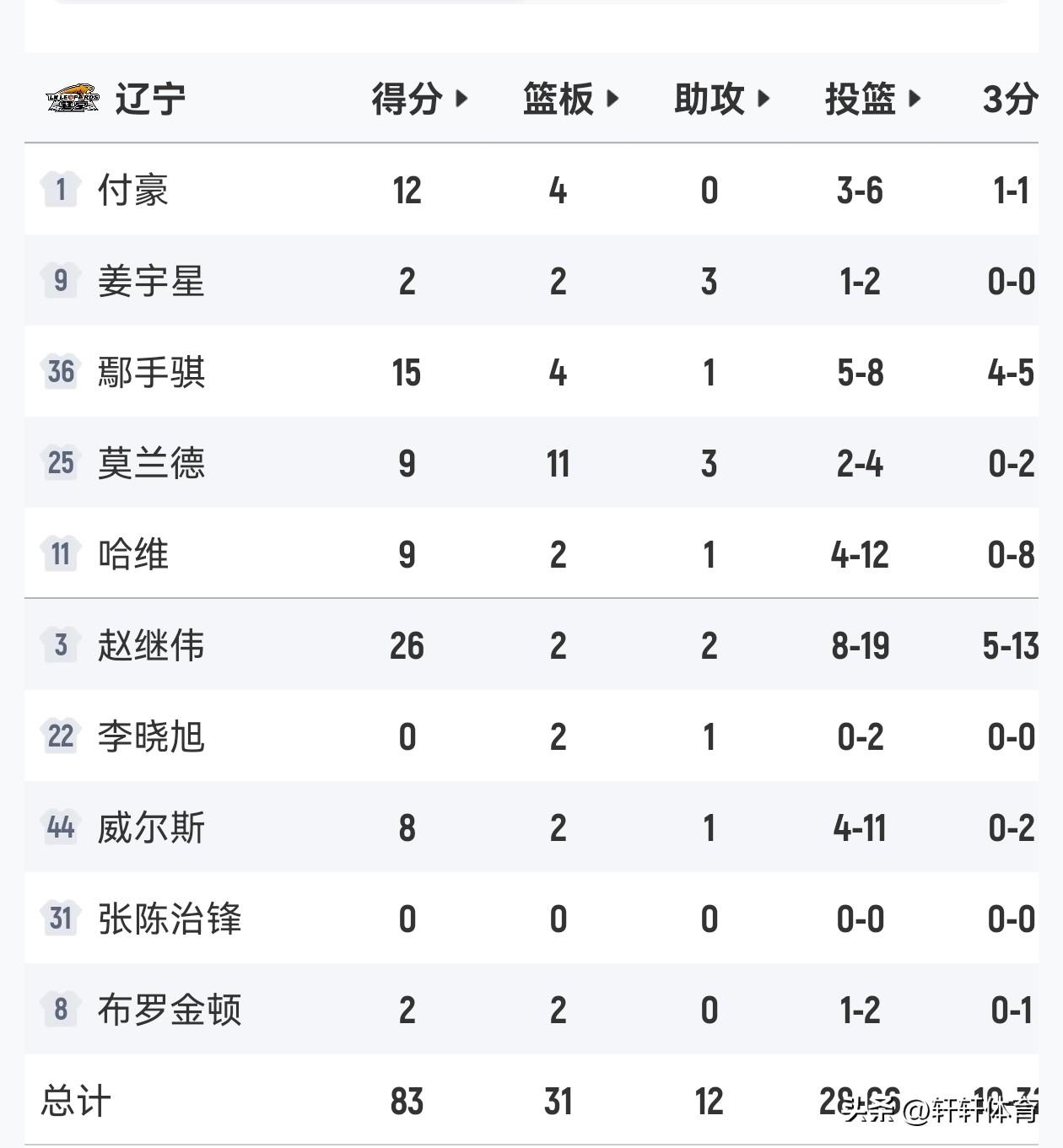 非常遗憾辽宁男篮主场以83-93不敌北京男篮,北京男篮本场比赛下半场凭借赵睿的超神发挥,个人独得34分2篮板3助攻的数据,完全左右了本场比赛的结果,反观辽宁男篮上半场打出非常高效的进攻半场45-37领先北京男篮,但是下半场场上风云突变,下半场开局赵睿包揽了北京男篮前12分,包括比赛第四节赵睿,陈盈俊连续三分命中,帮助北京拿到比赛的胜利,辽宁男篮本场比赛哈维的三分球手感严重不佳,全场8投0中是本场比赛辽宁男篮失败的一大因素,再有就是辽宁男篮赖以生存的防守本场比赛做的非常不好,尤其对北京男篮的赵睿以及陈盈俊,就此辽宁男篮终结了6连胜,辽宁男篮本场比赛打了半场好球,继续加油吧!