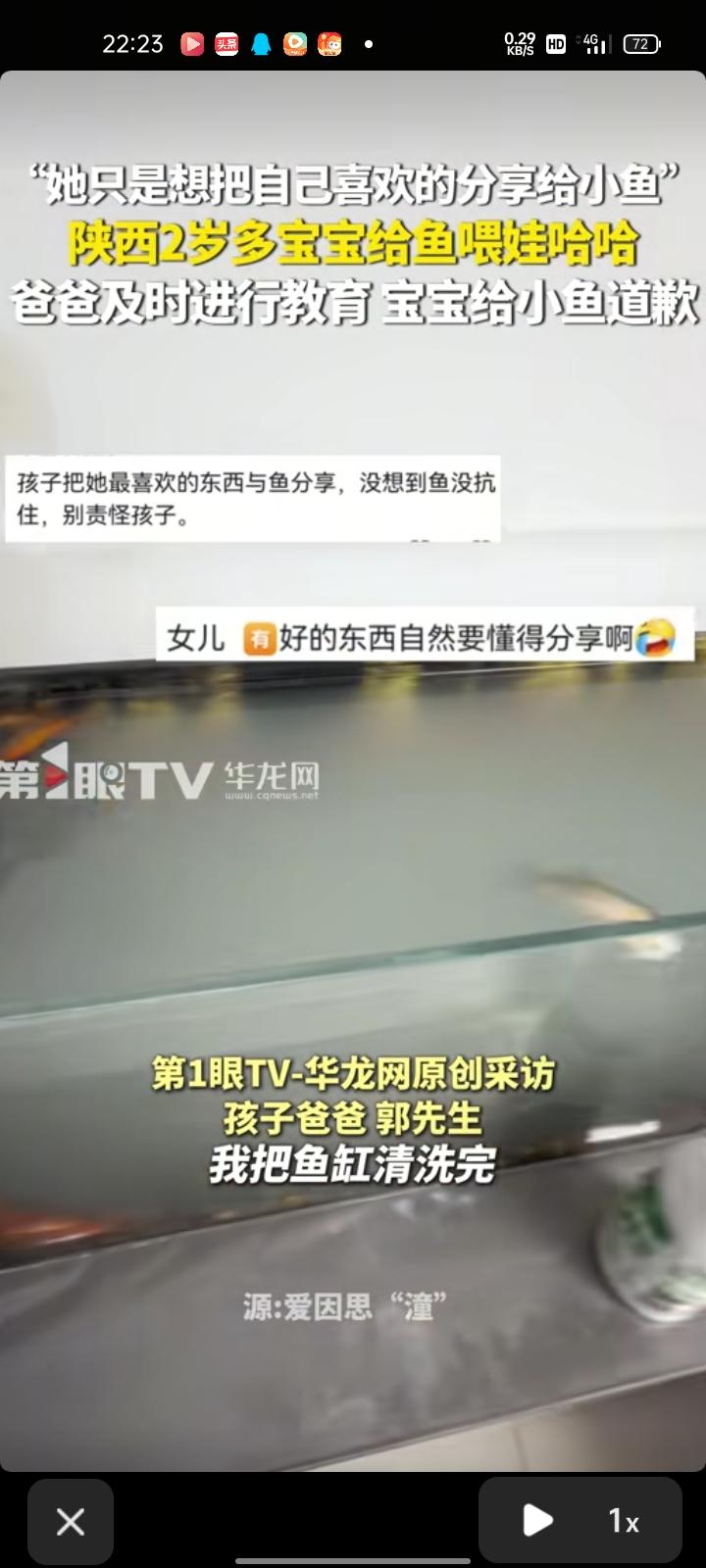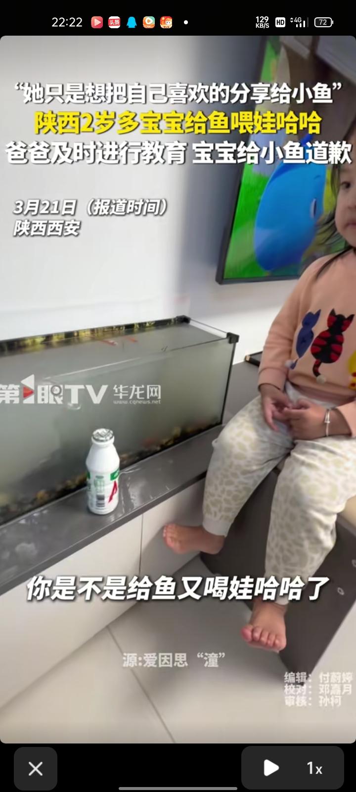 3月17日,陕西西安。网友晒视频表示,两岁多女儿给鱼喂娃哈哈,导致鱼缸里的鱼全“噶”了,看见后及时对其进行教育。其实鱼没有事,鱼缸清洗下就行。女儿是个非常有爱心的小女孩,她只是把自己喜欢的娃哈哈牛奶、玩具给小鱼分享,没有其他心思