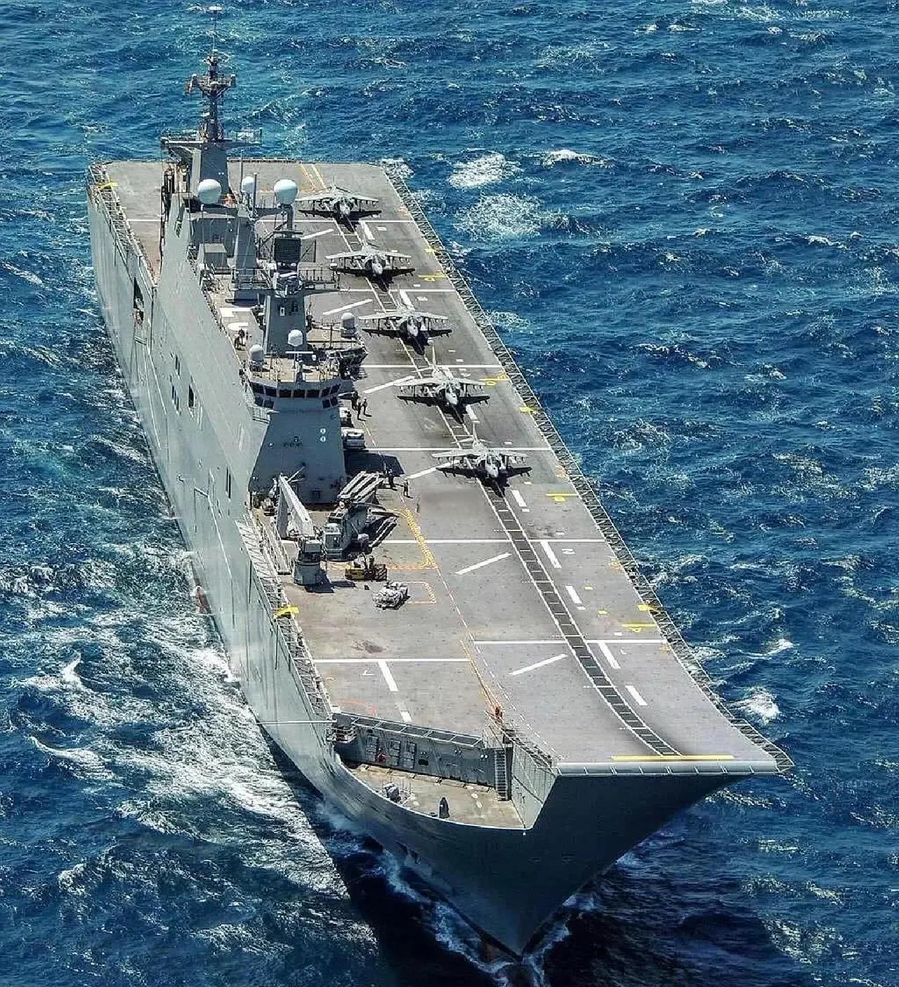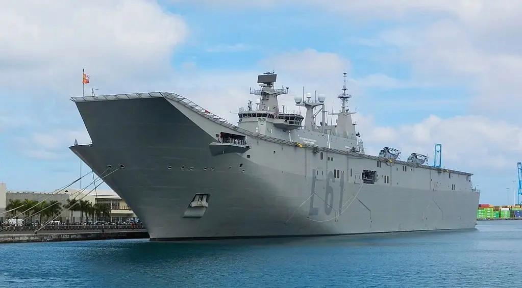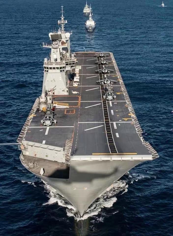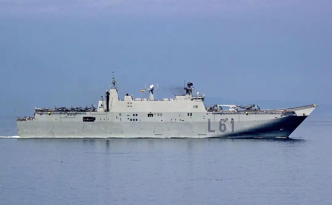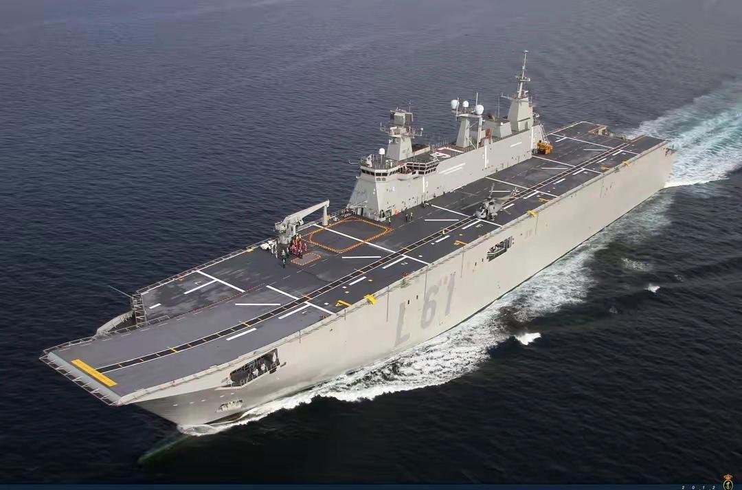 西班牙“胡安·卡洛斯一世”号战略投送舰 1. 基本概况 * 舰名:“胡安·卡洛斯一世”号 * 设计定位:战略投送舰/多用途两栖攻击舰。西班牙官方称之为“战略投送舰”,强调其超越传统两栖舰的战略投送能力。核心任务是两栖攻击、航空作战、兵力投送、人道主义救援及作为特遣部队旗舰。 * 战略意义:作为西班牙海军的核心和旗舰,它取代了老旧的“阿斯图里亚斯亲王”号轻型航母,实现了两栖突击与航空作战能力的统一,极大地增强了西班牙的远洋干预和全球行动能力。 2. 性能参数 项目 参数 满载排水量 27,079吨 舰长 230.8米 舰宽 32米 吃水 7.18 米 动力系统 “柴燃联合电力”推进,1台LM-2500燃气轮机和2台柴油机 最大航速 20.5节 续航力 8,000海里/15节 舰员编制 243 名舰员 + 172 名航空人员 自持力:50天 3. 核心设计与技术特点 * “跨界二合一”构型: * 航母功能:直通飞行甲板(长202m,宽32m)、舰岛右置、滑跃甲板,支持F-35B/AV-8B运作。 * 两栖功能:车辆甲板、坞舱、滚装/滚卸坡道,支持机械化登陆。 * 模块化舱室设计:机库与车辆甲板采用可拆卸隔板,可根据任务需求灵活转换。作为空母时,机库面积可达约3,000㎡,容纳20–25架固定翼战机; 作为两栖舰时,保留1,000㎡机库 +1,880㎡轻型车辆甲板 + 1,410㎡重型坦克车库。 * 滑跃甲板与强化飞行甲板:飞行甲板前端装有13°滑跃翘角,甲板经特殊强化以承受F-35B/AV-8B等STOVL战机的高温喷流,支持短距/垂直起降。 * 动力系统:采用“柴燃联合电力”推进,由1台通用电气LM-2500燃气轮机(26,820马力)和2台德国MAN 3240 16V柴油机(各10,325马力)驱动发电机,为2个可旋转360°的吊舱式电动推进器供电,每个推进器功率达14,750马力,大幅提升机动性与燃油效率。 * 泛水坞舱与登陆艇搭载能力:舰尾设69.3m × 16.8m湿式坞舱,可搭载2艘LCAC气垫登陆艇,或4艘LCM-1E/8登陆艇。 * 医疗与后勤保障完善:配备3间手术室、CT室、X光室、病房等,支持人道救援与长期海外部署。 4. 航空能力 * 航母模式 * 机库容量:标准情况下可容纳8架F-35B或8架AV-8B垂直起降战斗机 。 * 甲板停机位:飞行甲板设有6个固定翼战机停机位,但实际可同时操作的飞机数量受限于起降效率和调度空间 。 * 最大搭载量:在高密度配置下可搭载25架鹞式战机。 * 两栖攻击模式 * 同时操作能力:可同时操作4架CH-47重型直升机,或6架NH-90/SH-3中型直升机。 * 机库容纳量:机库面积1000平方米,可容纳12架中型直升机;若拆除车辆隔间,机库扩展至约2880平方米,可搭载25架中型直升机 。 * 典型作战编组:多为8–12架固定翼战机+6–12架直升机的组合 。 * 无人机:2025年整合SIRTAP无人机,具备察打一体能力。 5. 两栖作战 * 人员搭载能力 * 标准编制可搭载 320名海军陆战队,必要时可增加至 140名指挥人员 + 70名额外人员,最多可搭载1200名登陆部队。 * 车辆与装备运输 * 可运输46辆豹2主战坦克或100辆轻型车辆。 * 车辆通过舰内 驶进/驶出坡道 快速进出,提升登陆效率 。 *两栖登陆载具 *可搭载2艘LCAC气垫登陆艇,或4艘LCM-1E/8机械化登陆艇 。 * 坞舱支持在四级海况下收放登陆艇,保障恶劣天气下的作战能力 。 6. 武器与电子系统 * 武器系统 * 4门厄利孔20毫米防空机炮 * 4挺12.7毫米重机枪 * 预留升级空间 * 预留了加装垂直发射防空导弹系统或美制RAM短程防空导弹的空间。 * 舰体结构允许在滑跃甲板左侧平台加装近防炮或近防导弹系统。 * 电子系统 * Indra Lanza-N 三维对空搜索雷达 * ARIES 水面搜索雷达 * PAR 飞机着舰引导雷达 * C4ISR作战系统(作为全舰作战神经中枢,负责信息融合、态势感知、指挥决策与任务协调) 7. 服役情况与出口型号 * 服役情况:西班牙本国仅建造了1艘,即“胡安·卡洛斯一世”号(舷号L61),于2011年正式服役。 * 该舰作为原型,衍生出多个出口型号: * 澳大利亚采购了2艘改进型,称为“堪培拉”级两栖攻击舰。 * 土耳其引进技术建造了1艘加强航空作战能力的版本,即“阿纳多卢”号轻型航母。