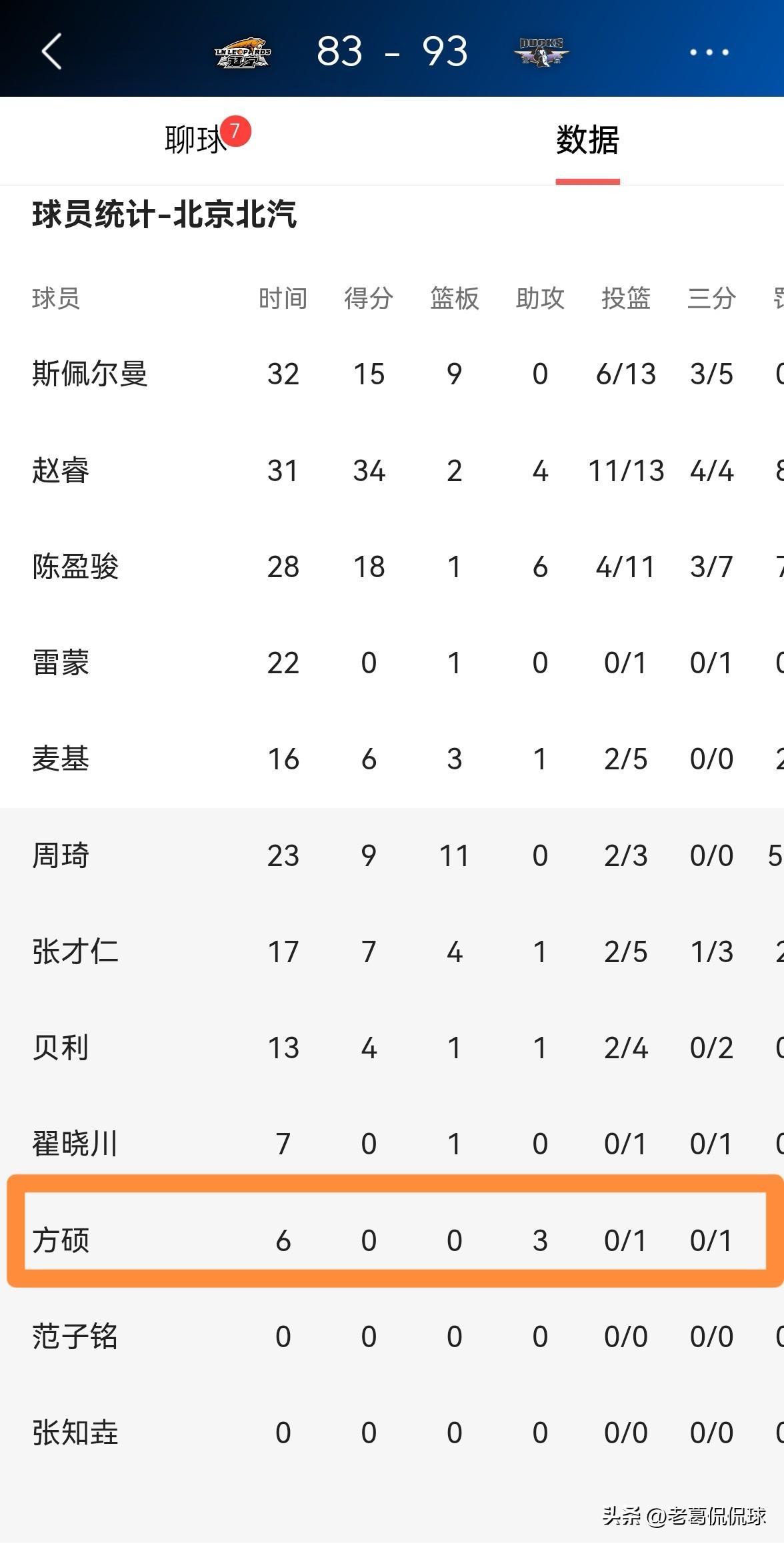 北京北汽老将方硕的助攻能力确实太强了!在今天北京北汽客场以93:83击败辽宁本钢的比赛中,虽然方硕仅仅得到了6分钟的出场时间,但是他却送出了3次助攻,他的助攻数排在全队第三。 老实说,虽然方硕已经35岁了,但是他依然拥有非常出色的组织串联能力,只要方硕能够获得合理的上场时间,那么他一定可以在进攻端为球队提供非常大的帮助。