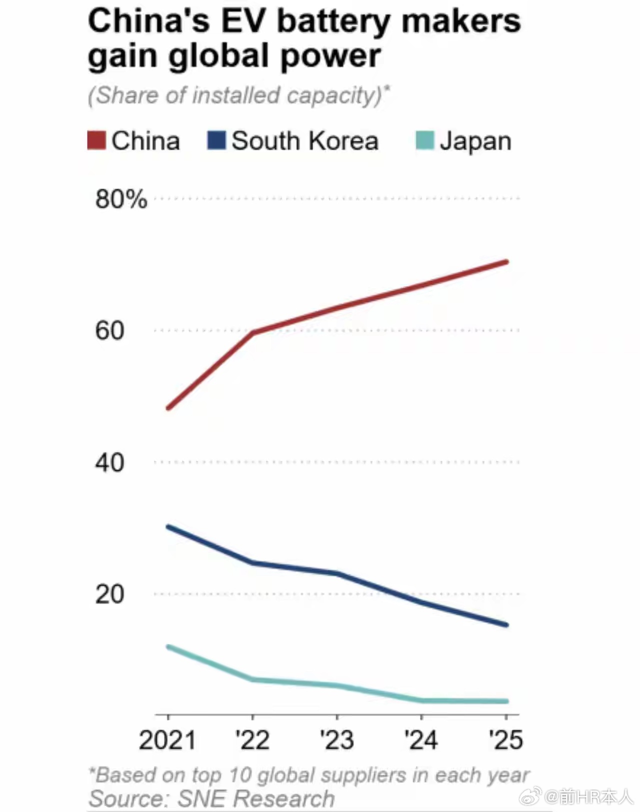这才是中日韩产业发展的正确模式:中日韩动力电池份额对比,中国超70%了,而且份额还在持续上涨!现在宁德时代+比亚迪就占了全球半壁江山,特别随着中国电动车出口猛增,份额跟着水涨船高。日本松下、韩国LG和三星的主要订单是欧美日车厂;随着美国车厂退坡,欧洲允许油车延期、电动车切换变慢所以他们份额下降了。