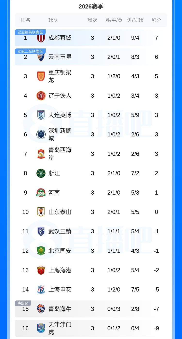 新赛季中超联赛第三轮比赛结束,看完比赛赛果,有5个没想到 1、17年后,中超重现“川渝德比”,火爆刺激,重庆铜梁龙虽然是升班马,但是踢得真不错,下半场连进三球,让二追三,差点逆转成功,伤停补时阶段,拜合拉木贡献绝杀,让这场精彩的德比战,以平局收场的同时,也留给球迷对下一次的“川渝德比”有了更多期待! 2、山东泰山客场4球完败云南玉昆,吃到中超首场败仗,可以说全程被对手吊打,射门数6比17,射正数1比8,第83分钟谢文能直红被罚下,山东泰山这场真是输球又输人! 3、“京沪德比”,有点菜鸡互啄的意思,双方加一起一共有4脚射正!唯一的亮点应该就是,申花队陈晋一任意球直接破门! 4、“升班马”辽宁铁人主场3-0完胜天津津门虎,拿到中超首胜。这样一来,本赛季两支升班马球队,仅仅用了三轮比赛,就全部拿到了首胜! 5、三轮联赛过后,积分榜还是很神奇,仍然有6支球队是负分,积分榜前四名分别是成都蓉城、云南玉昆、重庆铜梁龙以及辽宁铁人!成都蓉城上赛季中超第3名,云南玉昆上赛季中超第8名,剩下两支球队则都是中超“升班马”!