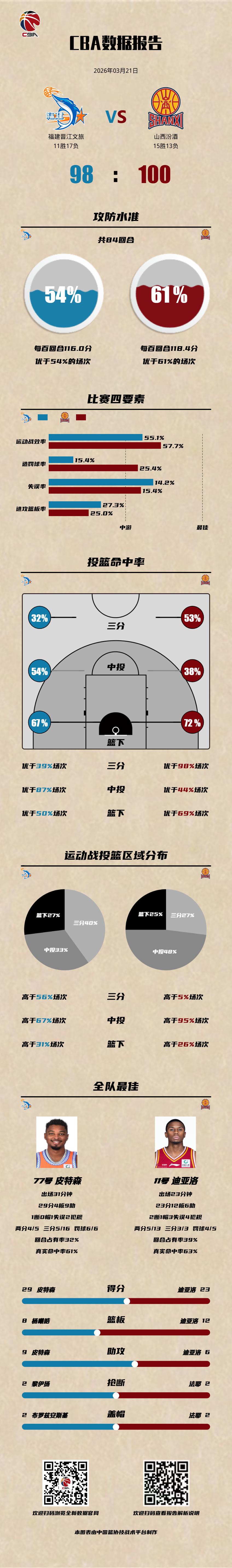 福建晋江文旅 98-100 山西汾酒 福建男篮vs山西男篮 福建晋江文旅:皮特森29分4篮板9助攻,黎伊扬18分7助攻2抢断,邹阳18分6篮板; 山西汾酒:迪亚洛23分12篮板6助攻2抢断,张宁16分6篮板,法耶12分8篮板3助攻2抢断2盖帽。以城之名