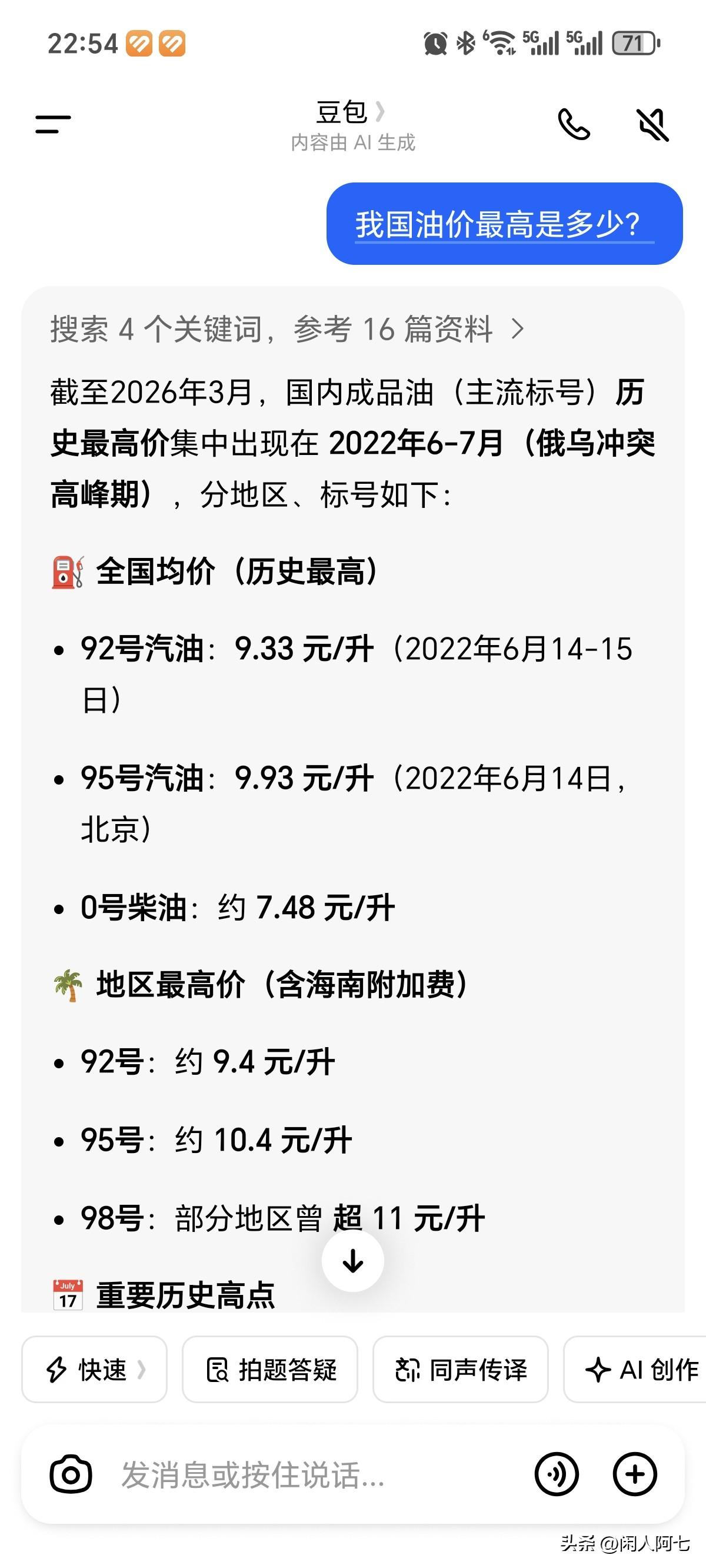 后天油价就要调整了,92号一下子涨了1块6,95号将近涨了1块7。又一下子回到9元时代! 我还问了下豆包,我国油价最贵是22年,也就比现在贵2毛钱。这个美伊以再打下去,油价见证10元时代了! 以后油车更卖不出去了,车子降价的速度没有油价涨价的速度快。 全球油价变天 油价调价时间表 油价调价时间表