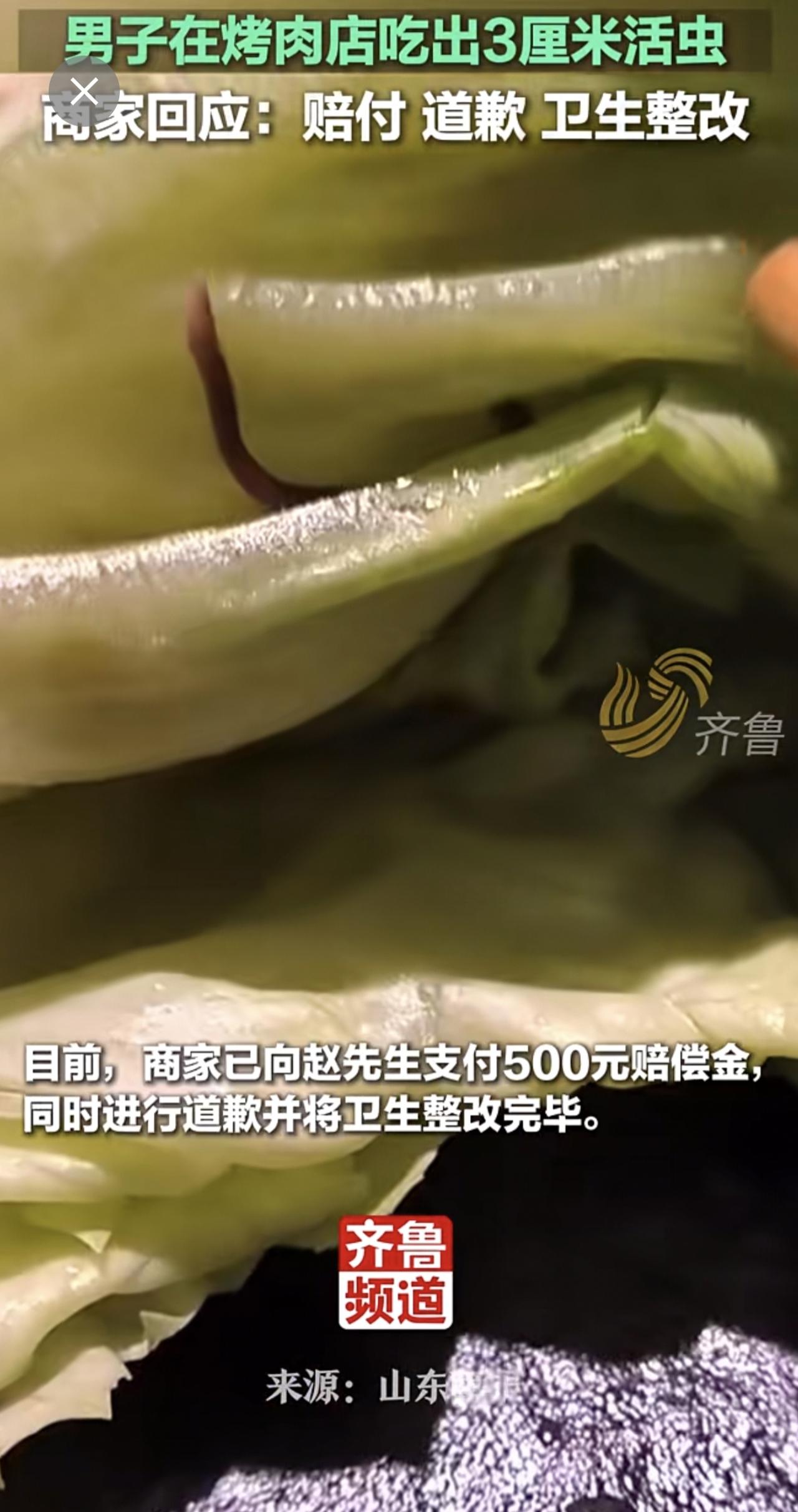 男子在烤肉店吃出3厘米活虫,商家回应:赔付,道歉,卫生整改!此前,有其他消费者反映该店生菜里有虫