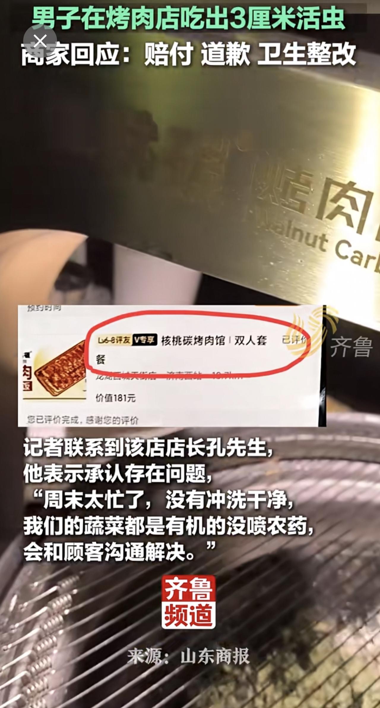 男子在烤肉店吃出3厘米活虫,商家回应:赔付,道歉,卫生整改!此前,有其他消费者反