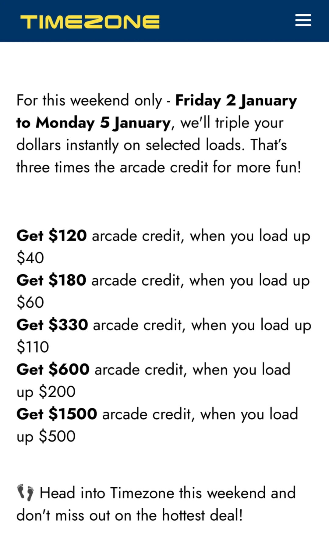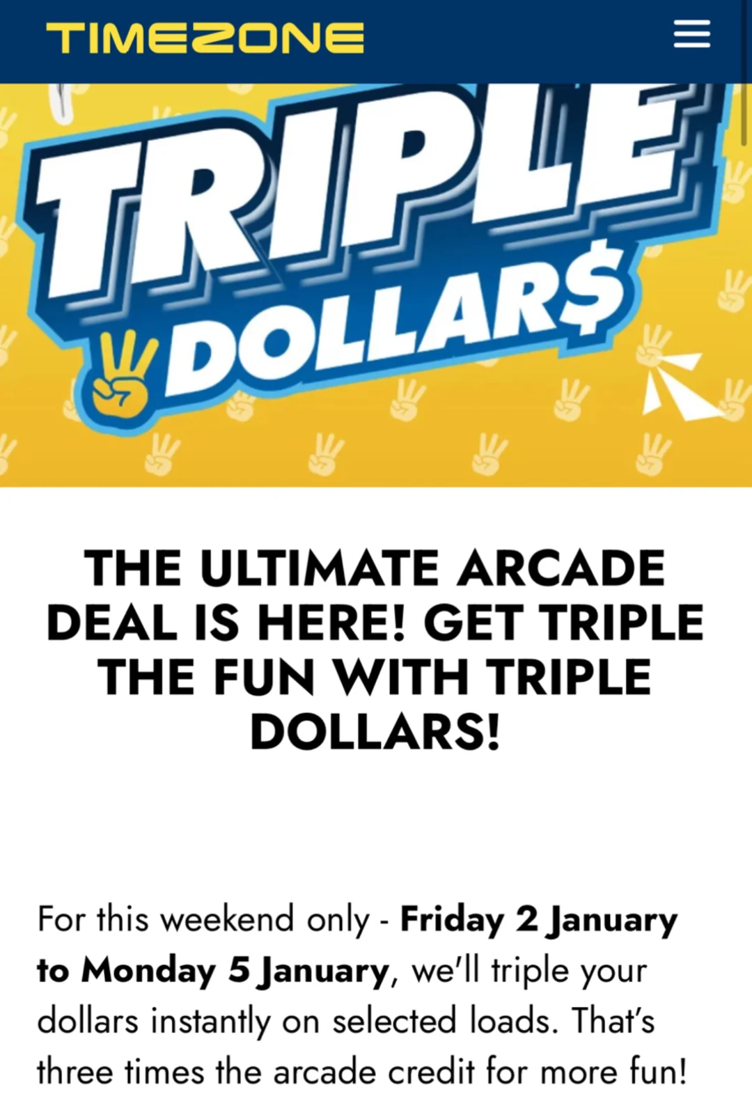 本周末的快乐是TimeZone给的!终极活动终于来了!🎉即日起到1月5日(周一),参与指定档位💸load up游戏币💰直接变3倍!等于用1块换3块的游戏积分!这优惠力度真的没谁了!🔥 ▫️💸$40 🉐$120 ▫️💸$60 🉐$180 ▫️💸 $110 🉐 $330 ▫️💸$200 🉐$600 ▫️充 $500 得 $1500 孩子们可以玩的尽兴了!!这波乐翻天了!! 关注我,下一篇更精彩