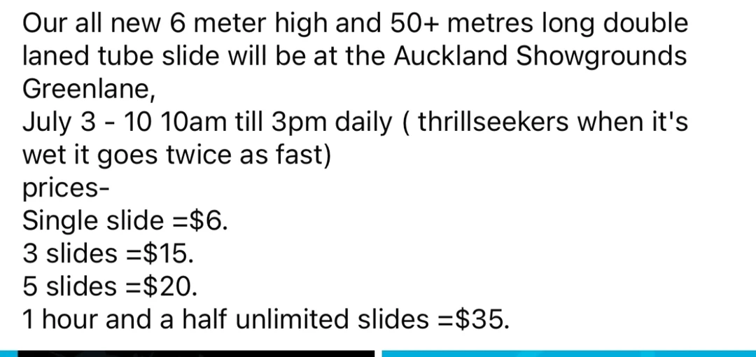 纽村即将到来的学生假期,不愁没地方遛娃了! 就在Auckland showground greenlane 全新打造了 6 米高、50 多米长的双道滑梯[超喜欢R][超喜欢R] 娃要疯狂了[捂脸R][捂脸R] 滑梯将于 7 月 3 日至 10 日每天上午 10 点至下午 3 点开放 冬天天气潮湿,滑行速度会快一倍,刺激感加倍![暗中观察R] 票价如下: 单次滑行:💰6 三次滑行:💰15 五次滑行:💰20 一个半小时内无限次滑行:💰35 遛娃走起! 关注我,下一篇