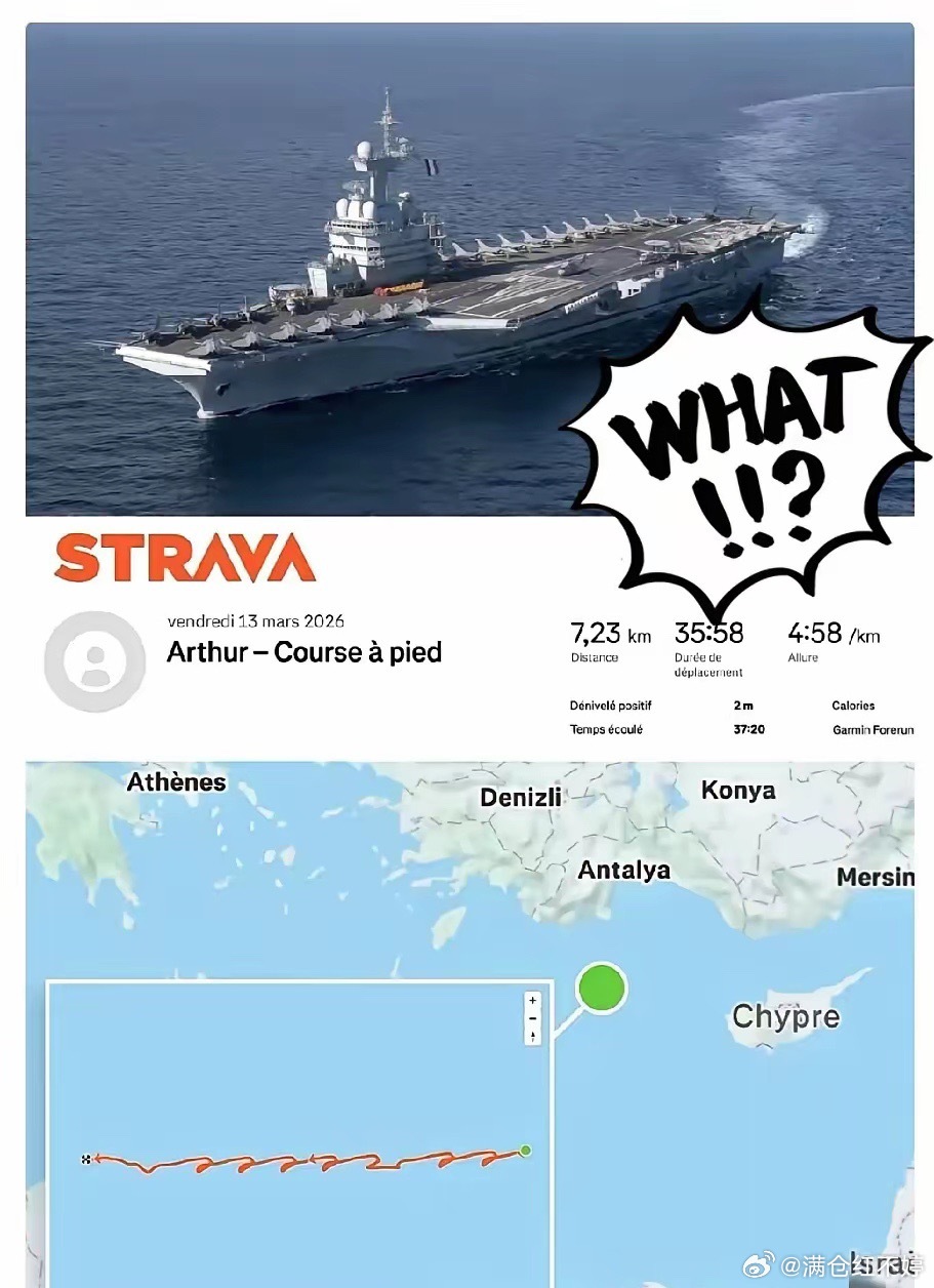 有人戏称,世界就是一个巨大的草台班子。据外媒报道,法国“戴高乐”号航母上一名年轻军官,在甲板上慢跑锻炼时,将运动数据同步至公开的Strava账号,意外引发军事机密泄露风波。