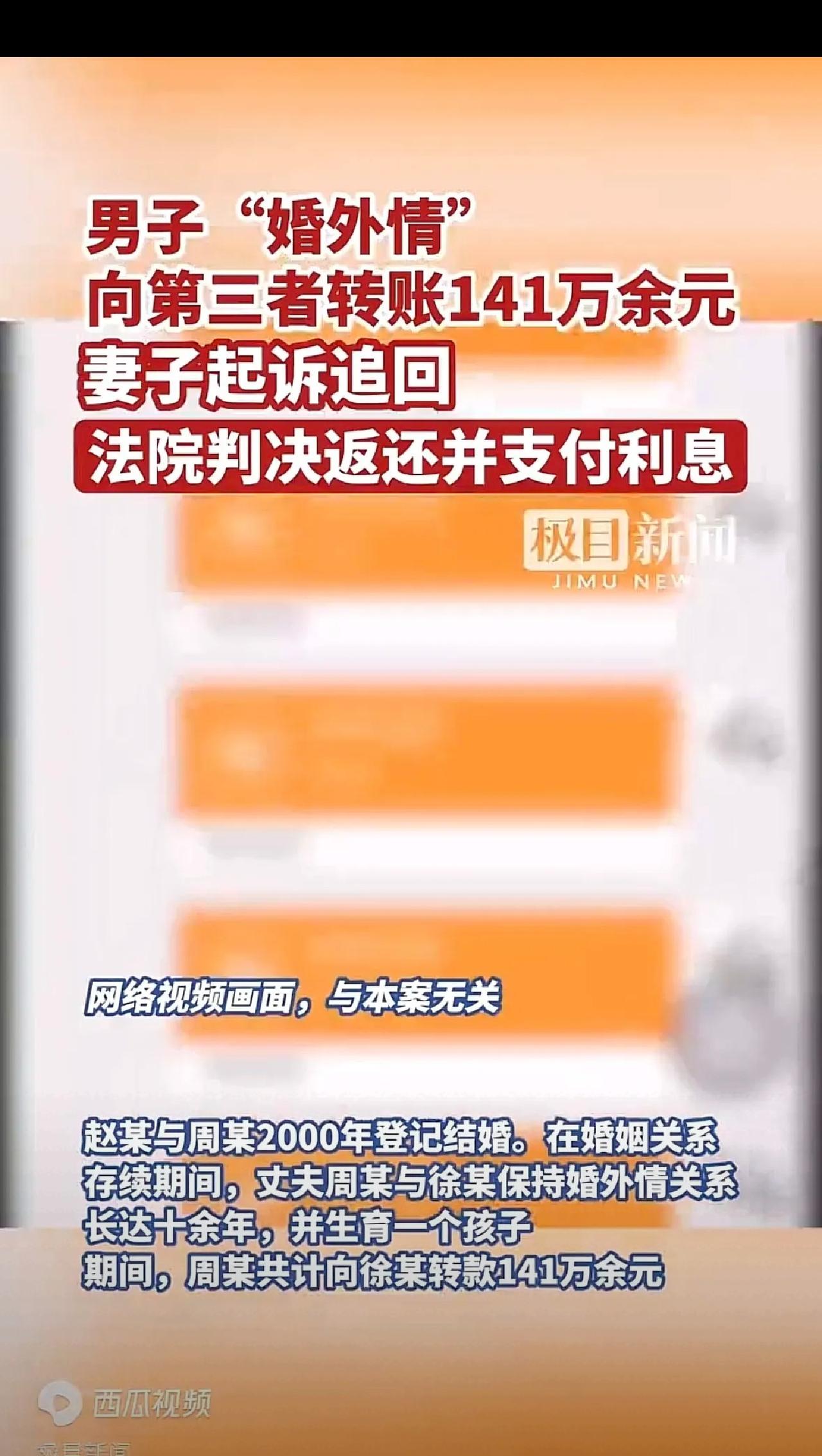 “白嫖成功?”湖北黄石,女子结婚24年,丈夫出轨10年,还和第三者生了个孩子,最让女子气愤的是,丈夫用夫妻共同财产给第三者陆续转了141万多,女子发现后,直接把第三者告上法院,要求全额返还这笔钱,并支付利息。第三者认为,这钱是给孩子的抚养费,而且用于双方共同生活了,不应该返还!结局让第三者傻眼了。 赵女士和老公周某2000年领证,踏踏实实过了24年,她一直以为自己的婚姻虽不轰轰烈烈,但也算安稳幸福。可她怎么也想不到,丈夫早就变心了,和小三徐某在一起整整10年,甚至连私生子都有了。 更过分的是,从2015年到2024年,周某瞒着她,一笔笔往徐某账户转钱,前前后后居然转了141万多!这些钱都是两人一起打拼、省吃俭用攒下的夫妻共同财产,是赵女士半辈子的心血,全被丈夫拿去养了外面的女人和孩子。 哪怕徐某后来零星转回37万,剩下的上百万,就这么被白白挥霍,换作任何一个女人,都咽不下这口气! 赵女士没有像很多人那样哭闹撒泼,而是保持了极致的清醒,直接收集证据把徐某告上法庭,要求她把钱全额返还,还要付利息。 结果小三徐某的操作,直接把人气笑了,法庭上不仅毫无愧疚,还振振有词地狡辩,甚至摆出一副受害者的样子: “这钱是孩子的抚养费,当爹的养孩子天经地义!” “钱都花在日常开销上了,早就没了,我没钱还!” “我陪了他10年,拿点钱补偿怎么了?” 这话一出,不光赵女士气炸,网友们更是直接炸锅,评论区吵翻了天,各种观点都有,看得人感同身受: 🔥网友1(共情原配):太心疼姐姐了,24年的青春和付出,换来这样的背叛,还好姐姐清醒,没跟渣男内耗! 🔥网友2(怒怼小三):当小三还有理了?破坏别人家庭,还想霸占原配的钱,真的刷新三观,抚养费找渣男要,别碰原配的一分钱! 🔥网友3(理性吐槽):最恶心的是这个丈夫,一边让老婆守家过日子,一边拿共同财产养小三,两头占便宜,太自私了! 🔥网友4(担心抚养费):其实私生子确实要养,但凭什么用夫妻共同财产?要给也是渣男自己掏私房钱,不能损害原配的利益! 作为旁观者,我真的越看越气愤,也特别想说说我的看法: 首先,出轨本身就是违背夫妻忠诚义务,突破道德底线的事,周某身为丈夫,瞒着妻子出轨10年,还私自处分大额共同财产,完全没有顾及多年夫妻情分,太不负责任。 其次,小三徐某的辩解完全站不住脚,别拿抚养费当“挡箭牌”!非婚生子女的抚养费,法律确实支持,但这笔钱只能用周某的个人财产支付,绝不能动赵女士的那份夫妻共同财产,这是两码事,不能混为一谈! 而且,这笔钱是赵女士和周某的共同财产,周某没经过妻子同意,私自转给外人,本身就不合规,更别说这种行为还违背公序良俗,于情于理于法,徐某都没有资格留着这笔钱。 本以为小三还能胡搅蛮缠下去,结果法院的判决,直接狠狠打了她的脸,让所有人都拍手称快! 法院明确判定:周某在婚姻存续期间,擅自将夫妻共同财产赠与婚外第三者,违背公序良俗,赠与行为全程无效!徐某必须扣除已转回的钱,把剩余款项全额返还给赵女士,还要支付资金占用期间的利息! 这就是法律的公平!《民法典》早就明确规定,违背公序良俗的民事法律行为无效,法律保护婚姻中无过错方的合法权益,绝不会让破坏婚姻、侵占财产的人得逞! 真的要为赵女士的清醒点赞,遭遇背叛后,不哭闹、不妥协,用法律武器维护自己的权益,这才是最正确的做法。也给所有婚内出轨的人、妄图当小三捞钱的人提个醒:别心存侥幸,不属于自己的钱,一分都别想拿,违背道德和法律,终究要付出代价! 💬大家觉得这个判决够不够解气?如果是你,会像赵女士一样理性维权吗?