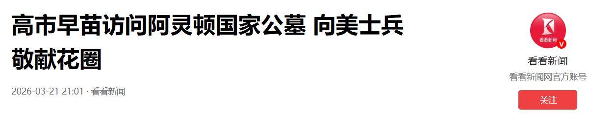 真让人大跌眼镜!日本政客高市早苗去美国,临走前竟干了件出格的事。   3月20日,高市早苗访美到了最后一站。她没选常规的外交辞行,而是直奔弗吉尼亚州的阿灵顿国家公墓。   在无名烈士墓前,她高调敬献花圈,现场还奏响了美日两国国歌,事后她还在社交平台上发文炫耀。   高市早苗是日本政坛出了名的保守派。此人长期在历史认知上大搞修正主义,平时把参拜靖国神社当政治秀。   现在却跑到昔日死敌的公墓前低头献花。这种做法简直滑天下之大稽。   明眼人一看便知,这根本不是为了和平,而是赤裸裸的政治献媚。当前美国新政府刚上台,美日同盟处于关键期。   高市早苗此举就是想向特朗普政府表忠心,急于给自己贴上亲美的标签。   她把历史当成了政治筹码。通过这种符号化的站队行为,她想换取美国新政府的信任,为个人政治前途铺路。   日美间的历史血债,在她眼里不过是换取安全和贸易支持的支持。   日本国内有些媒体还在拼命洗地。他们把这种谄媚行径包装成“令人钦佩的胸怀”,说这是超越历史恩怨的和平姿态,这种说辞纯属自欺欺人,刻意回避了日美曾惨烈交战的历史真相。   日本右翼过去总拿参拜靖国神社挑衅国际社会,如今却用向美军致敬来打造“和平主义者”人设。   这套反向操作,根本掩盖不了他们骨子里的军国主义残余。   不知二战中丧生的日本士兵及家属会怎么想。高市早苗在投下原子弹的美军墓前肃立,这对日本自身的战争牺牲者而言,无疑是历史性背叛。   这种单向致敬,狠狠打了日本右翼自己的脸,这出戏背后藏着更大的地缘野心,当前日美正加速军事一体化,日本国内也在疯狂推进修宪扩军。   高市早苗急着向美国新政府释放信号,证明日本保守派是美国最听话的战略打手。   她试图用“日美命运与共”的叙事洗脑民众,为日本军事正常化找借口。   通过消解日美历史冲突记忆,日本右翼想彻底解开和平宪法枷锁,这种危险行为,值得整个亚太地区高度警惕,靠出卖历史尊严换来的同盟注定脆弱。