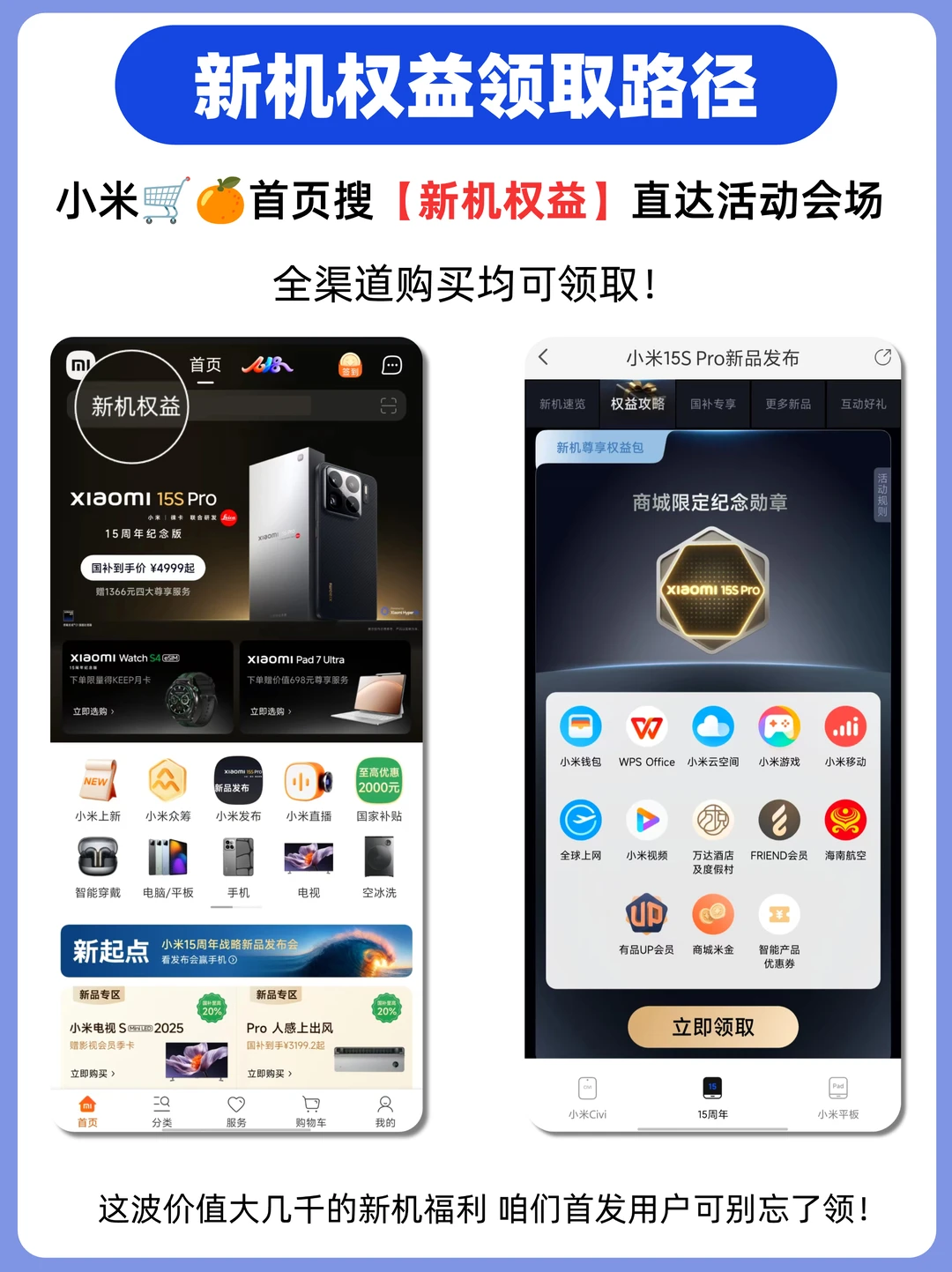 新机权益:激活后,打开小米🛒🍊,搜索【新机权益】,即可领取小米云空间5折优惠券/WPS会员/小米商城会员/小米有品会员等权益