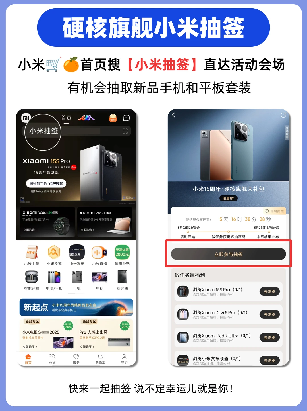 抽签盛宴:参与小米抽签活动!在小米🛒🍊首页搜索【小米抽签】,就有机会抽取新品手机和平板套装,说不定幸运儿就是你!