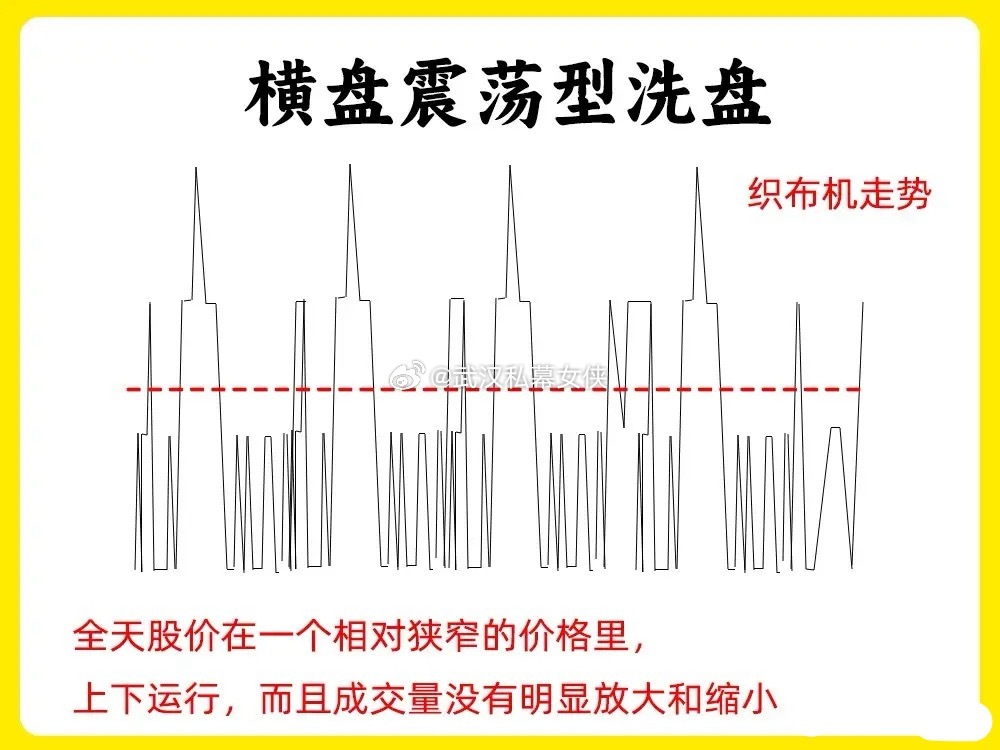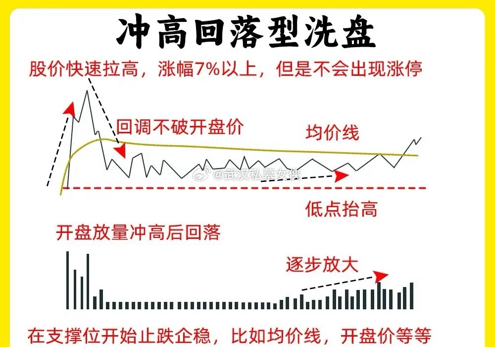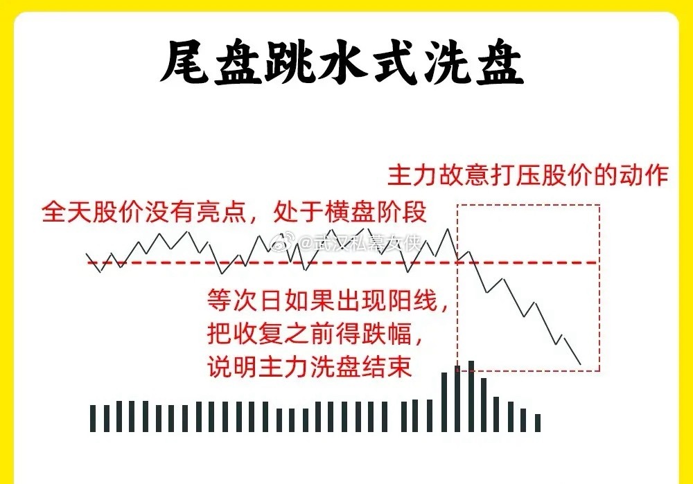 注意了!大部分散户在判断主力洗盘和出货,往往是大家最难分辨的。尤其是分时洗盘,分时图又是我们绕不开的试图。女侠分享六种分时洗盘形态,建议认真看完还是老规矩,点赞收藏或评论六六六支持一下,女侠每天分享炒股干货,以免以后想温习找不到了一、冲高回落型洗盘在分时图里,股价在盘中出现大幅拉升,上涨幅度7%左右,主力故意不封板,随后股价开始回调。等到收盘的时候,一般是平盘、小涨收盘。这属于主力强势洗盘,我们需要注意两个细节,一个股价洗盘的位置,和股价冲高以后回调,成交量是否缩量二、上涨趋势强势洗盘在分时图里,股价处于上涨趋势里,突然股价开始大幅下跌,当时没有多少成交量,随后有开始止跌反弹向上,放出成交量,突破前期高点,这是主力边拉边洗的走势,我们需要注意,股价快速下跌成交量。整个分时图里,均价线一直处于向上三、波段式洗盘分时图里,股价先上涨,再下跌,再上涨,在下跌,整个过程里,股价低点在不断的抬高,整体的涨幅却不是很大。散户在里面就比较难受,这是主力用时间来换空间,清洗不坚定的筹码四、尾盘跳水式洗盘全天走势一般,处于一个横盘震荡的走势,等到尾盘突然大幅下跌,一般会超过3%但是呢,整个下跌过程里,成交量并没有放大,等到收盘就形成十字星或是长影线K线。五、炸板分时洗盘股价在分时图里,出现涨停,随后开始炸板回调,当时下跌的幅度不大,随后在封板,出现多次的炸板。所以就会导致换手率变大,这是主力手法,一般这种洗盘方法会在,一进二的阶段,已经出现首板涨停六、横盘震荡型洗盘全天窄幅震荡,织布机走势,这个盘面,看着很无趣。成交量出现缩量,主力已经锁仓,这种横盘缩量的走势很磨心态好了!以上就是分时图的六种洗盘形态。