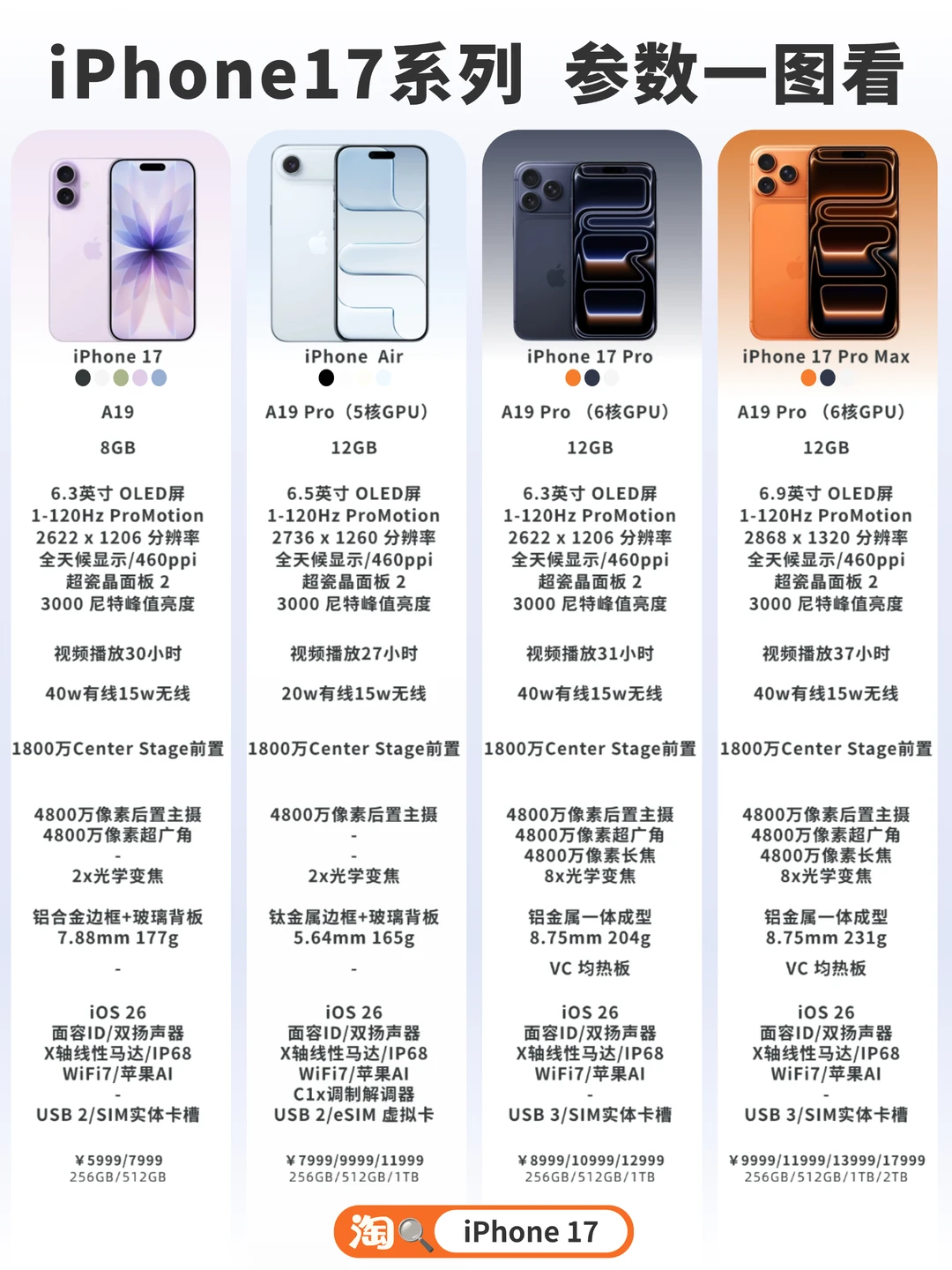 ✅️iPhone17 Pro系列: A19Pro芯片、18MP前置镜头、48MP长焦、支持8X变焦、铝金属一体成型机身、VC均热版、40W快充