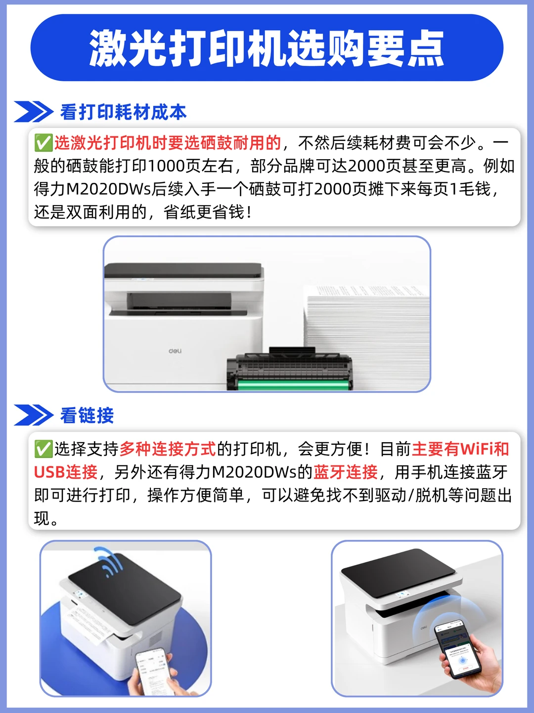 支持多种连接方式的打印机,会更方便!目前主要有WiFi和USB连接,另外还有得力M2020DWs的蓝牙连接,用手机连接蓝牙即可进行打印,操作方便简单,可以避免找不到驱动/脱机等问题出现。