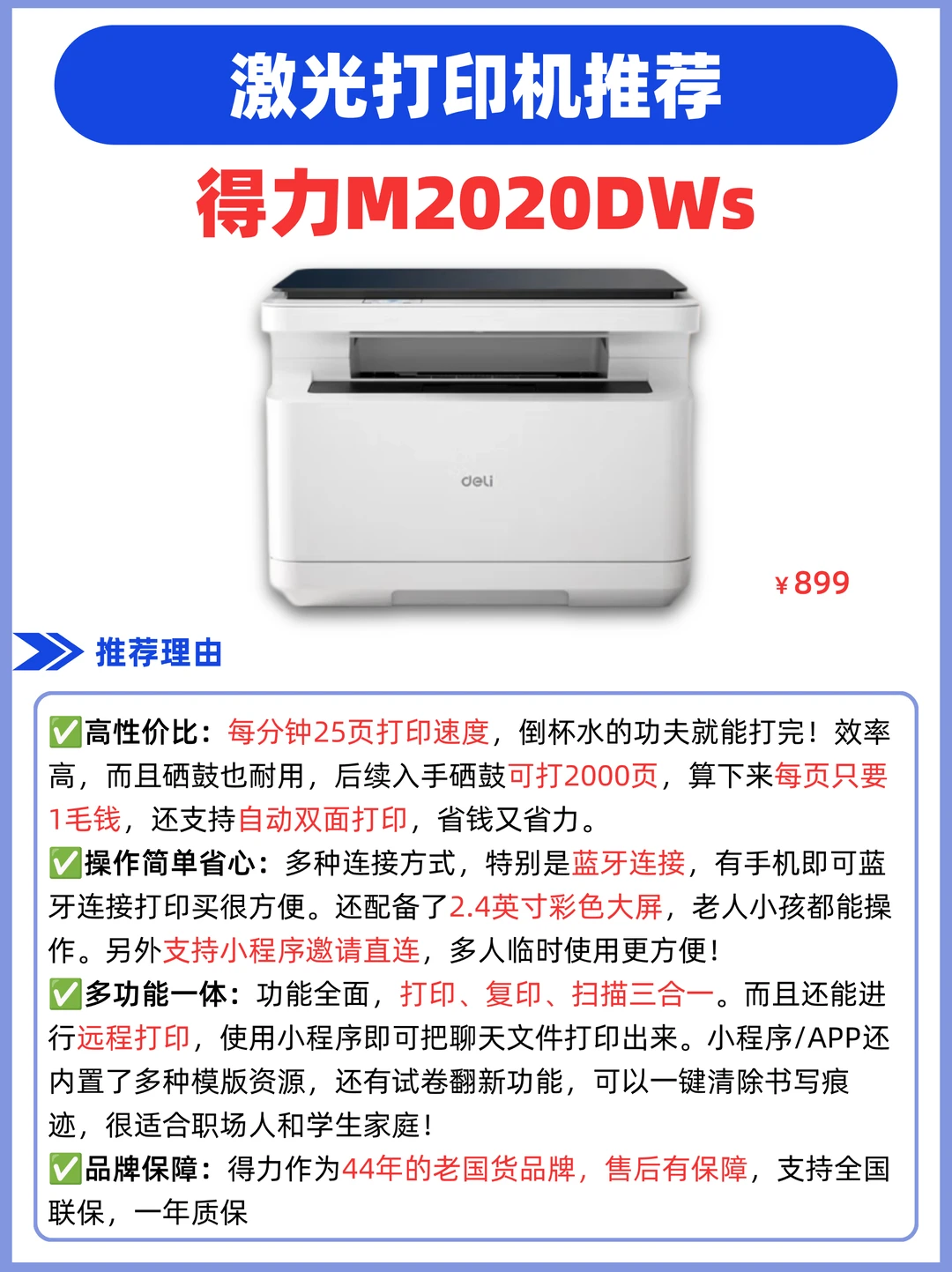 ✨️最后选择入手了得力M2020DWs,整体配置更符合我的需求,性价比高操作也简单~