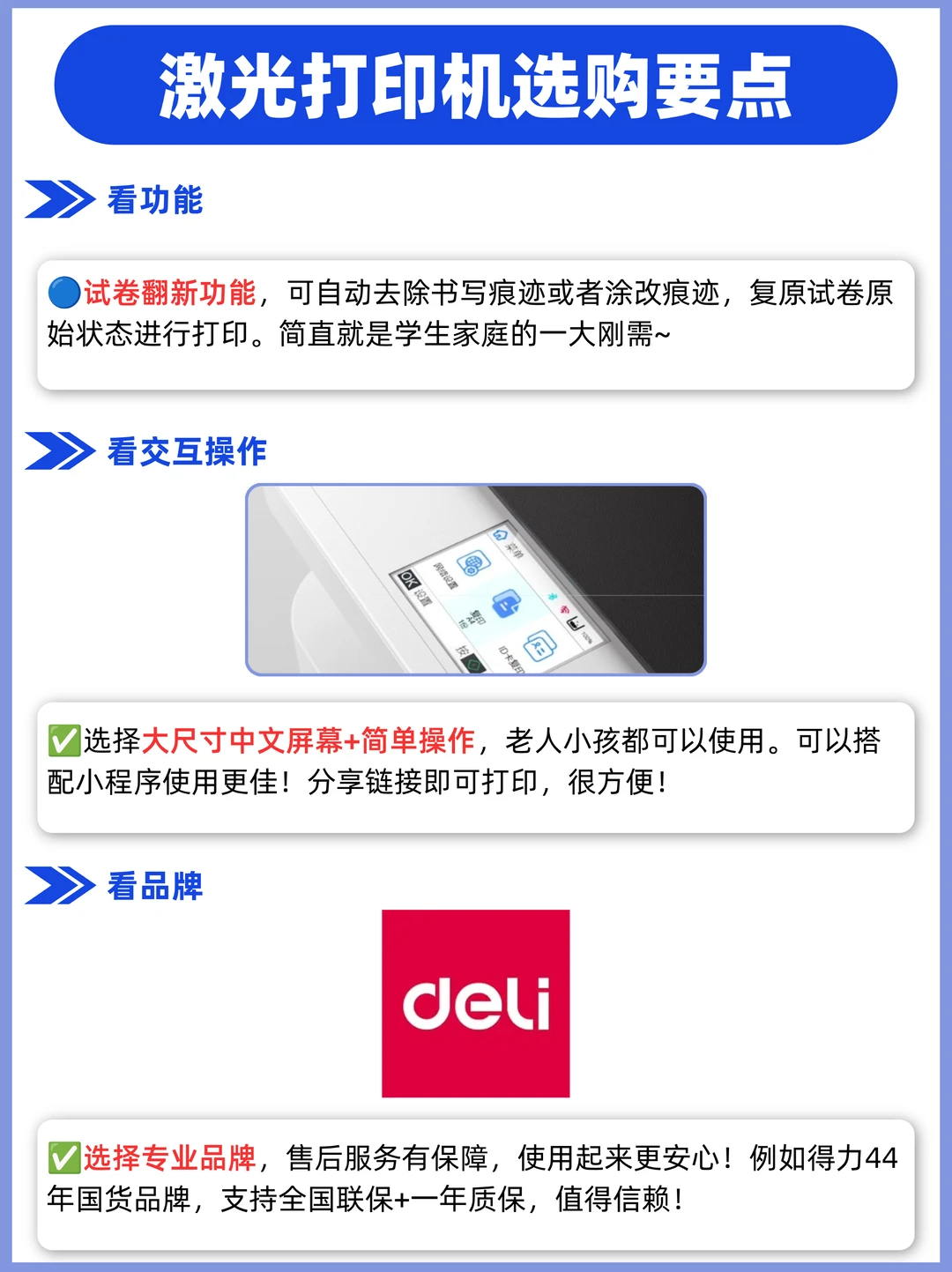 选择带有打印+复印+扫描一体的机型!一机搞定所有!远程功能也重要,避免来回折腾!手机操作即可实现远程打印。学生家庭注意有无试卷翻新功能,可以直接消除书写痕迹进行打印,错题巩固很方便!这些功能的得力M2020DWs全都有,需要的宝子可以看看喔。