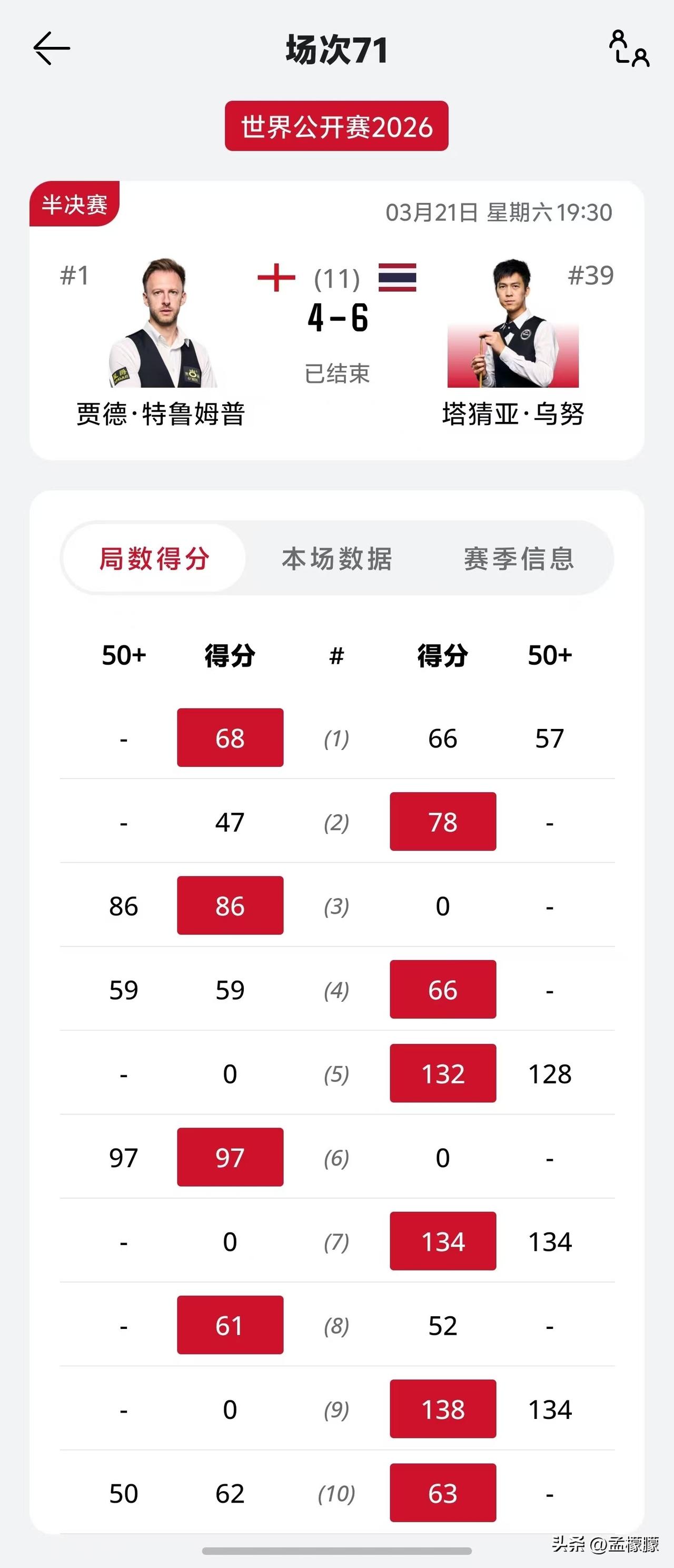 2026斯诺克世界公开赛|小特特鲁姆普 4-6不敌泰国塔猜亚,无缘决赛。 北京时间3月21日19:30,2026中国江西•玉山斯诺克世界公开赛第二场半决赛比赛开始进行。 排名世界第一的小特贾德特鲁姆普 对阵泰国快枪手塔猜亚,小特发挥有点不好,4-4后塔猜亚率先拿到赛点。塔猜亚5-4。 第十局,非常喜剧,塔猜亚清彩阶段,没有打进简单粉球;双方56:56。小特无意打进了粉球,但没有叫到黑球。最后塔猜亚打进远台黑球,63:62拿下第十局,总比分6-4战胜小特,晋级决赛。 决赛对阵火箭奥沙利文 。 玉山斯诺克比赛 斯诺克