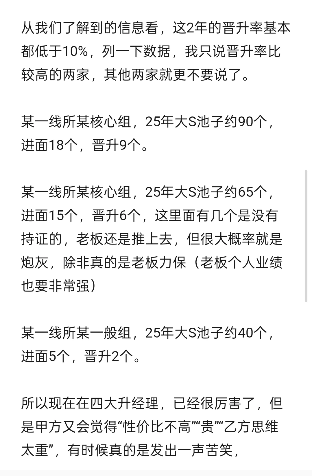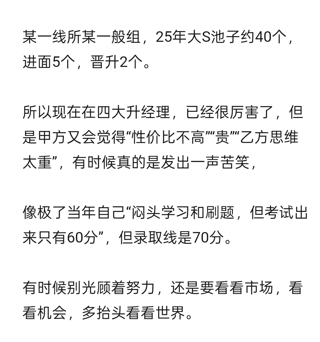 某一线所某核心组,25年大S池子约65个,进面15个,晋升6个,这里面有几个是没有持证的,老板还是推上去,但很大概率就是炮灰,除非真的是老板力保(老板个人业绩也要非常强)